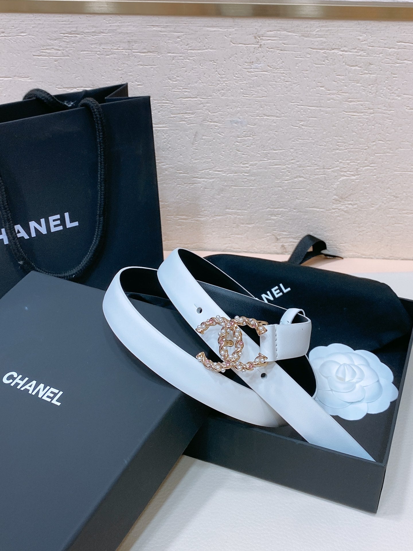 CC BELT 20MM IN WHITE CALFSKIN GOLD HARDWARE ATTACH PEARLS