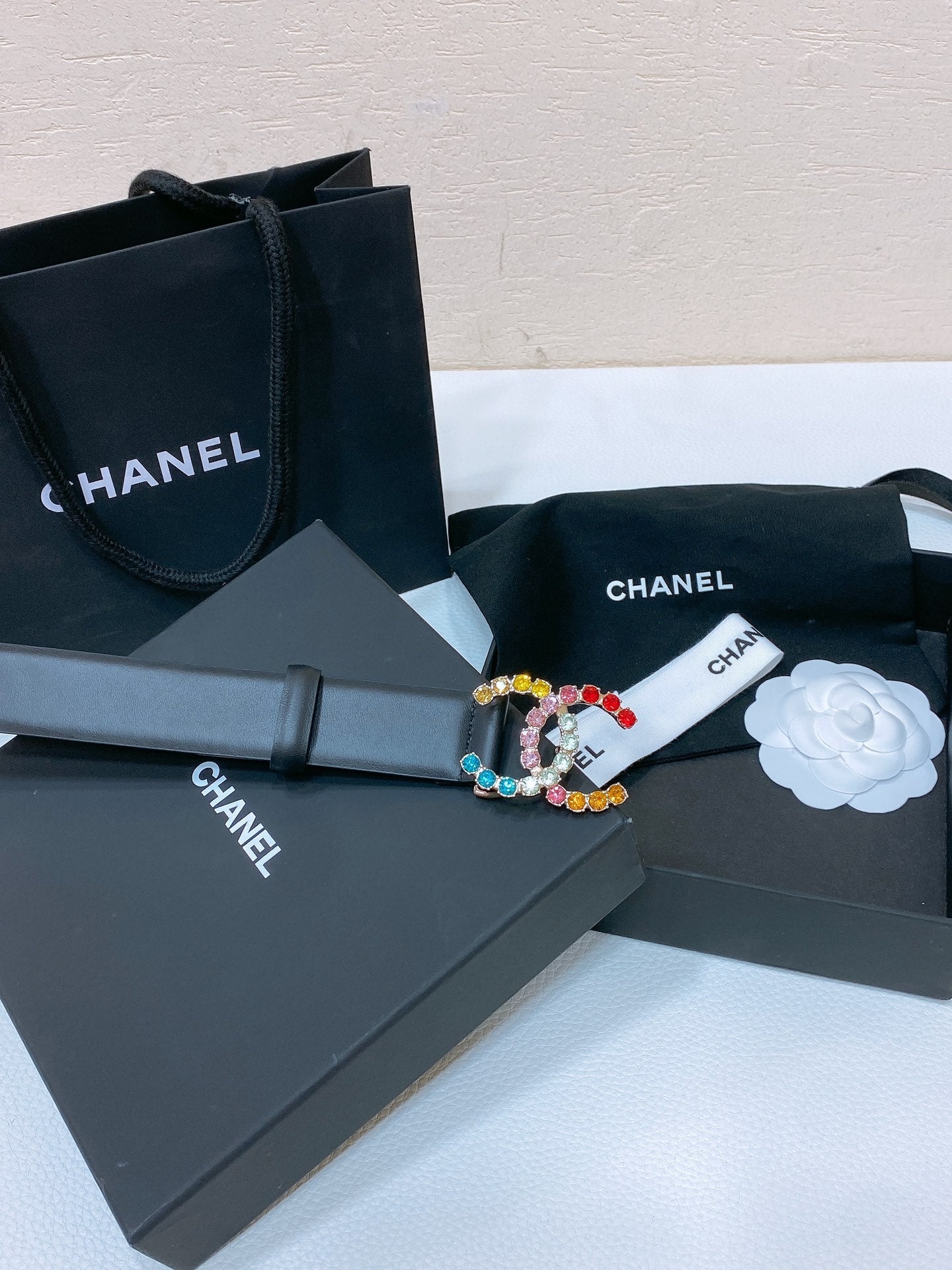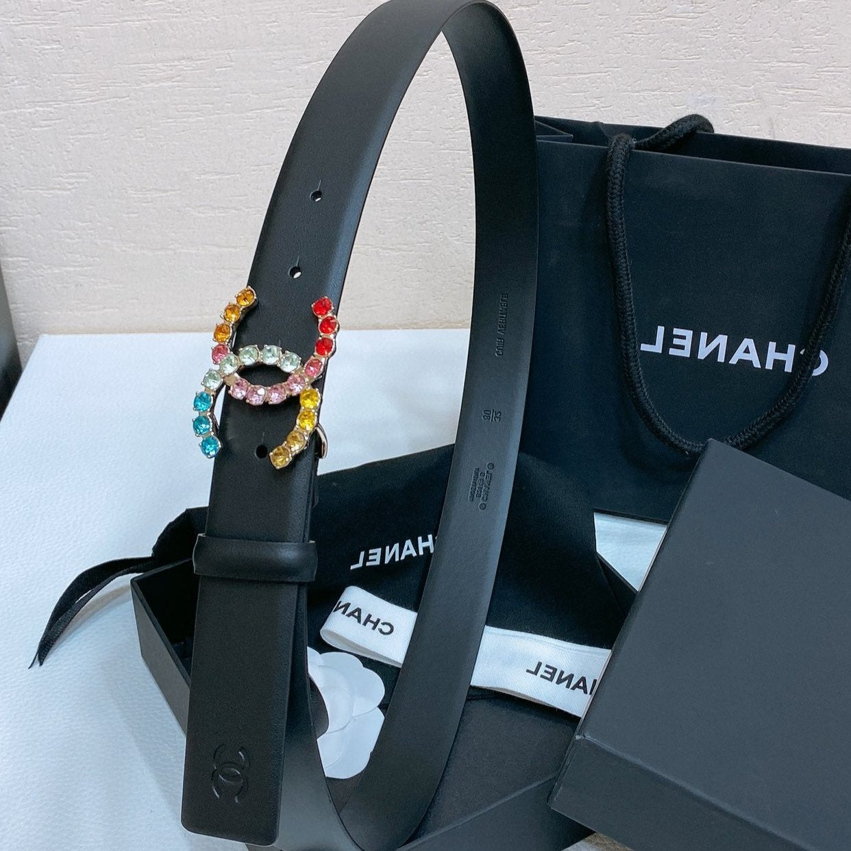CC BELT 30 MM IN BLACK CALFSKIN WITH COLORFUL RHINSTONES METAL LOGO