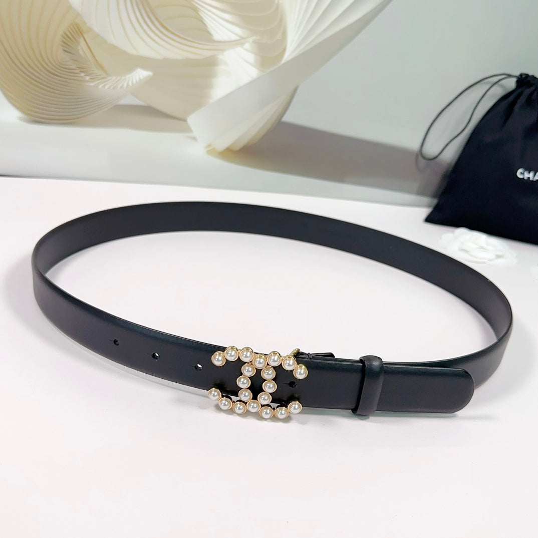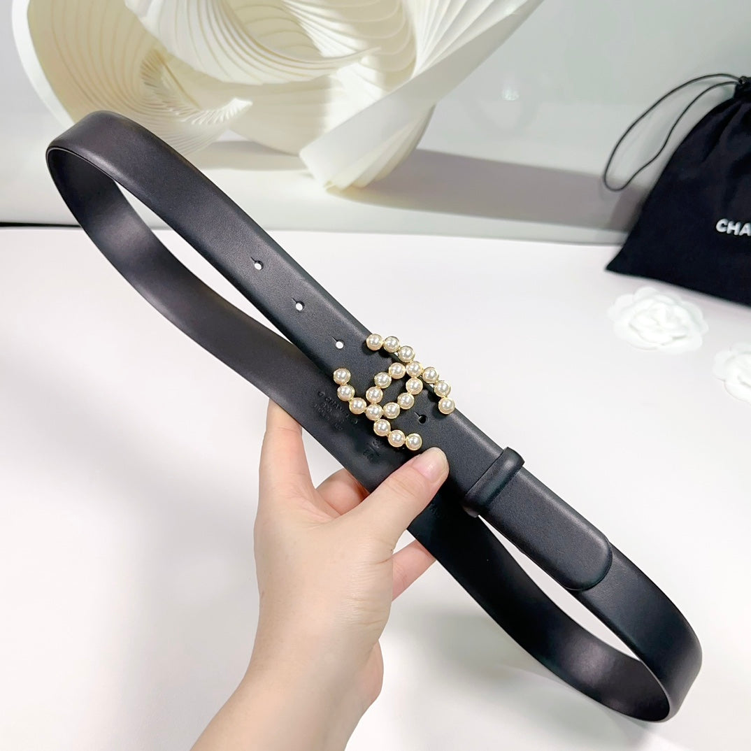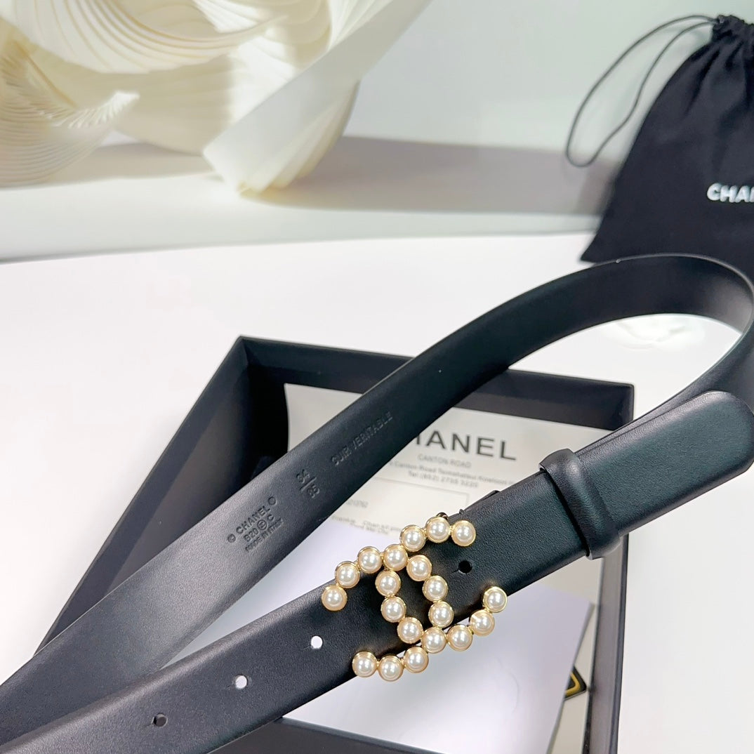 CC BELT 30 MM IN BLACK SMOOTH CALFSKIN WITH GOLD HARDWARE ATTACH PEARL