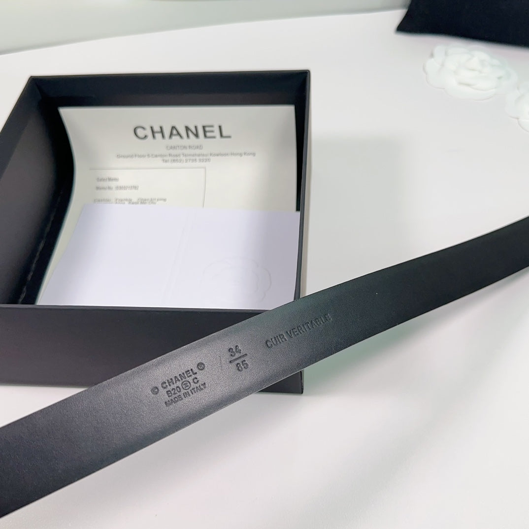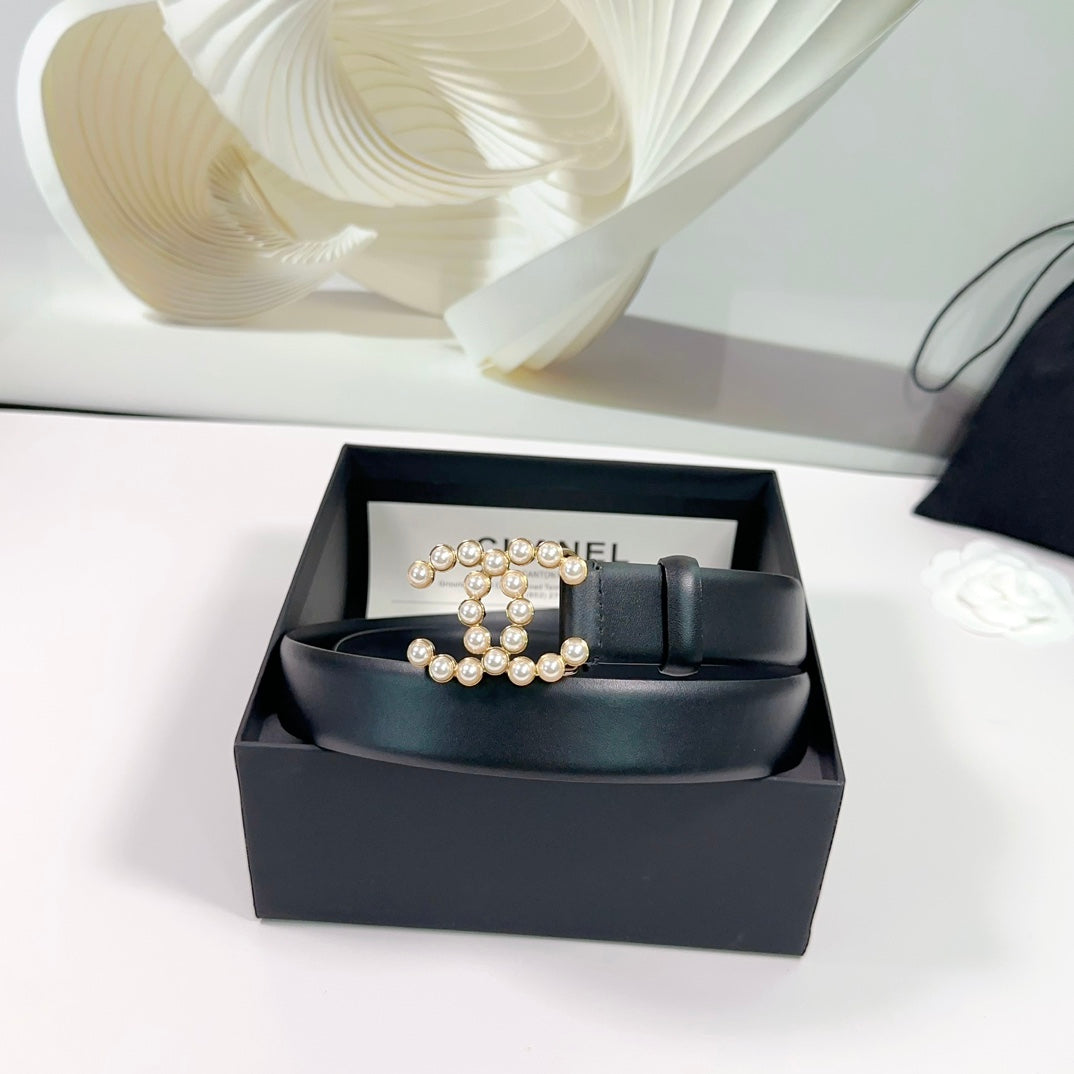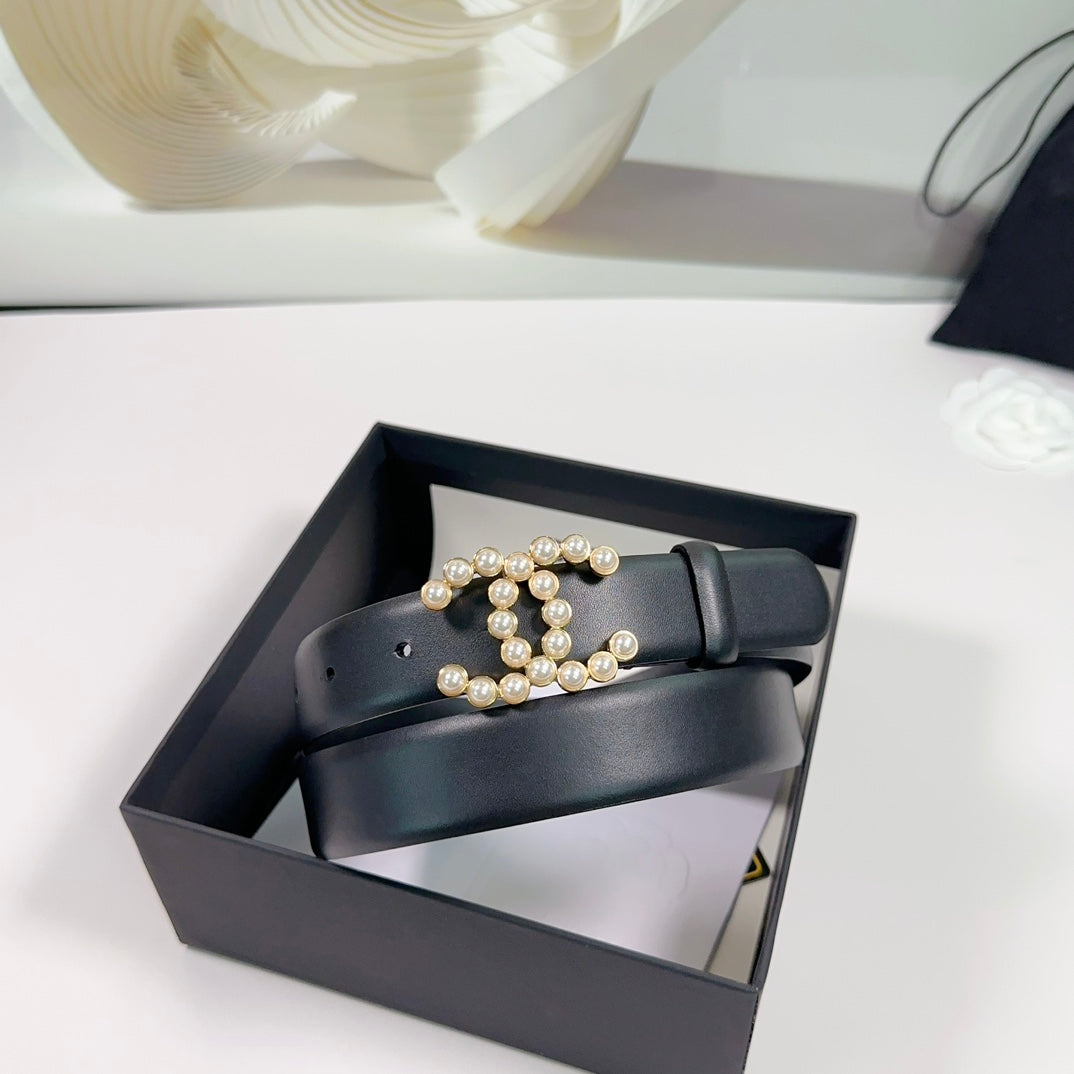 CC BELT 30 MM IN BLACK SMOOTH CALFSKIN WITH GOLD HARDWARE ATTACH PEARL