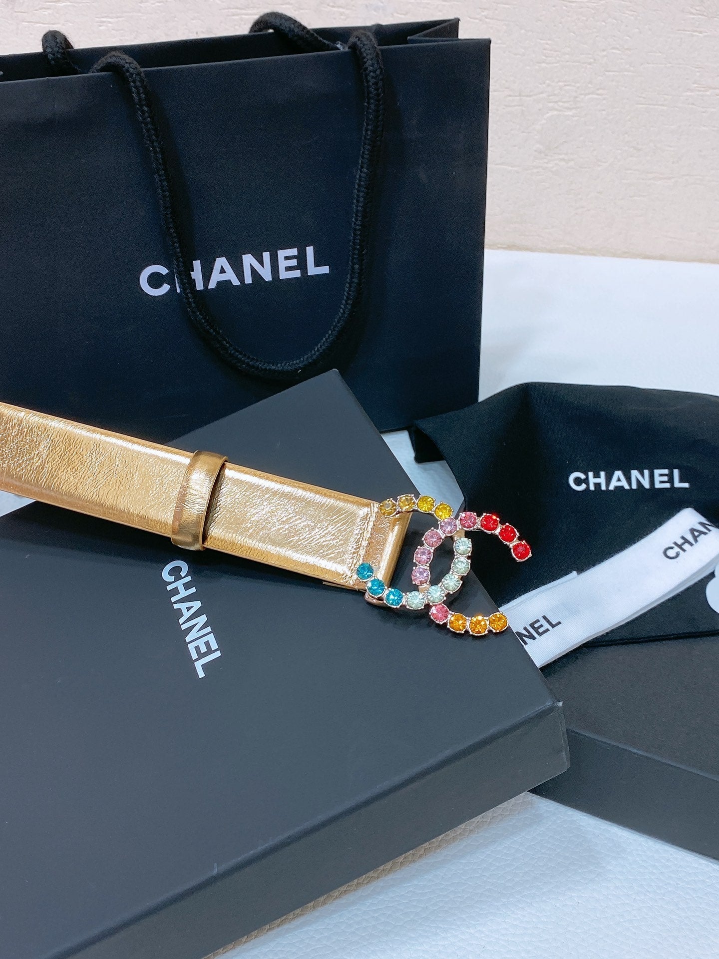 CC BELT 30 MM IN GOLD CALFSKIN WITH COLORFUL RHINSTONES METAL LOGO