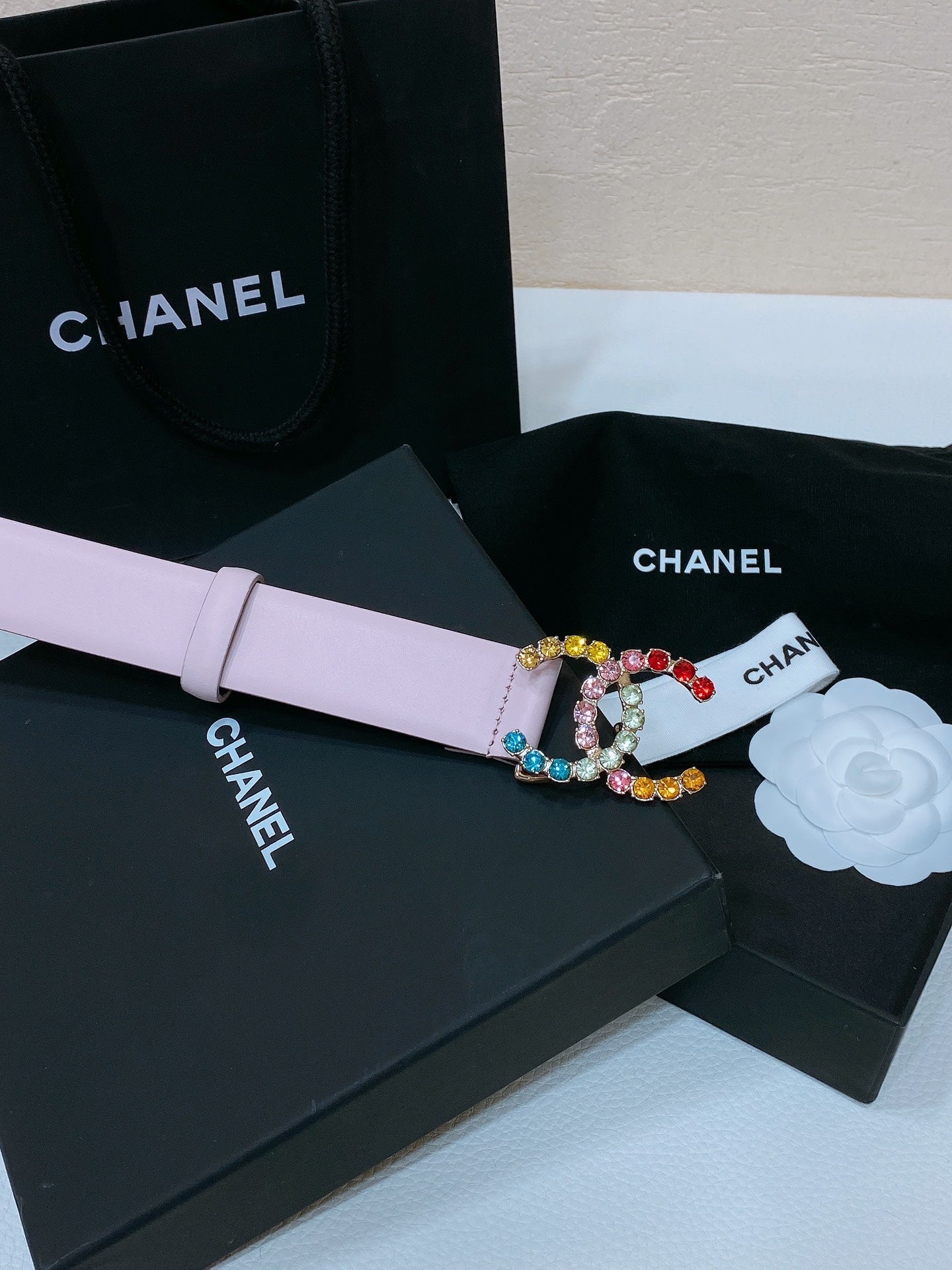CC BELT 30 MM IN PASTEL PINK CALFSKIN WITH COLORFUL RHINSTONES METAL LOGO