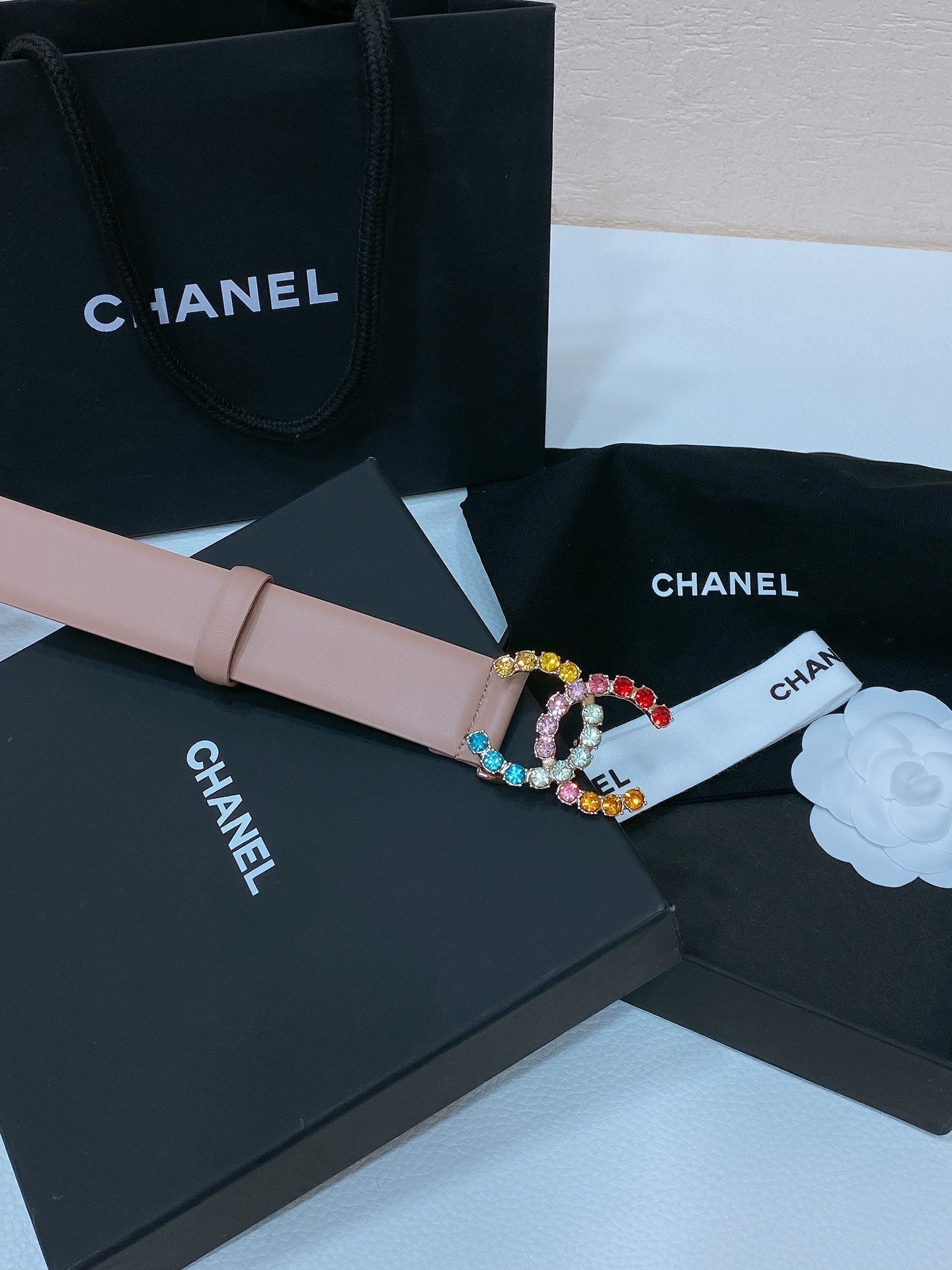 CC BELT 30 MM IN PEACHY PINK CALFSKIN WITH COLORFUL RHINSTONES METAL LOGO