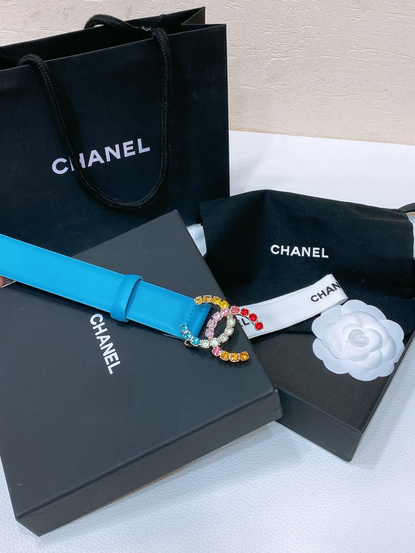 CC BELT 30 MM IN SKY BLUE CALFSKIN WITH COLORFUL RHINSTONES METAL LOGO