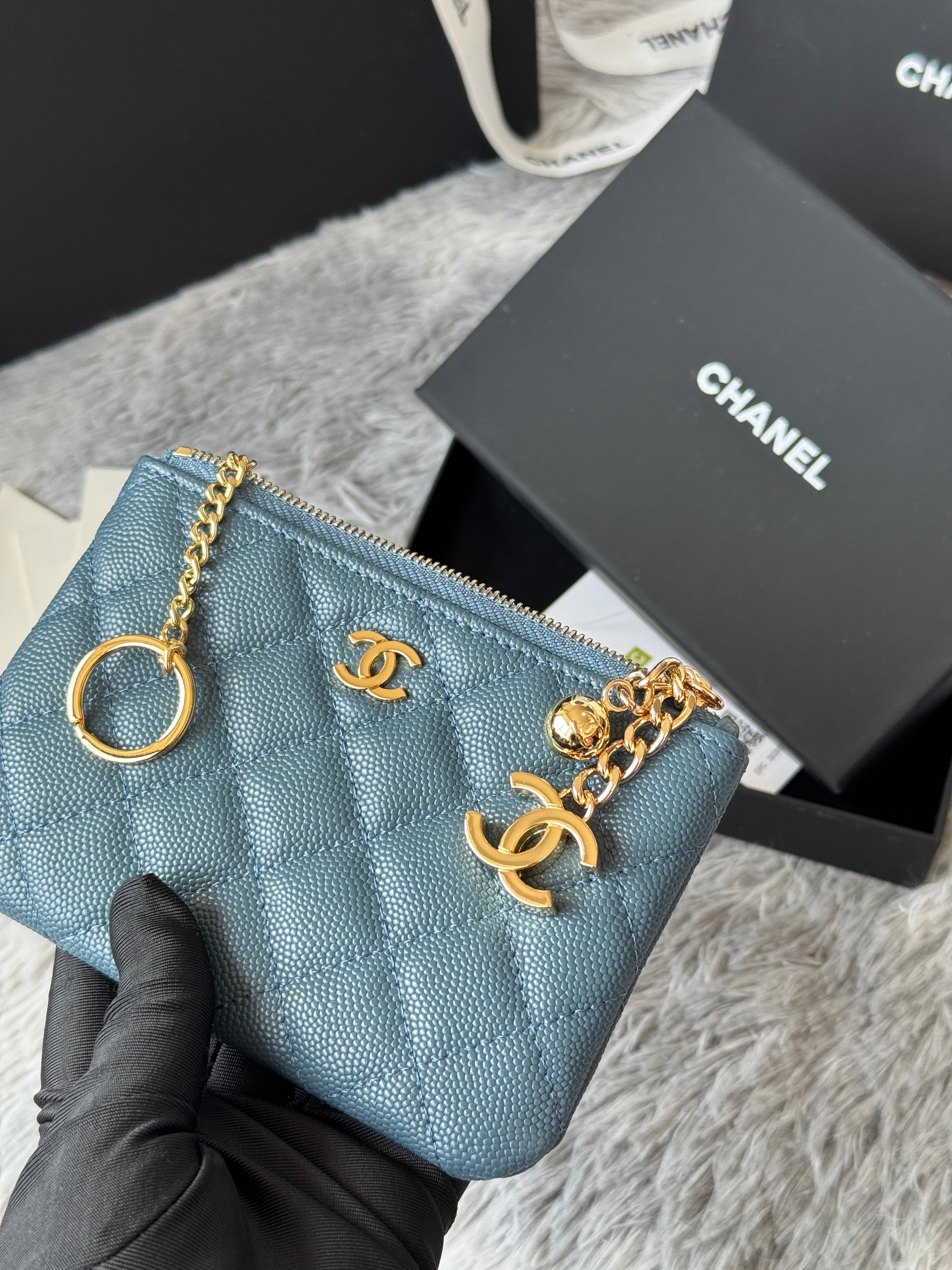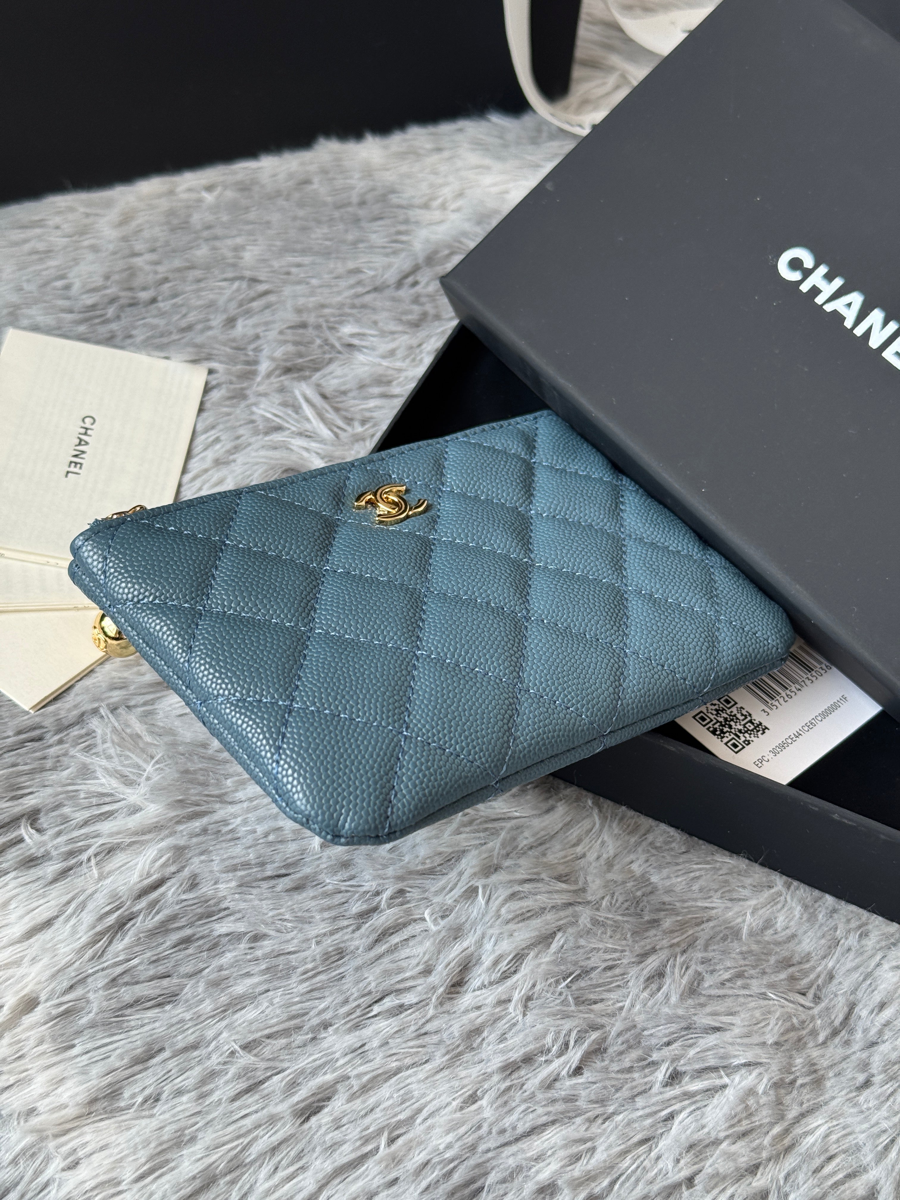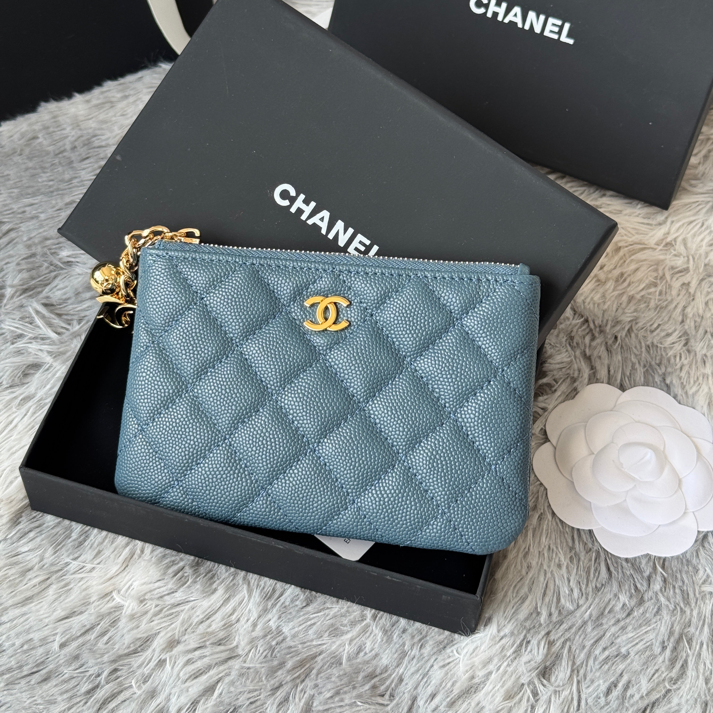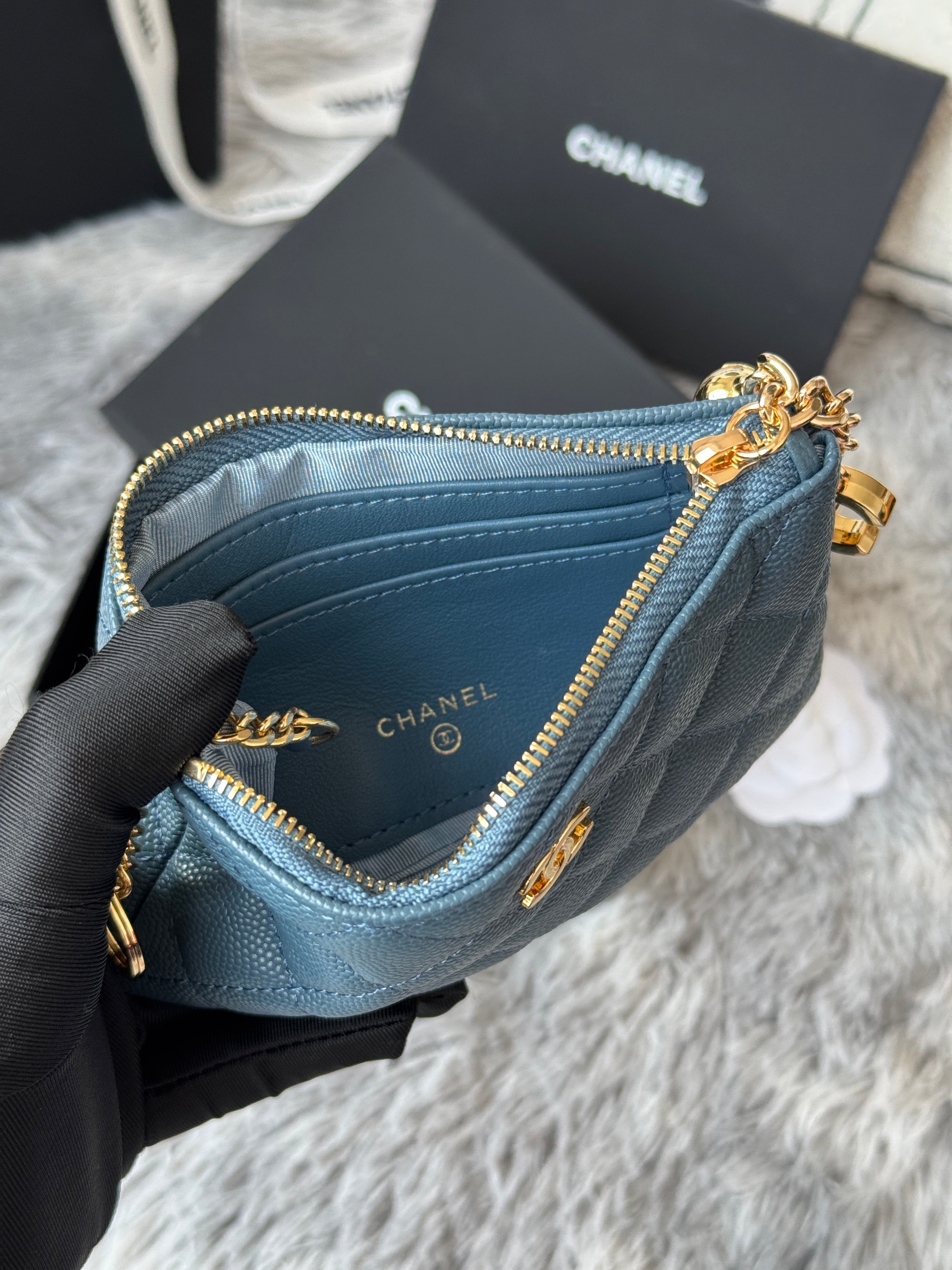 CC CLASSIC ZIPPED POUCH 14 IN NEPAL BLUE GRAINED CALFSKIN GOLD-TONE CHARM CHAIN