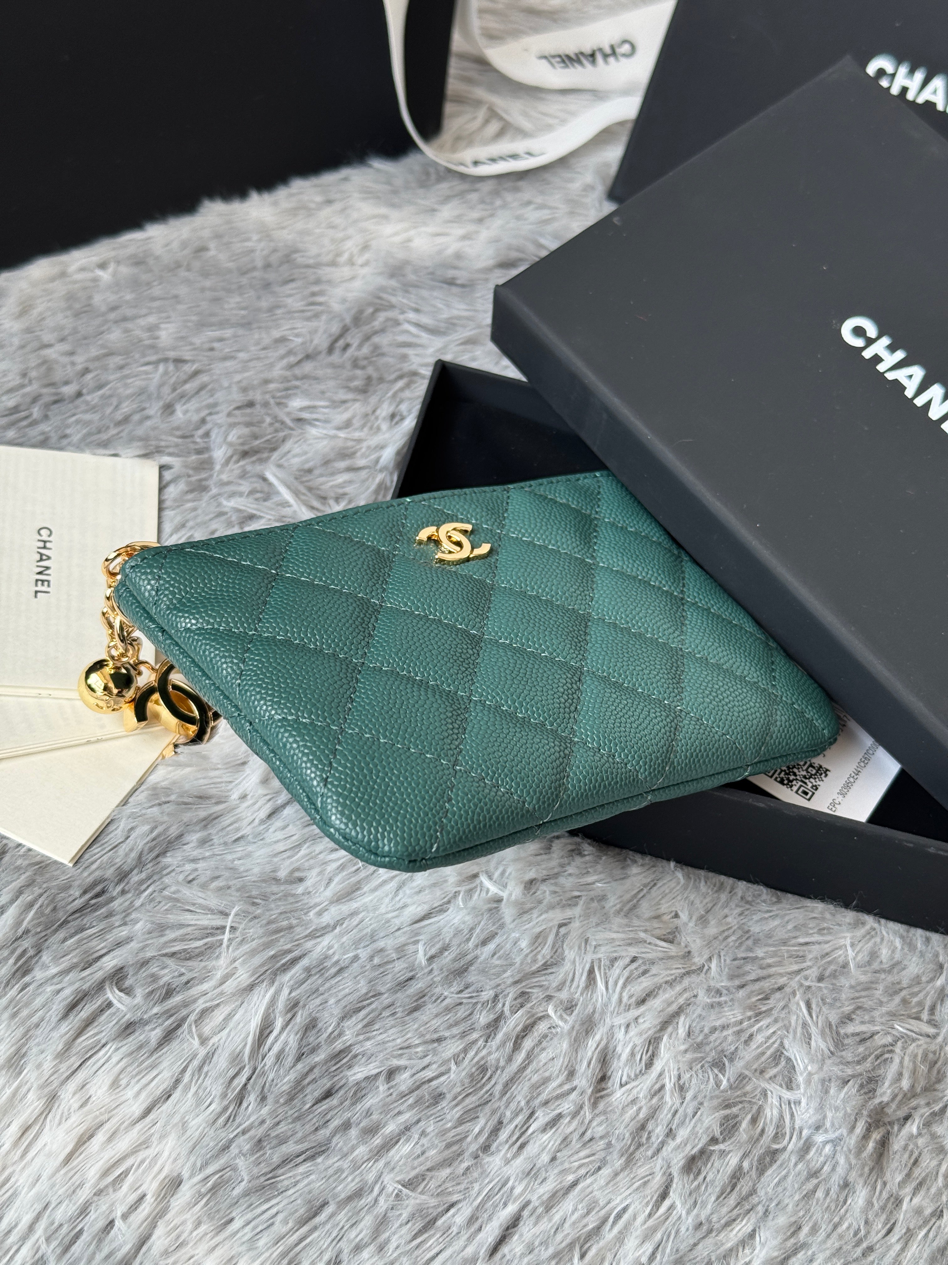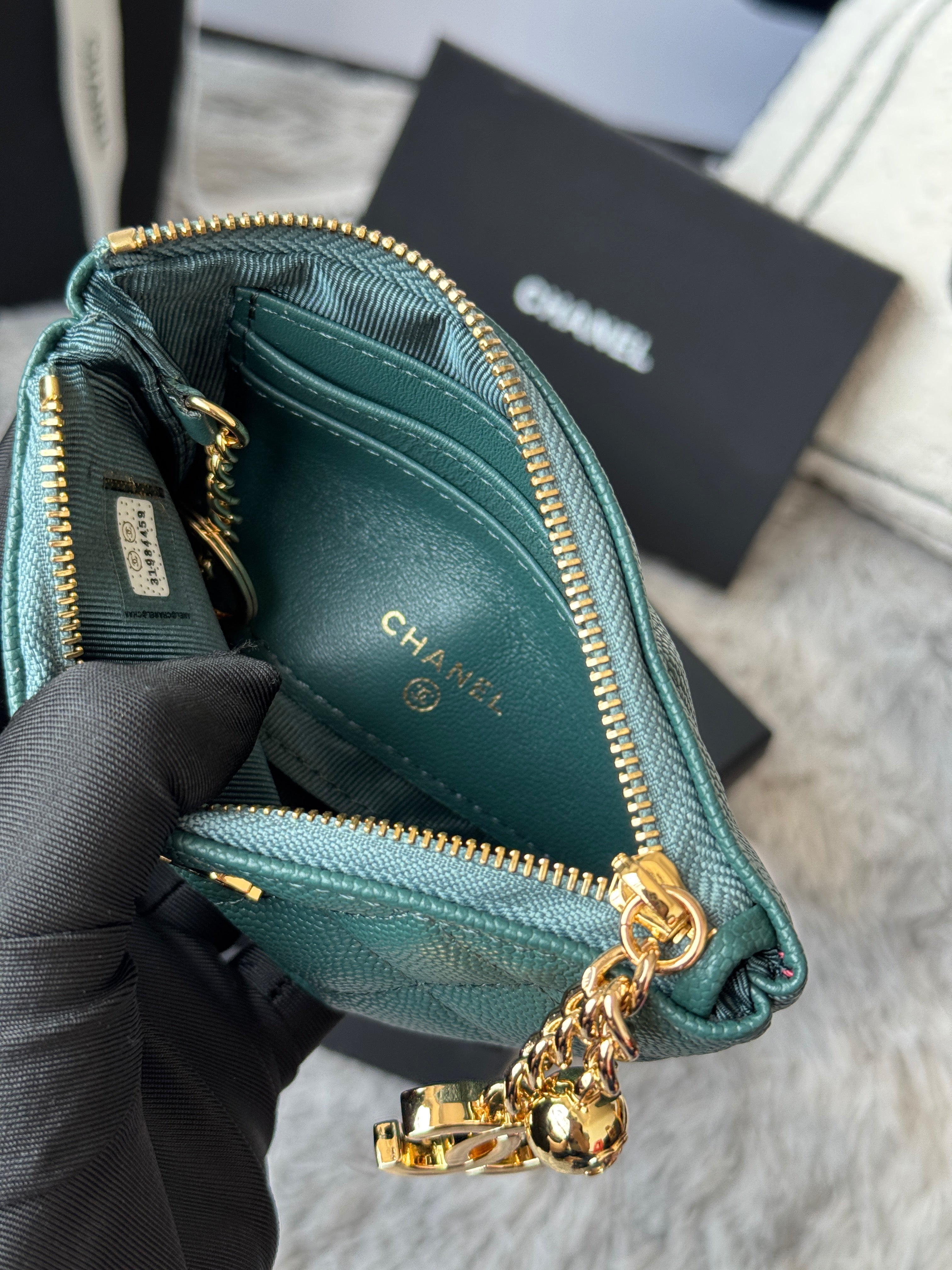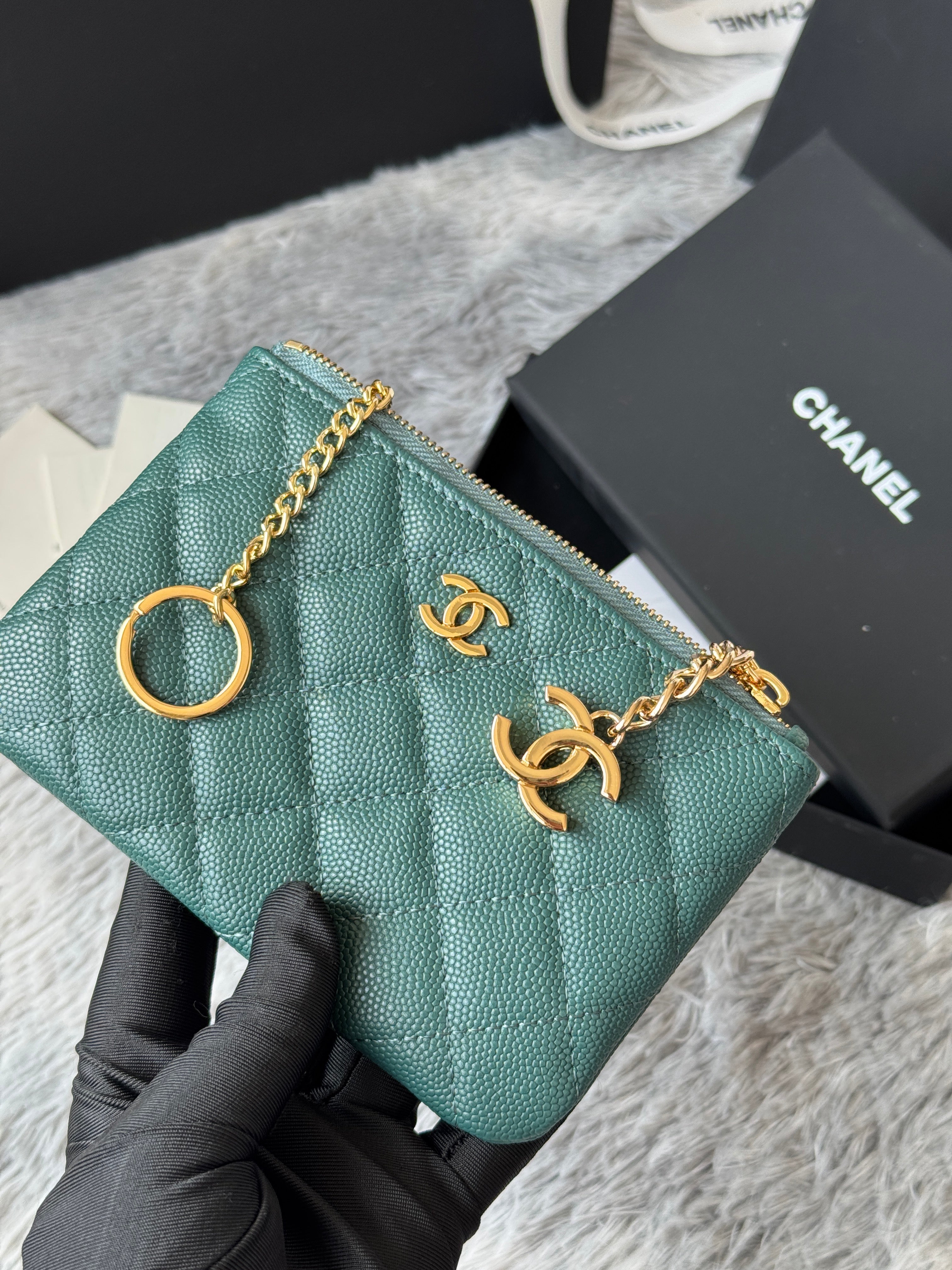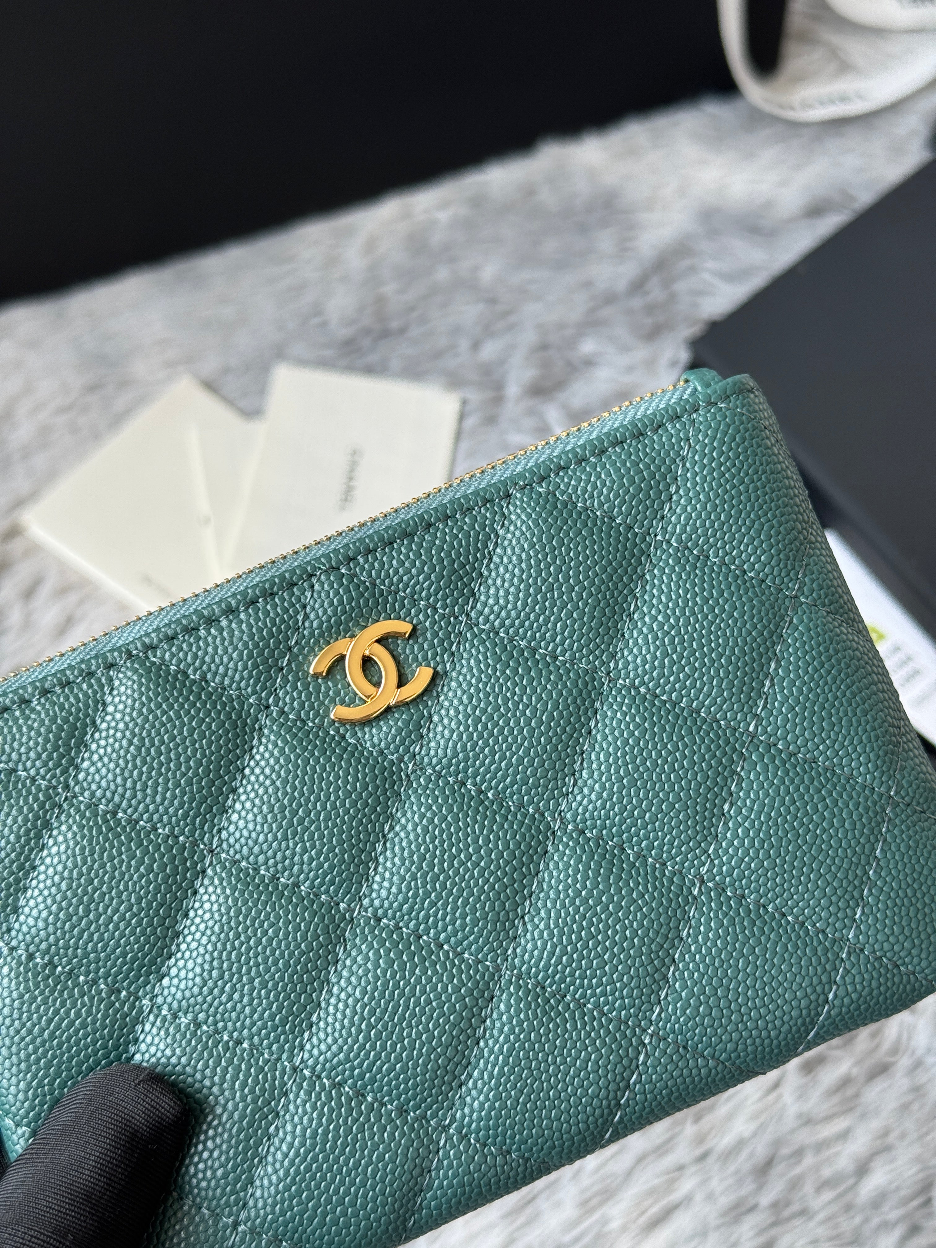 CC CLASSIC ZIPPED POUCH 14 IN NEPTUNE GREEN GRAINED CALFSKIN GOLD-TONE CHARM CHAIN