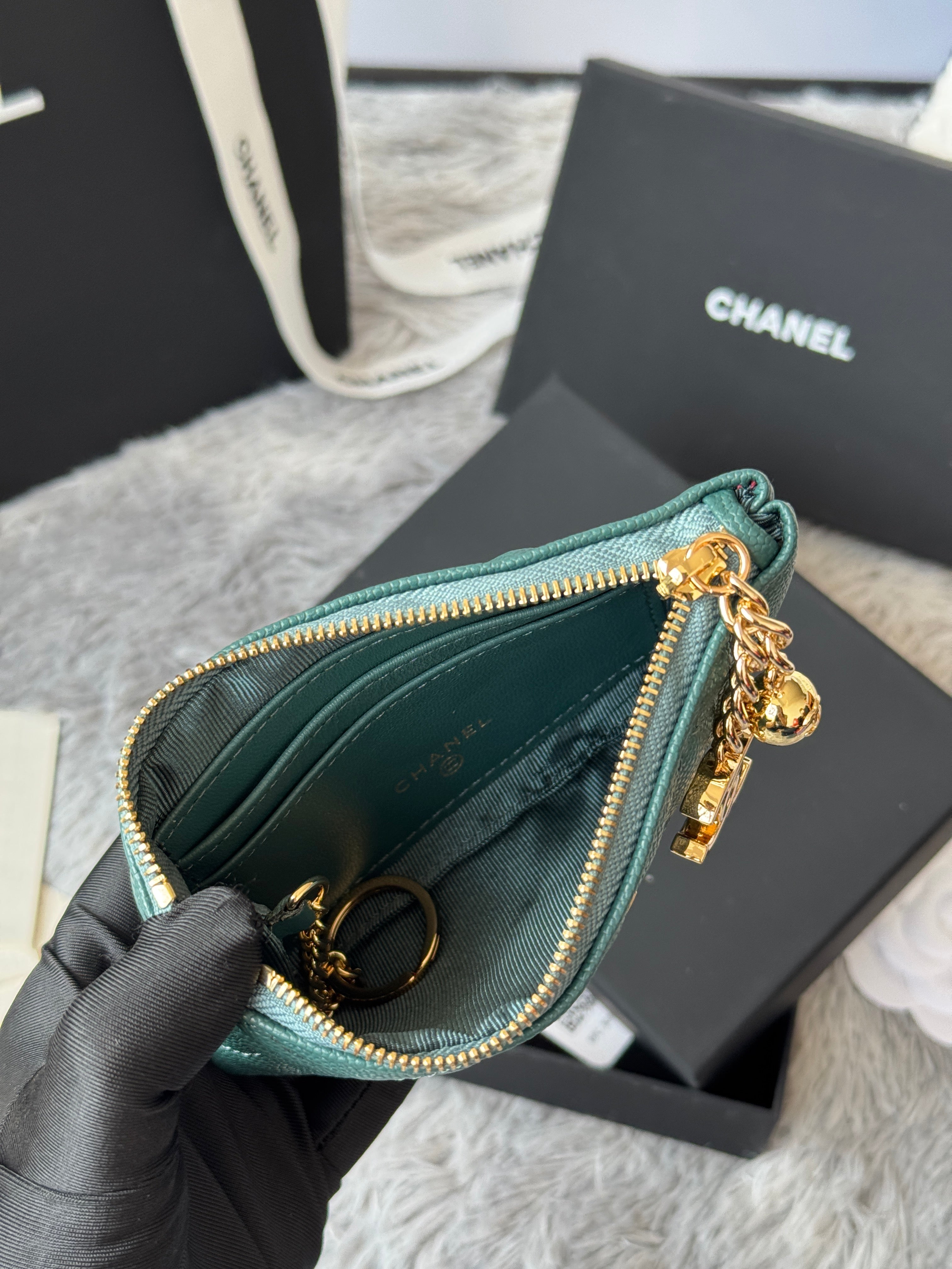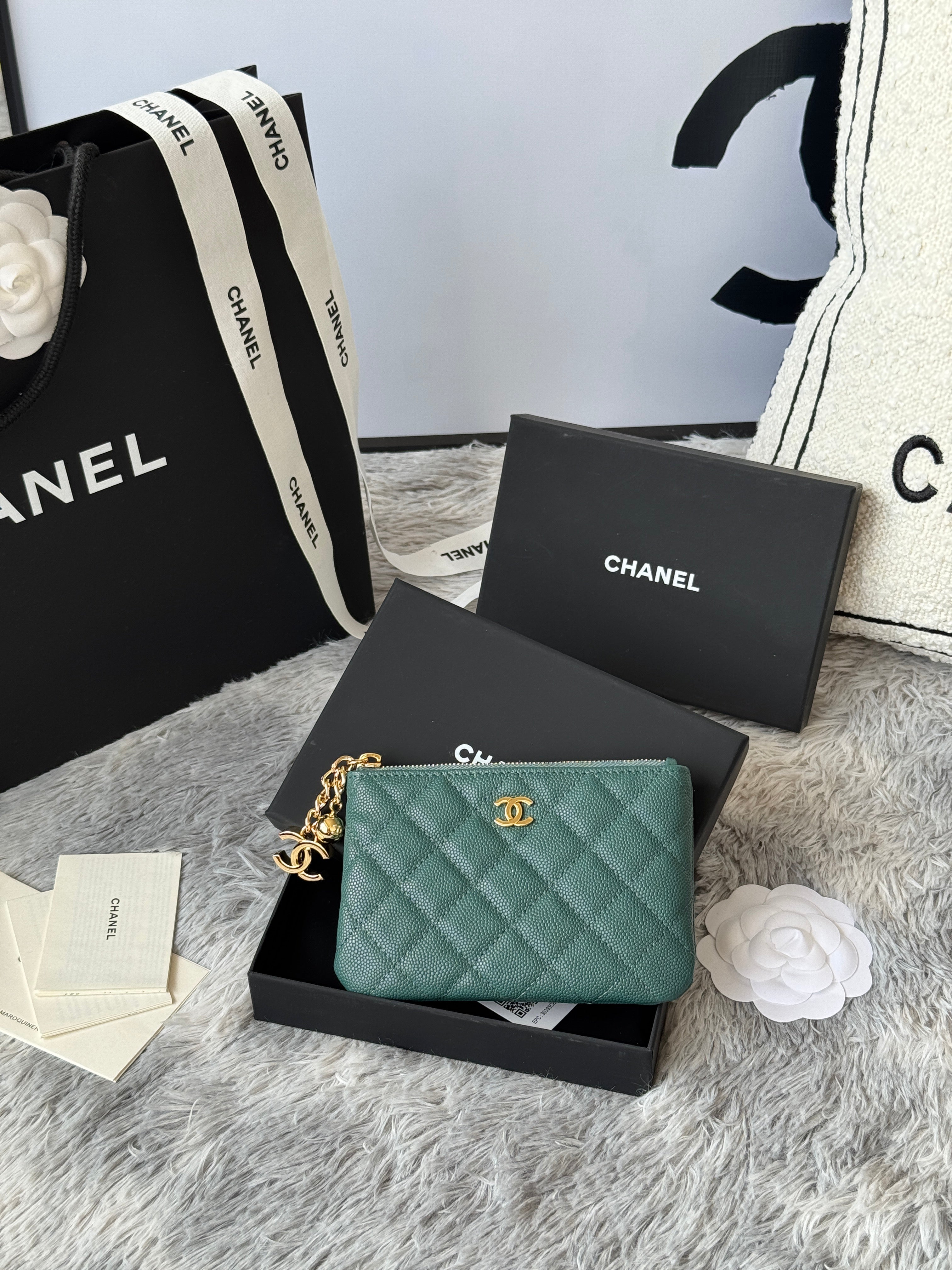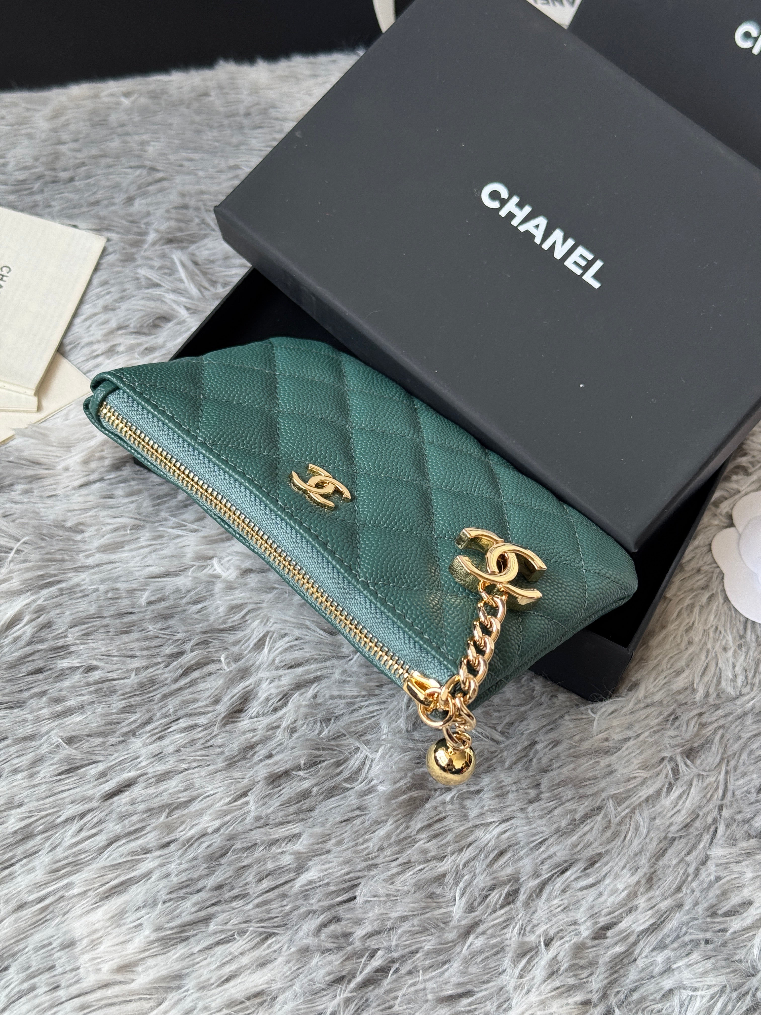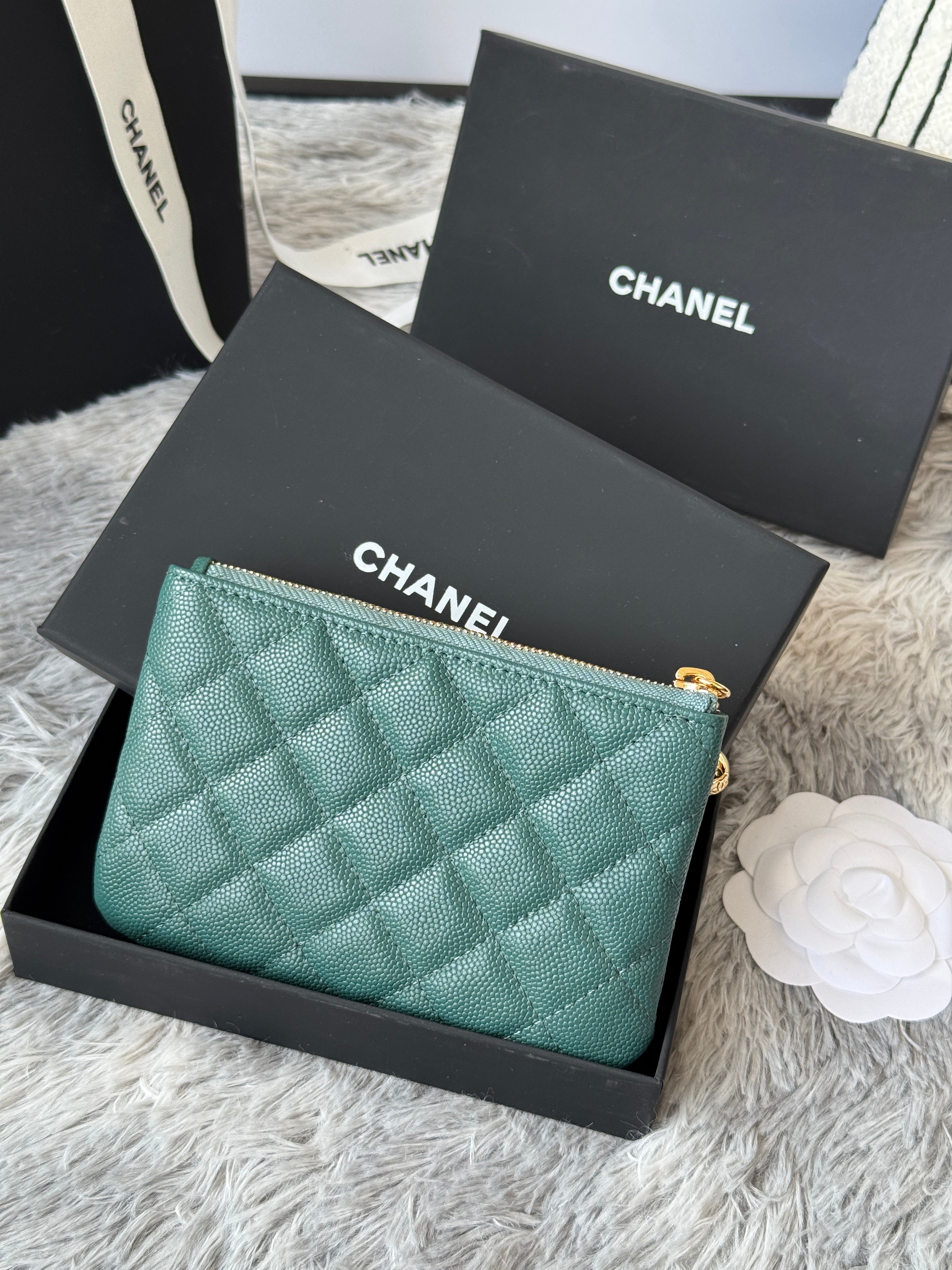 CC CLASSIC ZIPPED POUCH 14 IN NEPTUNE GREEN GRAINED CALFSKIN GOLD-TONE CHARM CHAIN