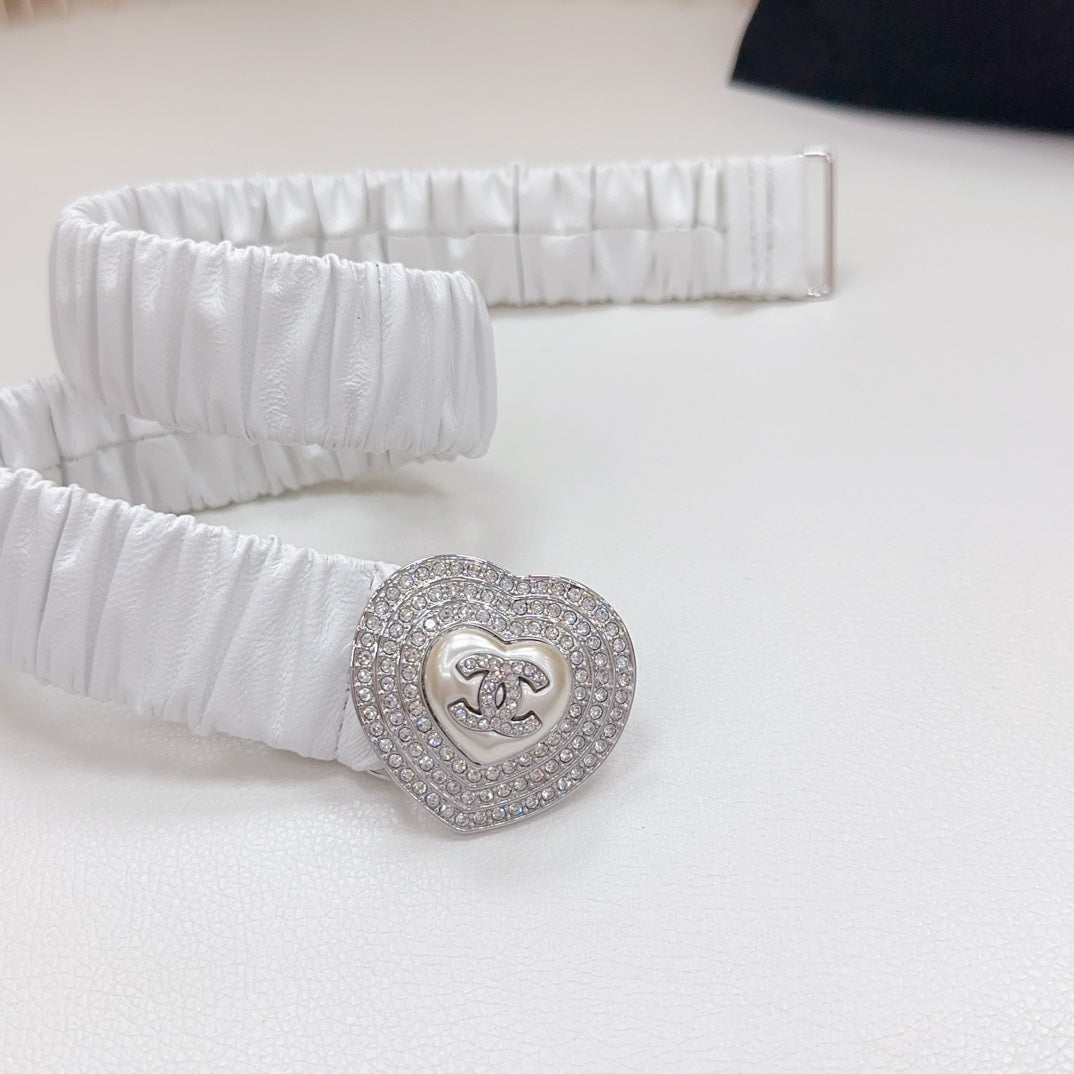 CC ELASTIC 30 MM BELT HEART BUCKLE IN WHITE CALFSKIN SILVER HARDWARE ATTACH RHINSTONES