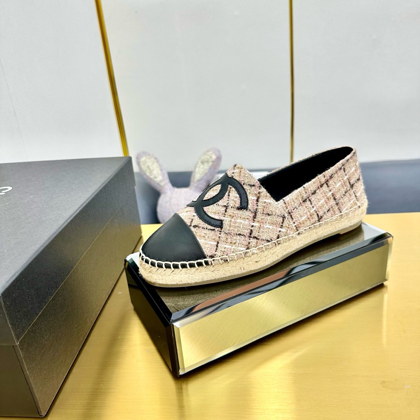 CC ESPADRILLES PLATFORM 25S IN LIGHT BEIGE TWEED MIX BLACK CALFSKIN WITH PLAID PATTERN