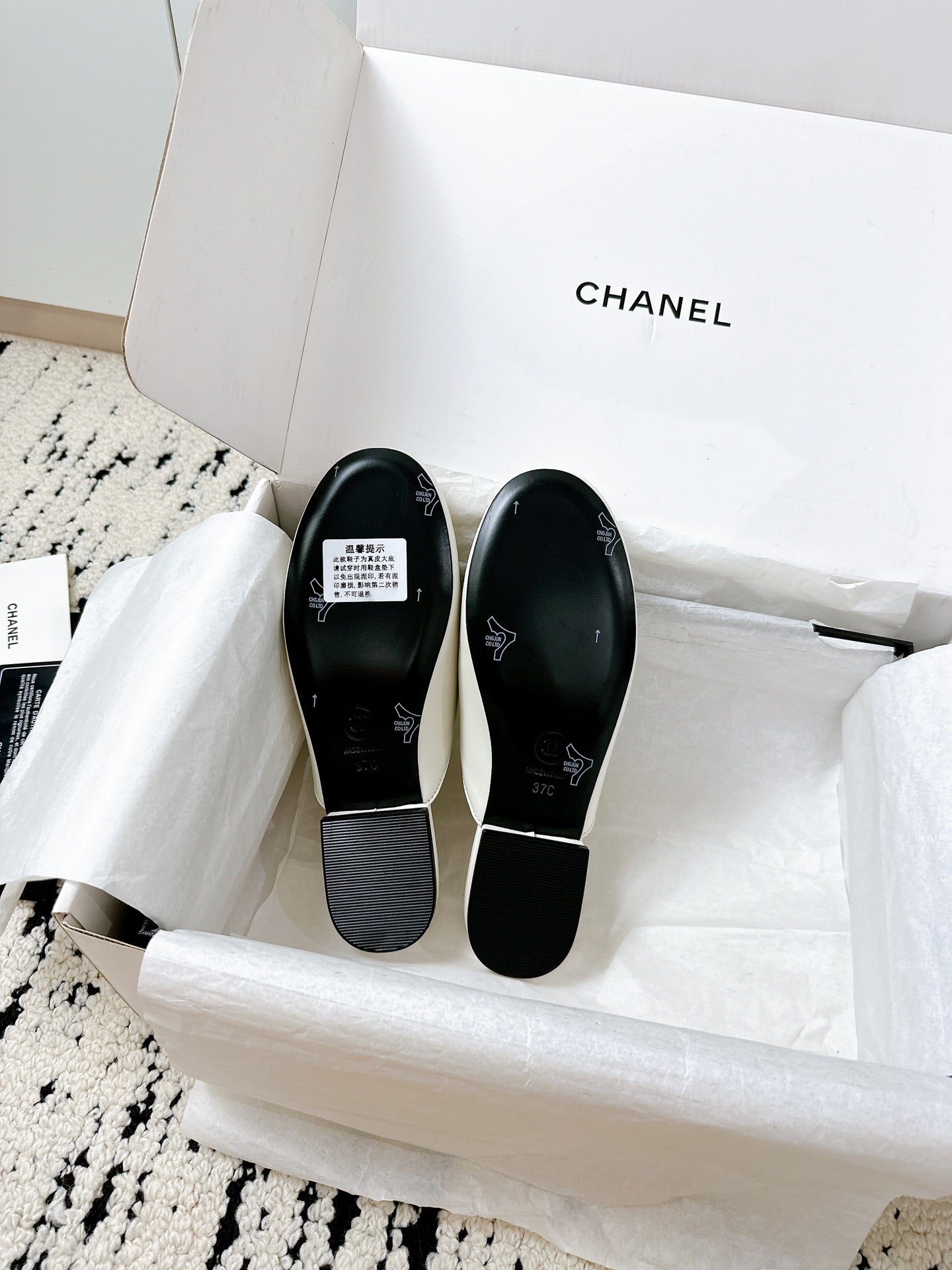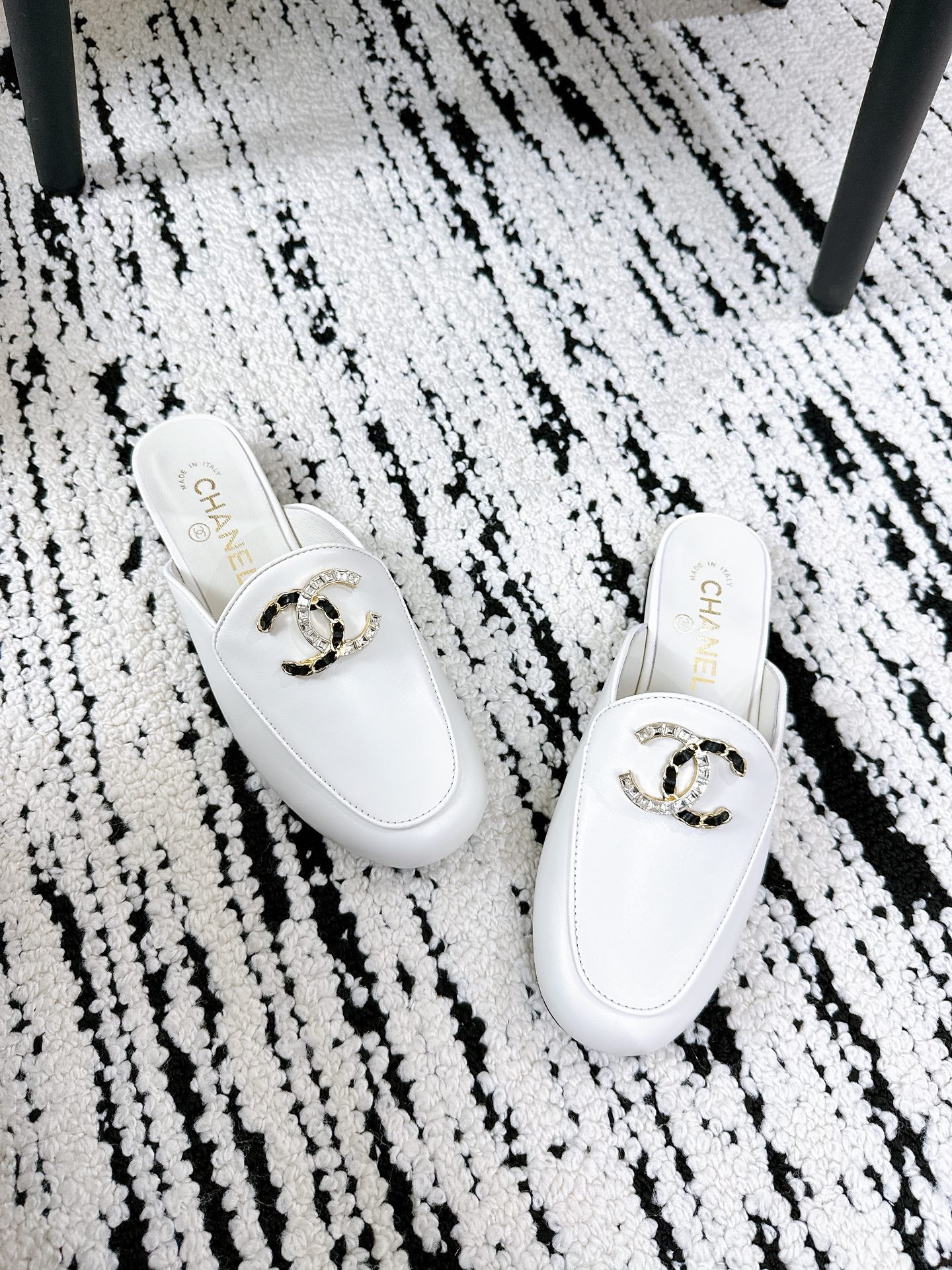 CC FLAT MULE IN WHITE CALFSKIN HARDWARE WITH ROCK MIX CHAIN