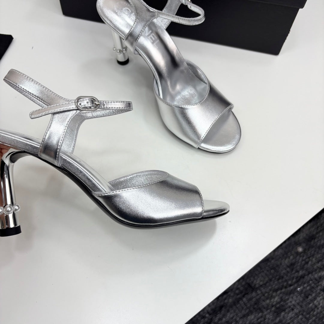 CC HIGH SANDAL 25S 80 MM IN SILVER CALFSKIN WITH PEARL DETAILS