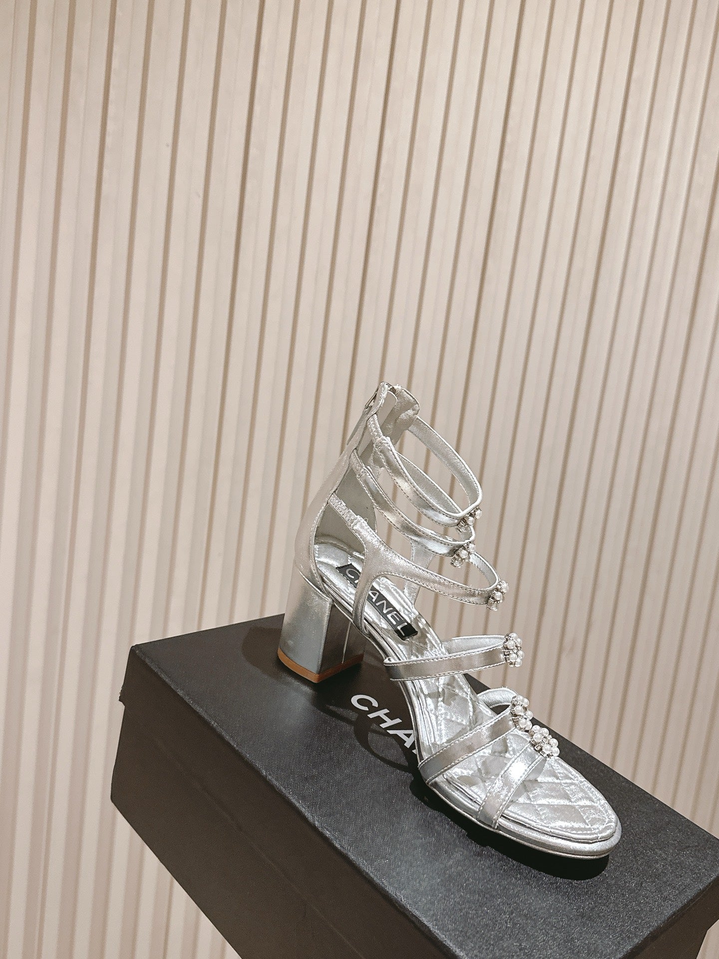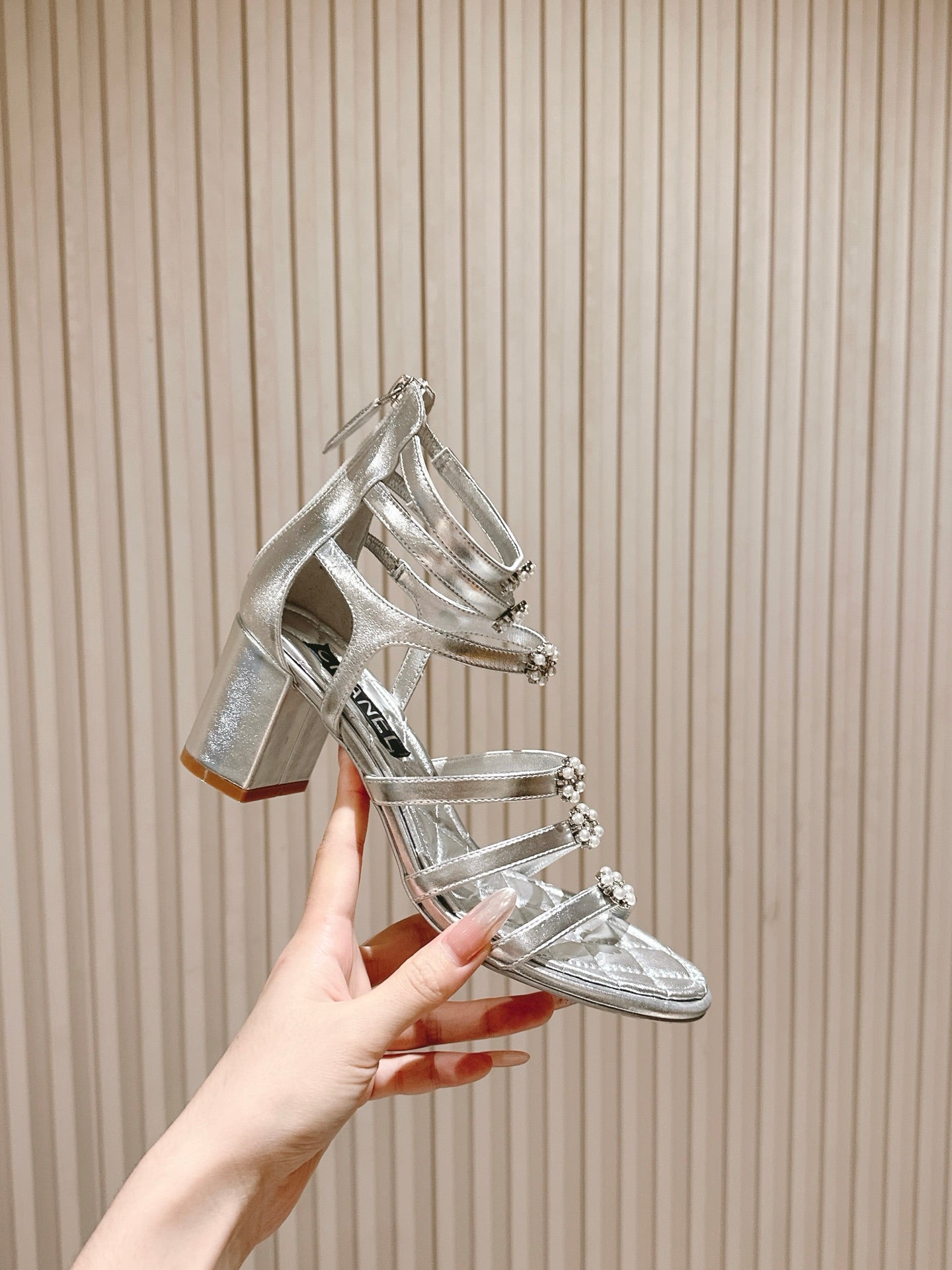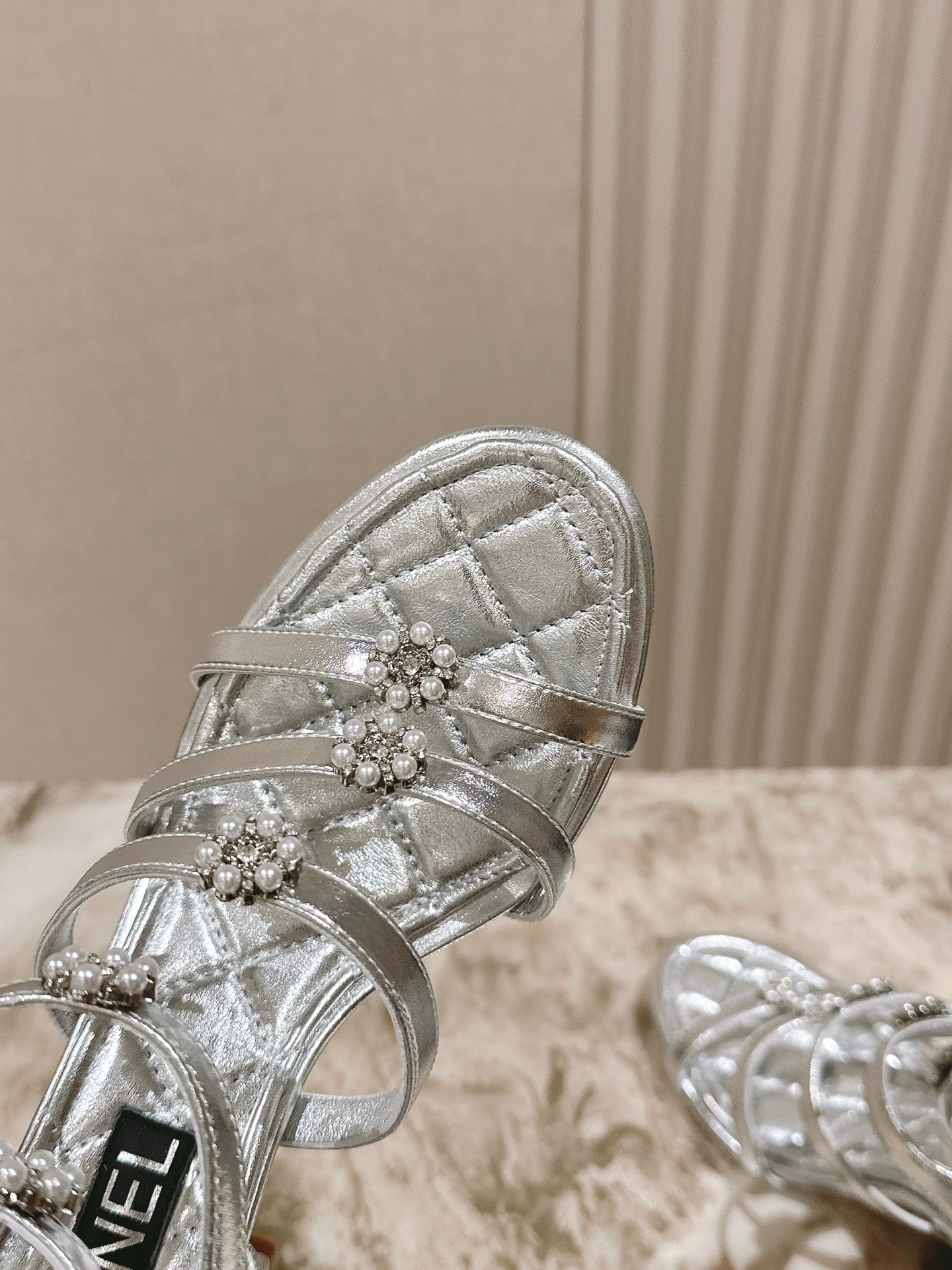 CC HIGH SANDAL 25S IN SILVER LAMBSKIN PEARL FLOWERS