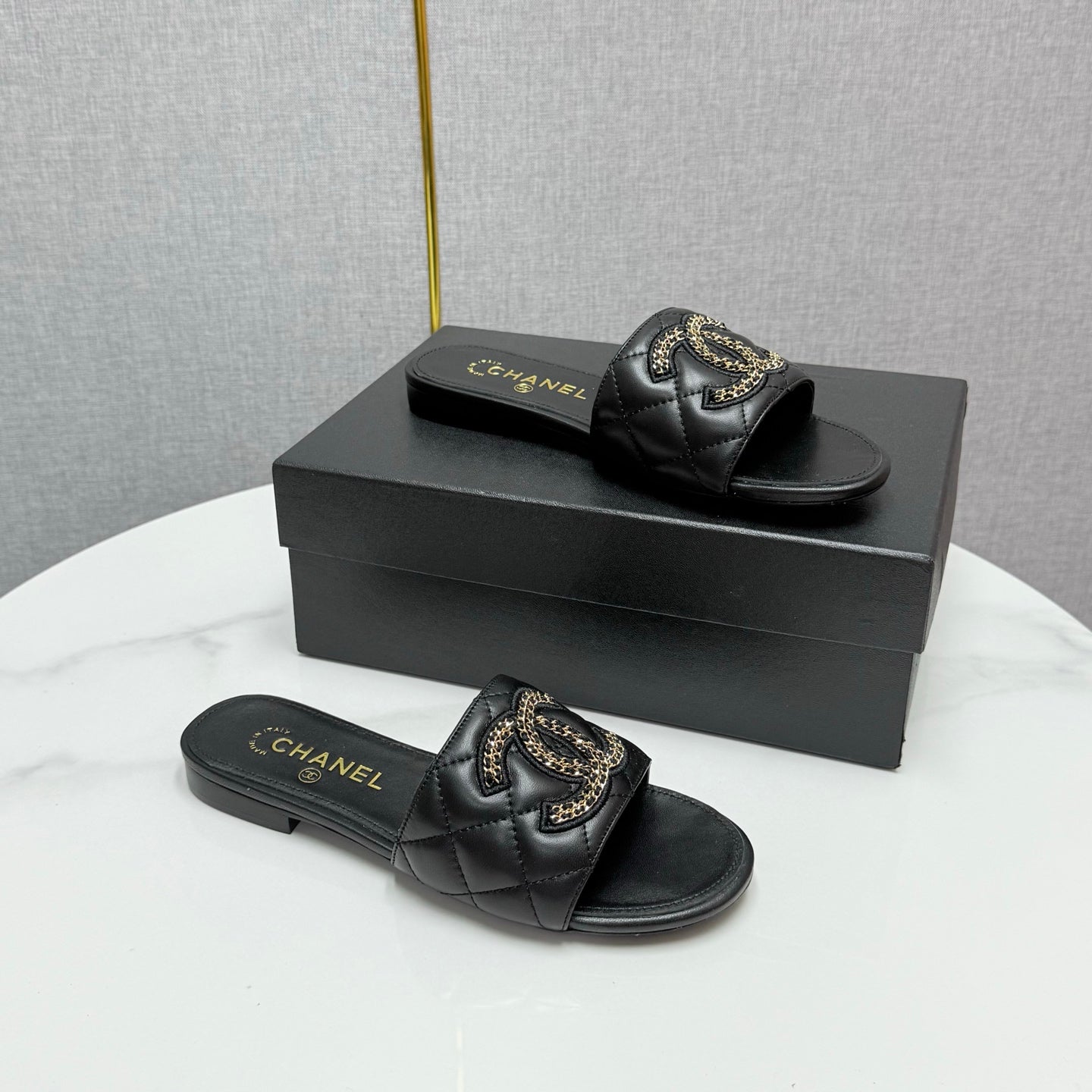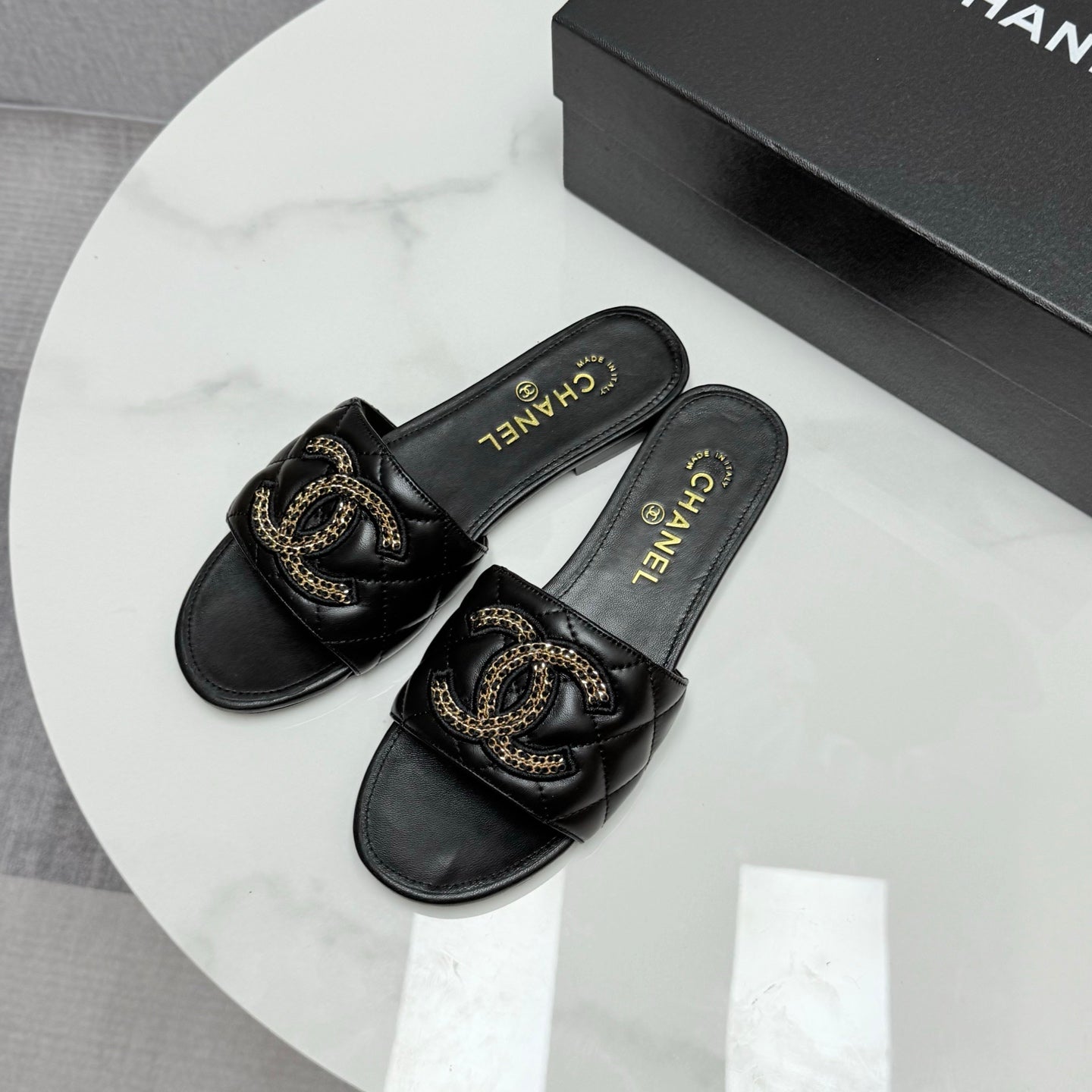 CC SLIDE SANDALS 25S IN BLACK CALFSKIN WITH LOGO