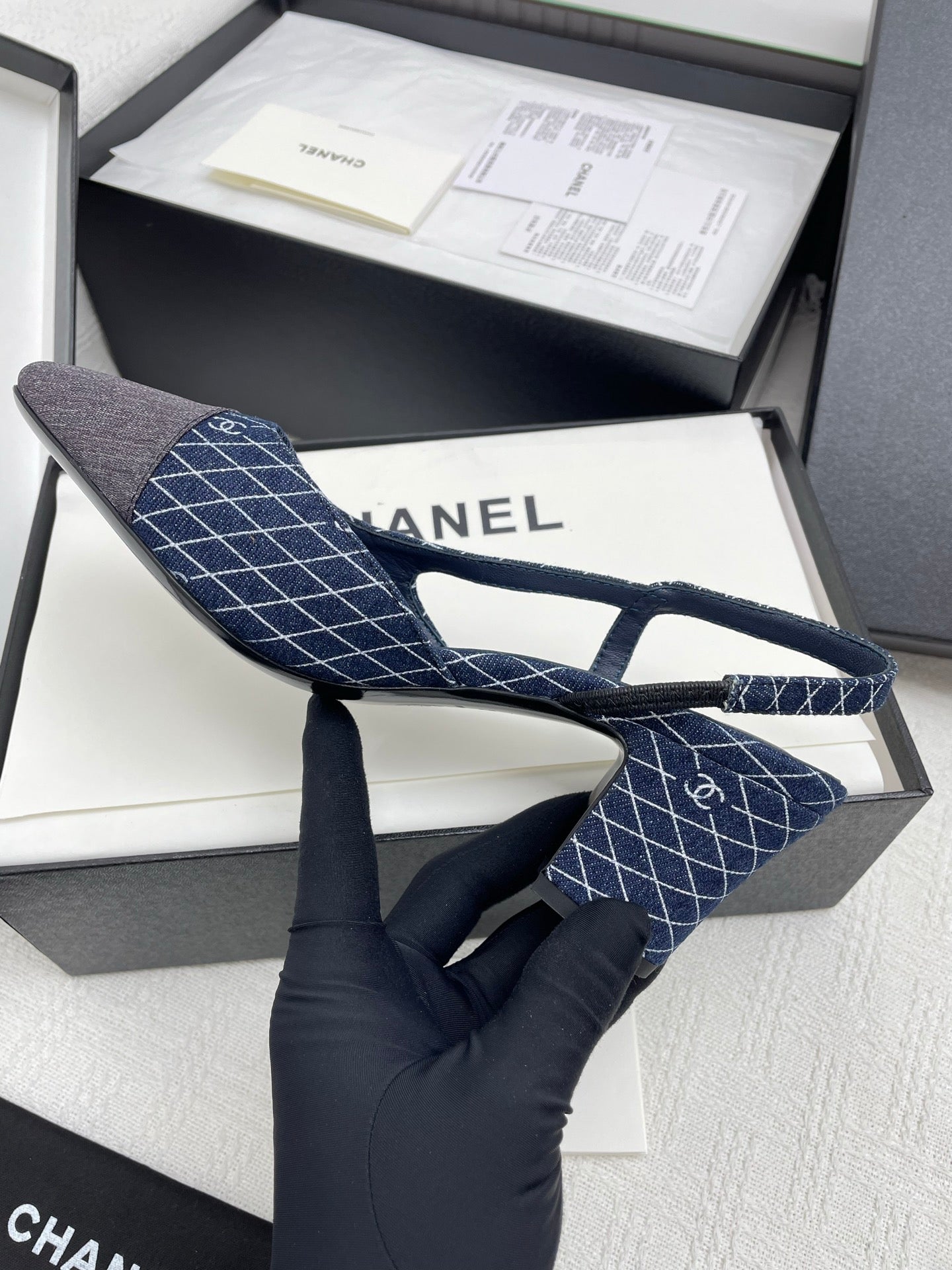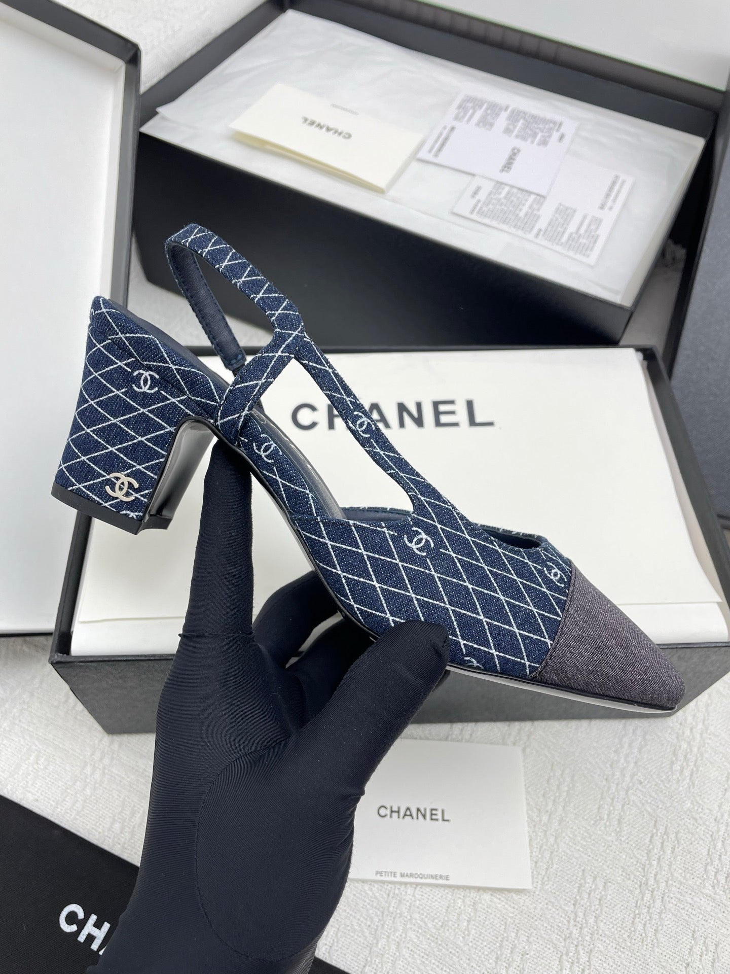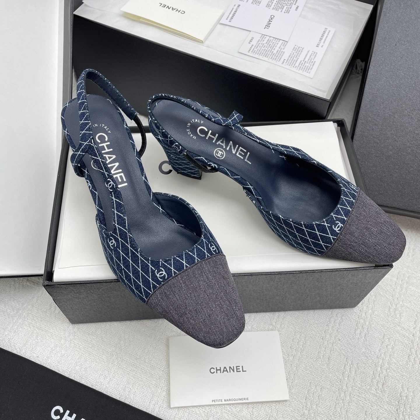 CC SLINGBACK 25S 65 MM IN NAVY BLUE DENIM WITH PLAID PATTERN