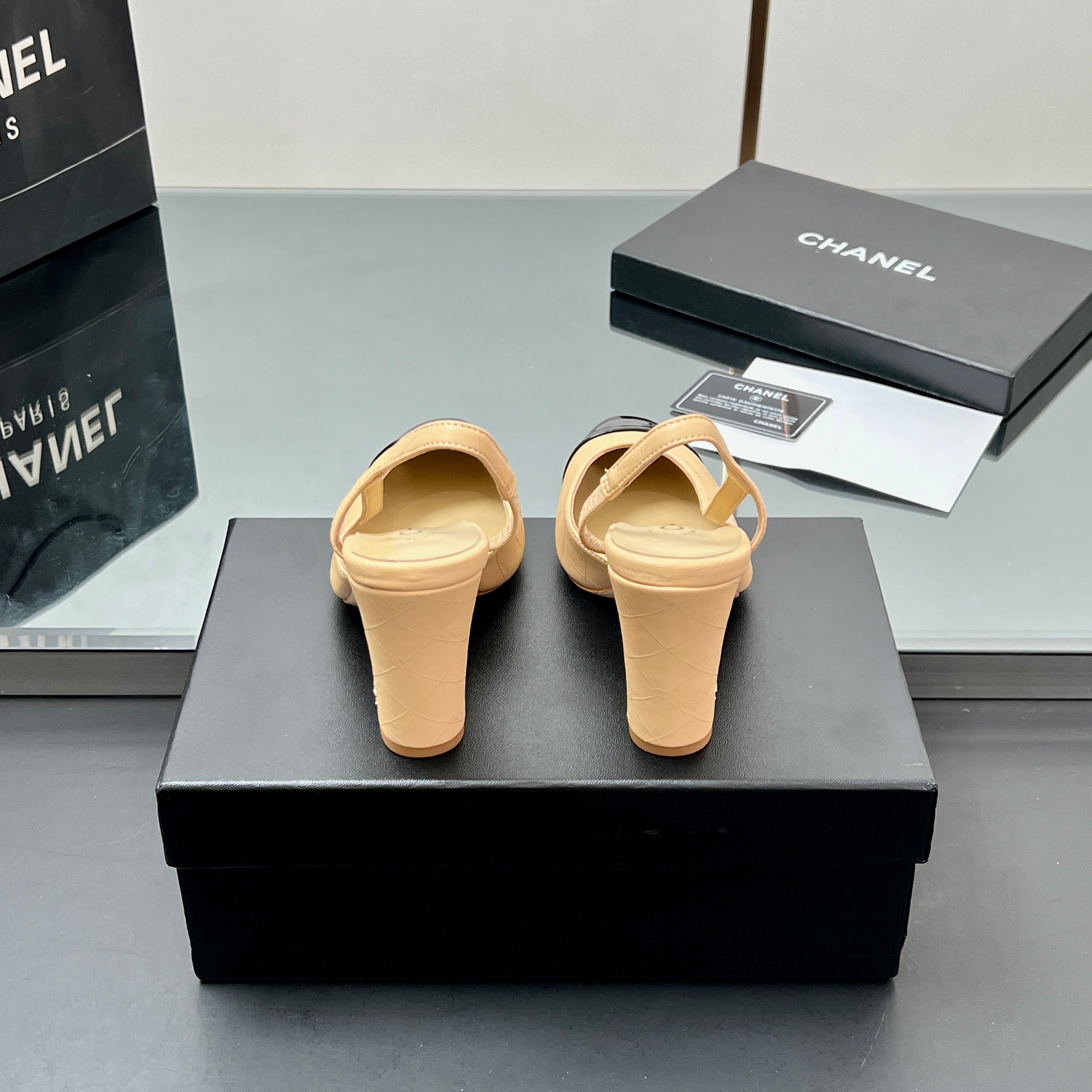 CC SLINGBACK 25S 90 MM IN BEIGE LAMBSKIN AND BLACK GLOSSY LEATHER WITH CHECK PATTERN