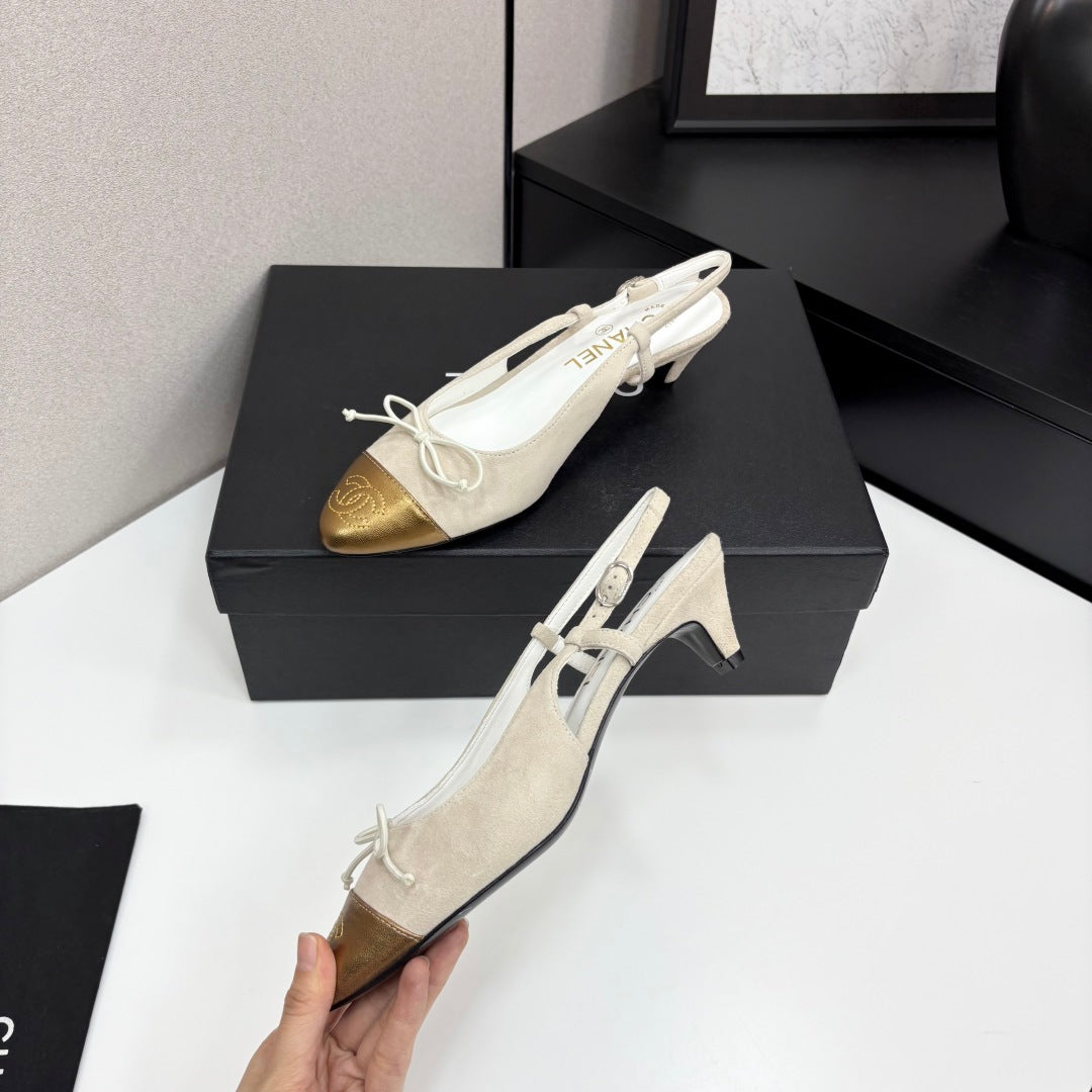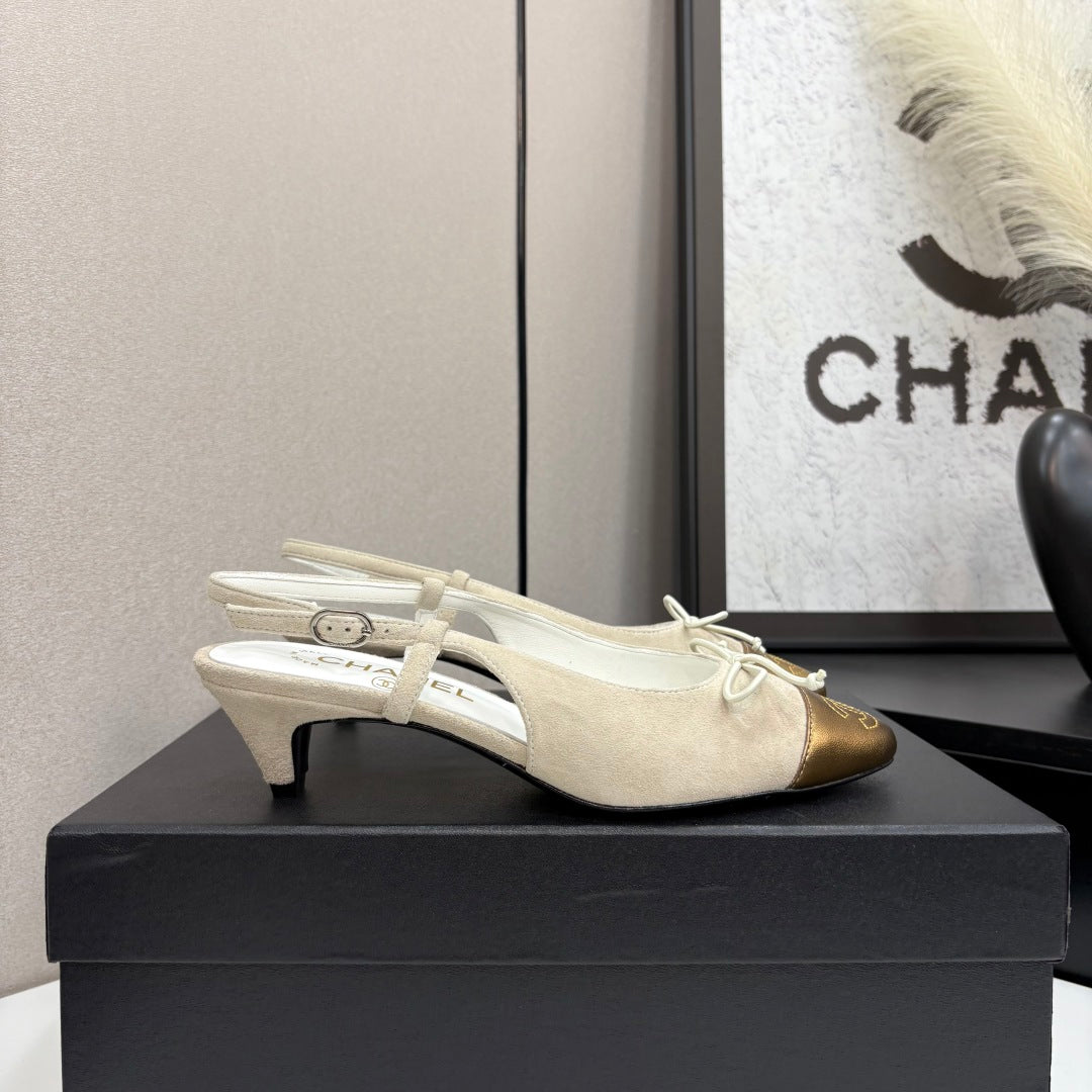 CC SLINGBACK 25S IN DUSTY BEIGE SUEDE AND GOLDEN BROWN LAMBSKIN WITH BOW