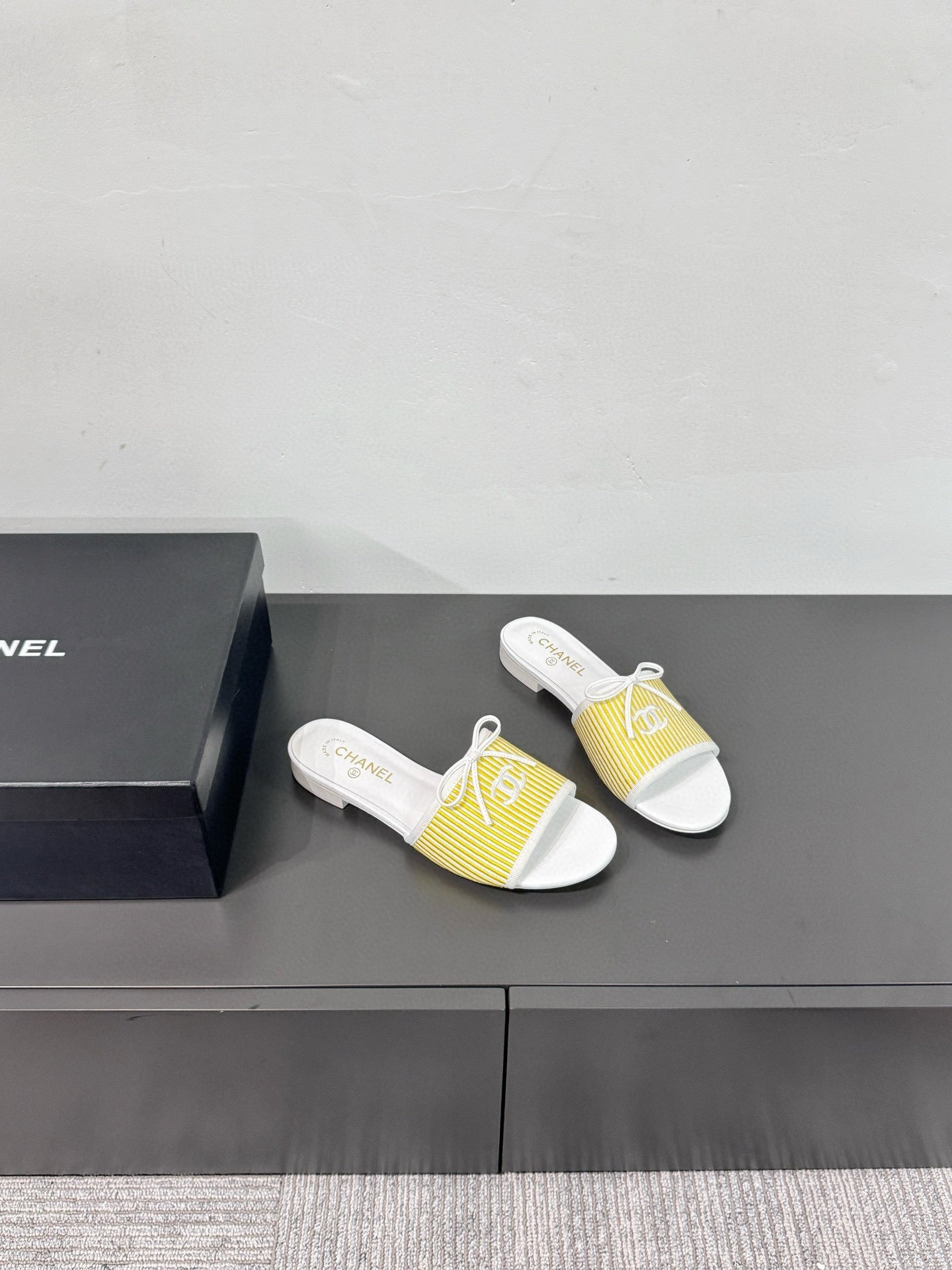 CC STRIPED SLIDE SANDALS IN YELLOW AND WHITE CANVAS