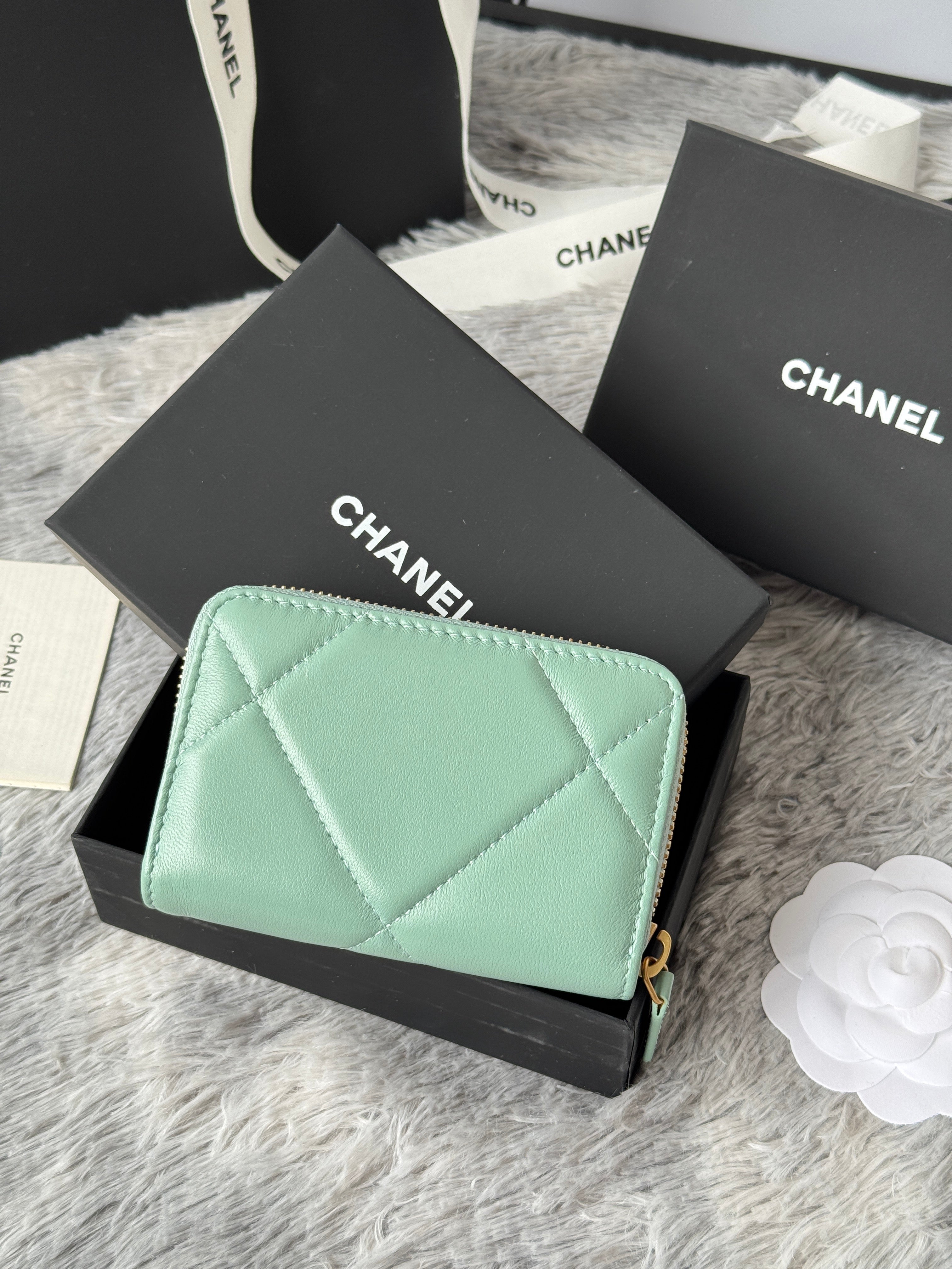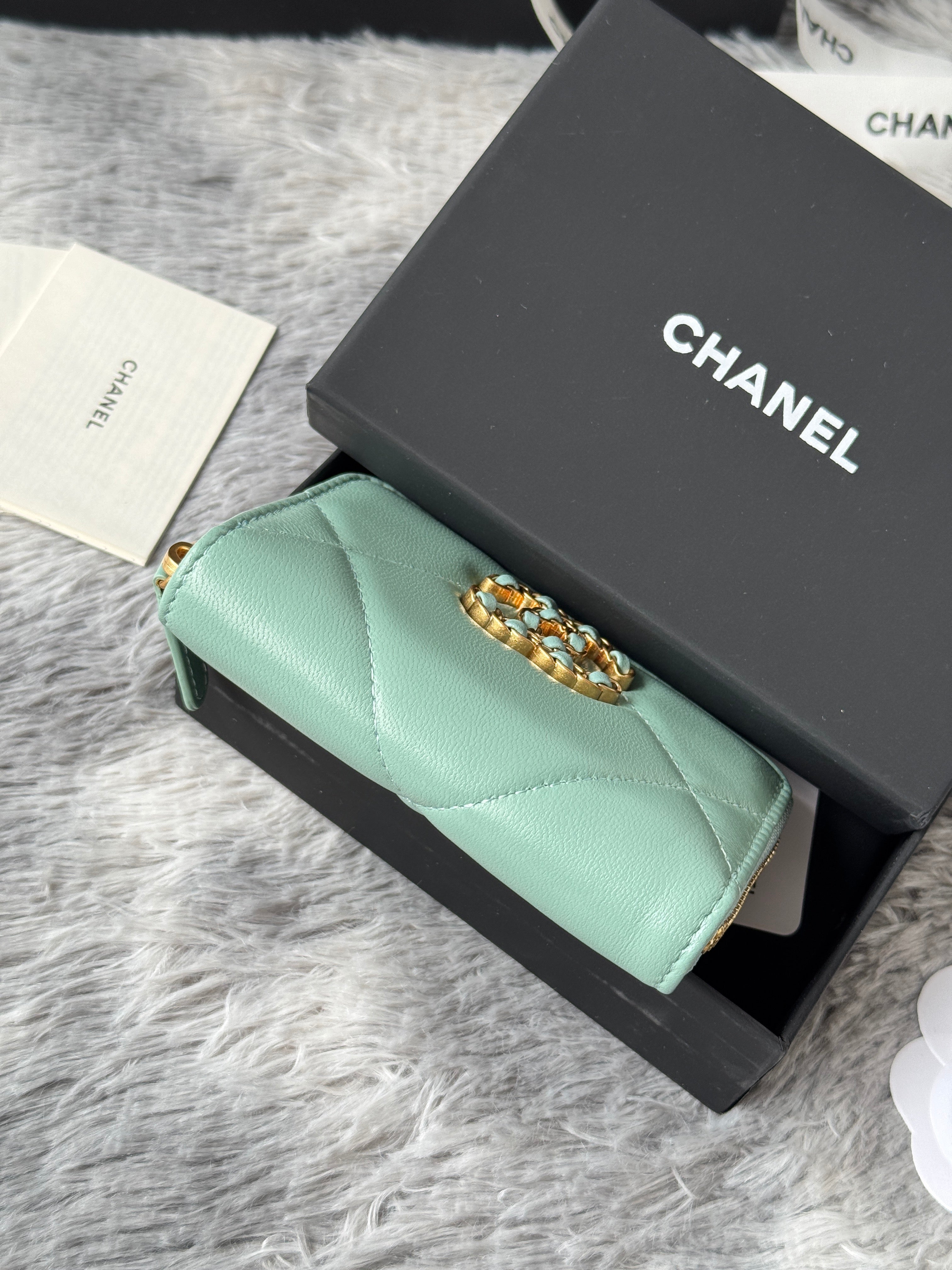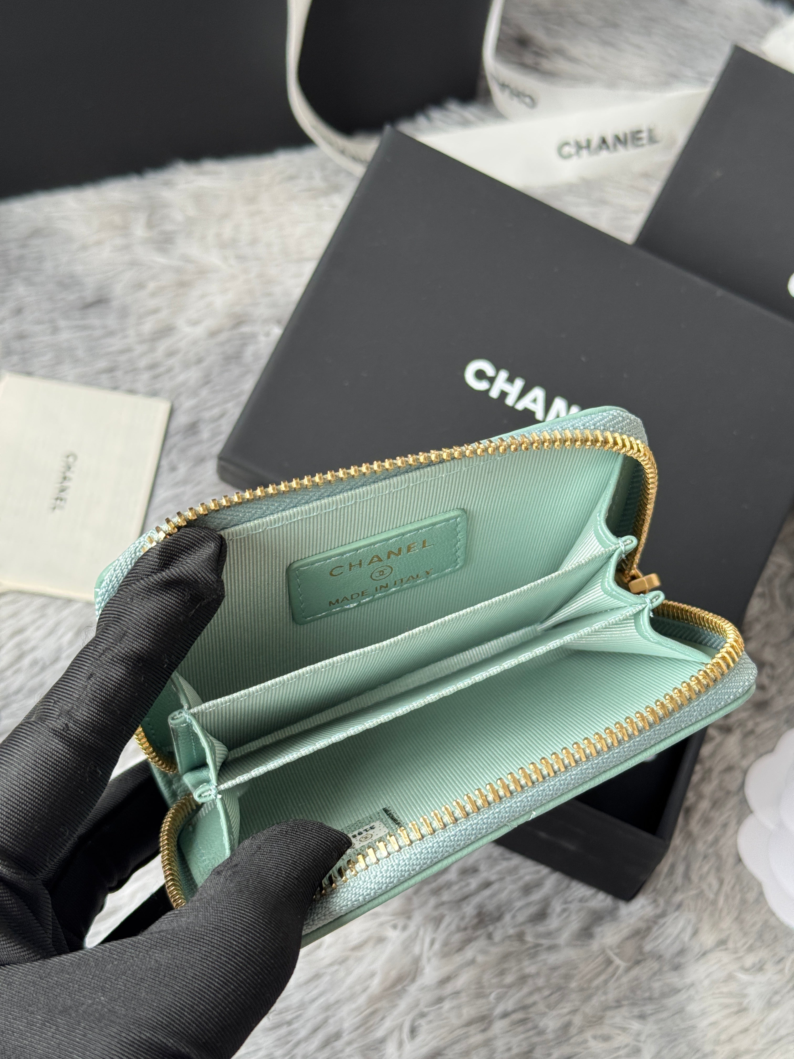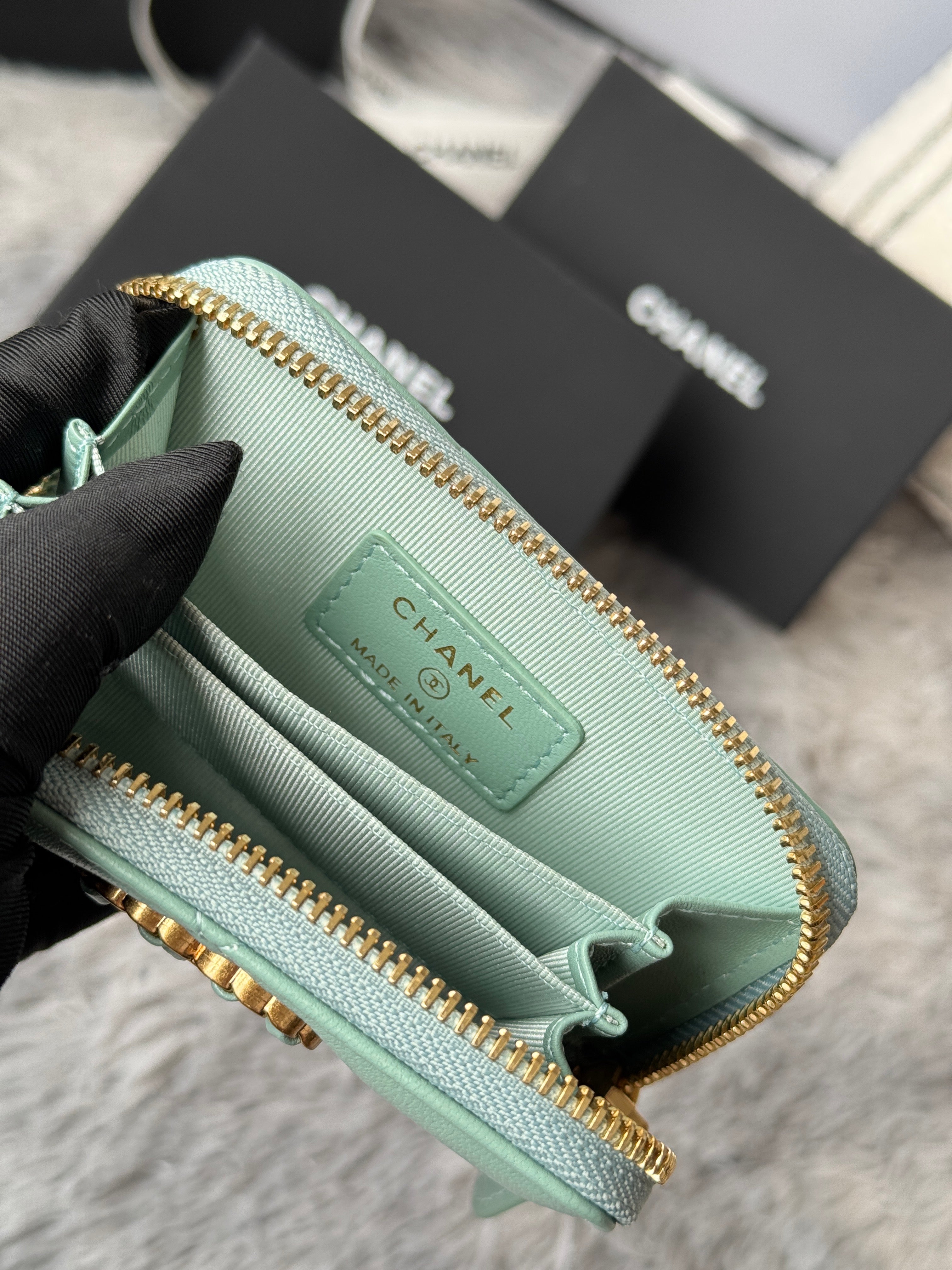 CC ZIPPED CARD HOLDER 11 IN BABY GREEN LAMBSKIN GOLD-TONE METALLIC