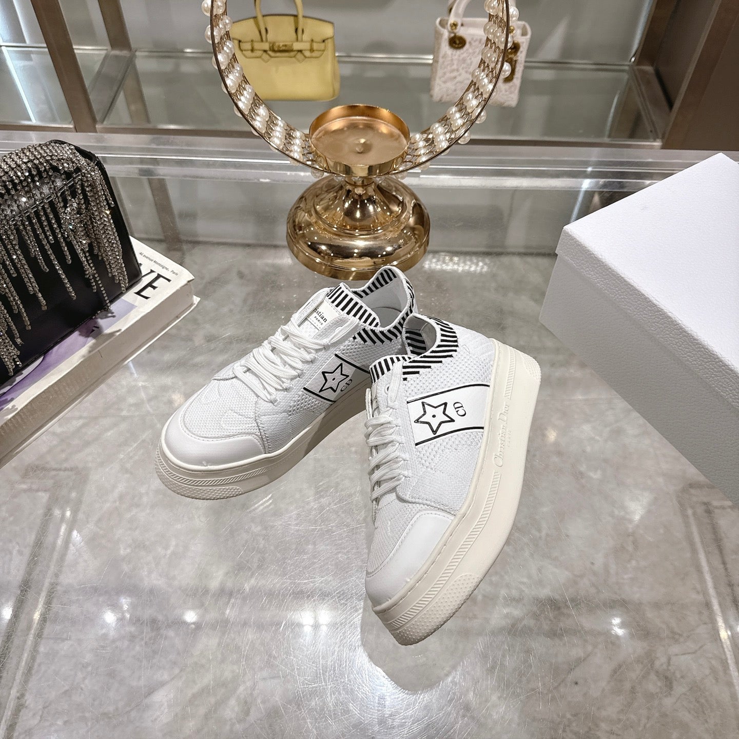 CD STAR SNEAKER 4CM IN WHITE MESH FABRIC BLACK STRIPE COLLAR DETAIL