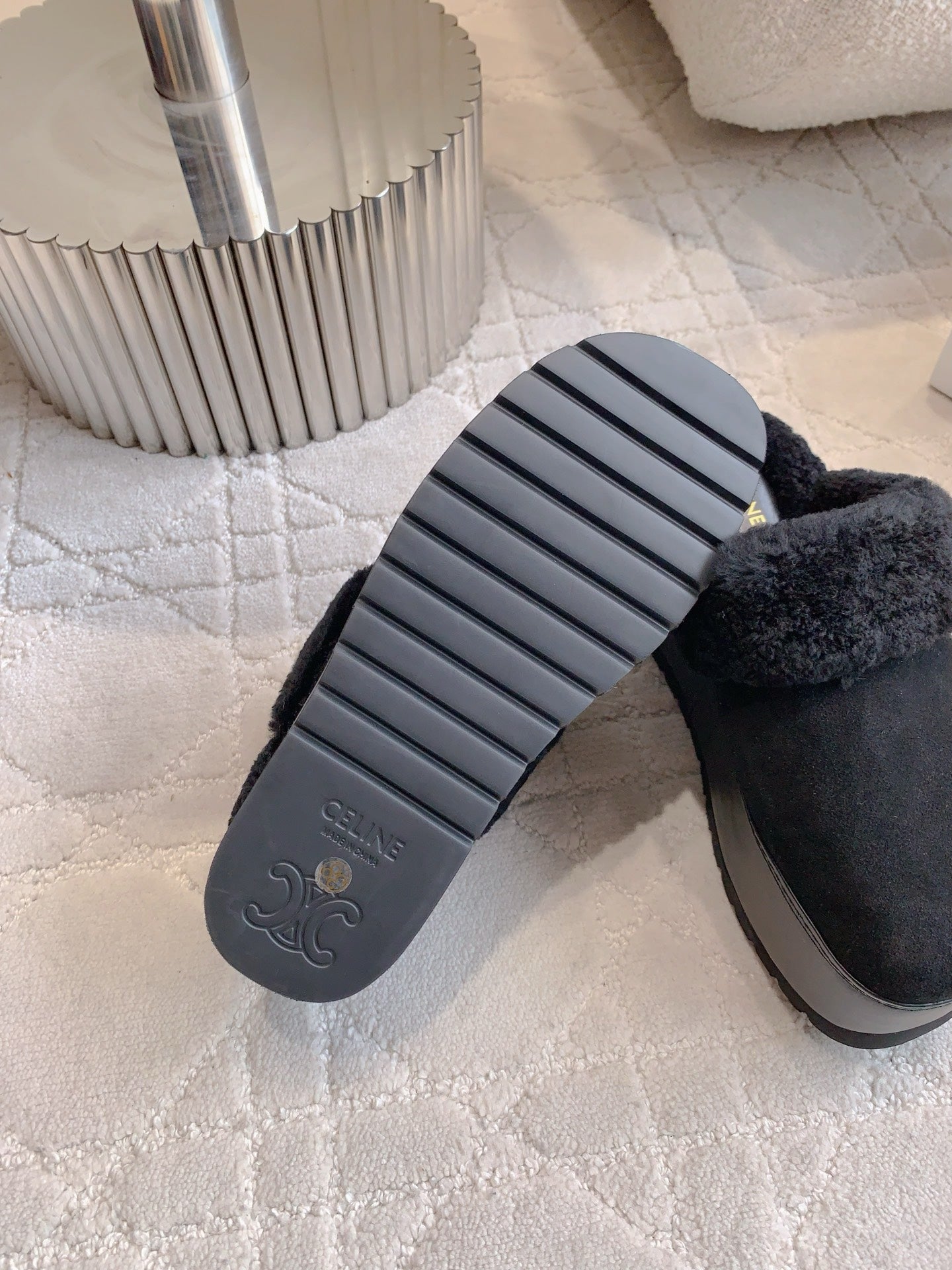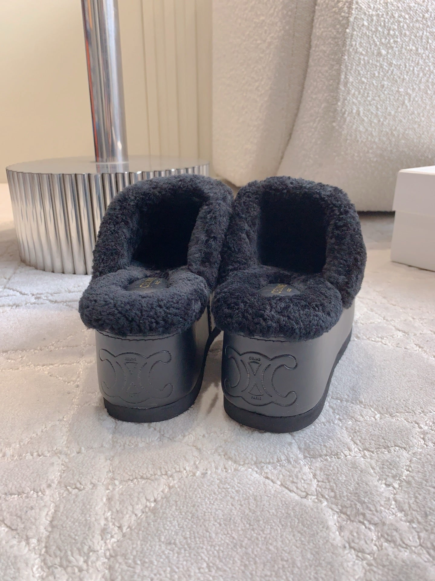 CELINE 25S DANA WEDGE MULE 70MM IN BLACK SUEDE CALFSKIN AND SHEARLING