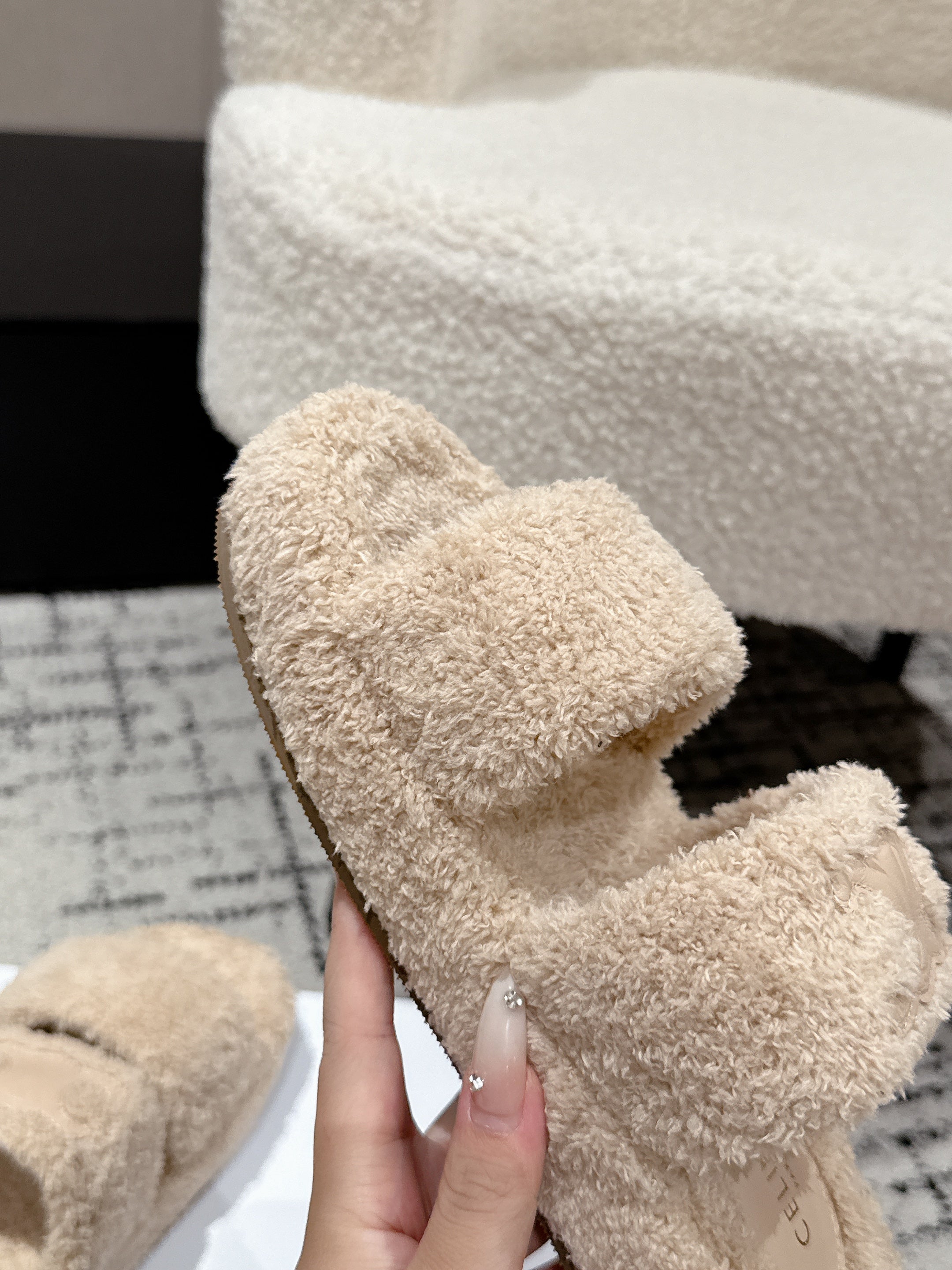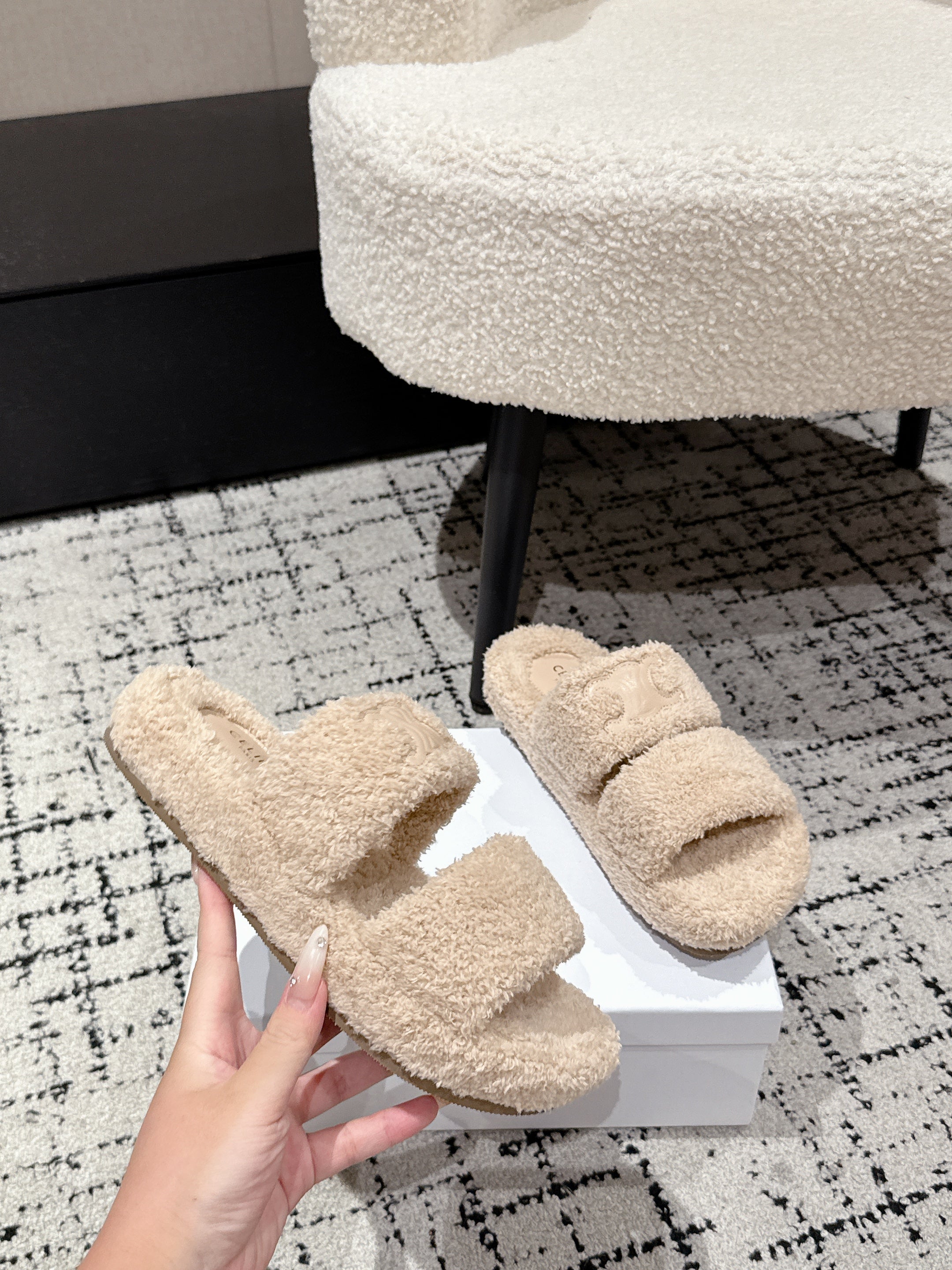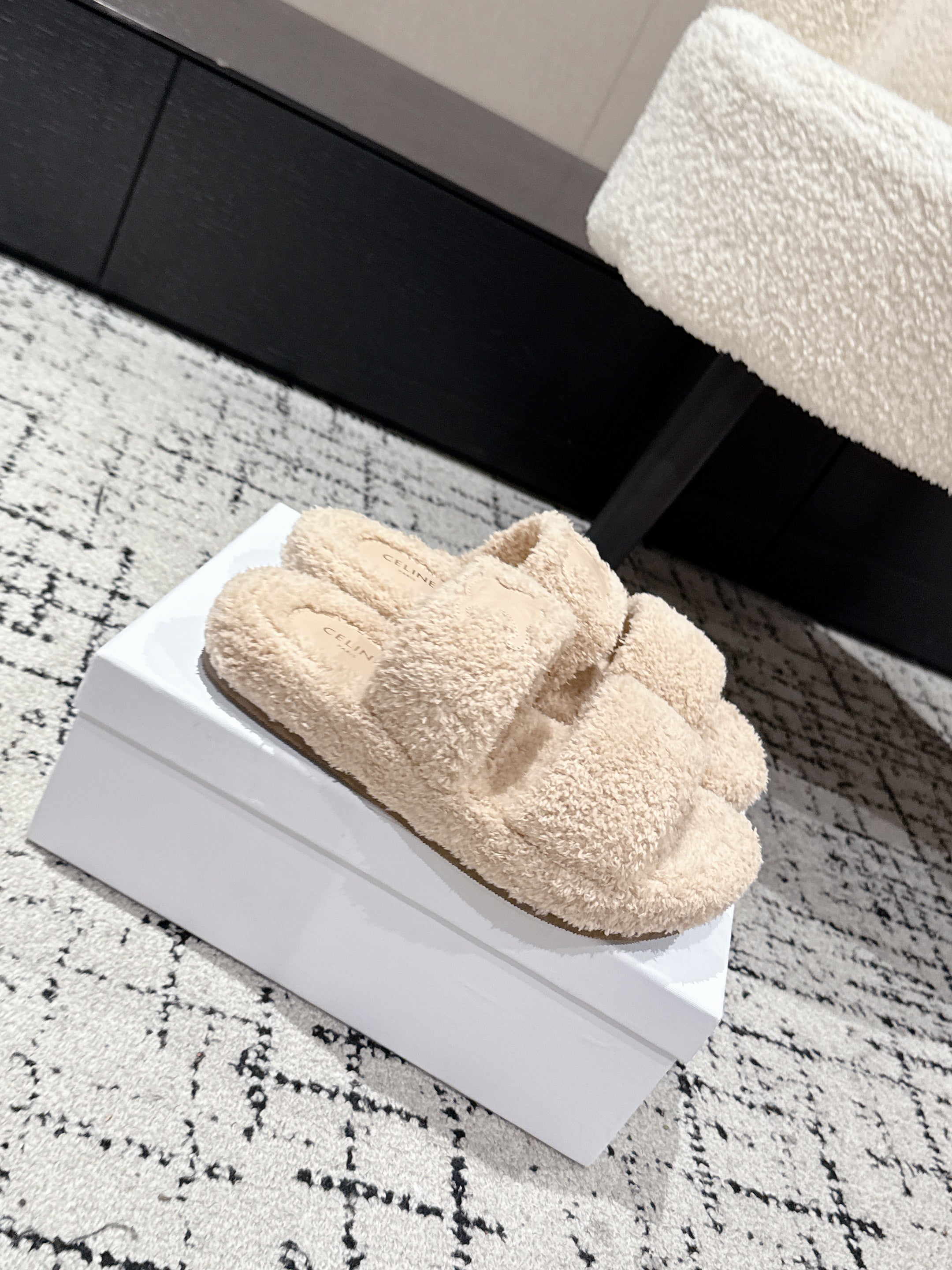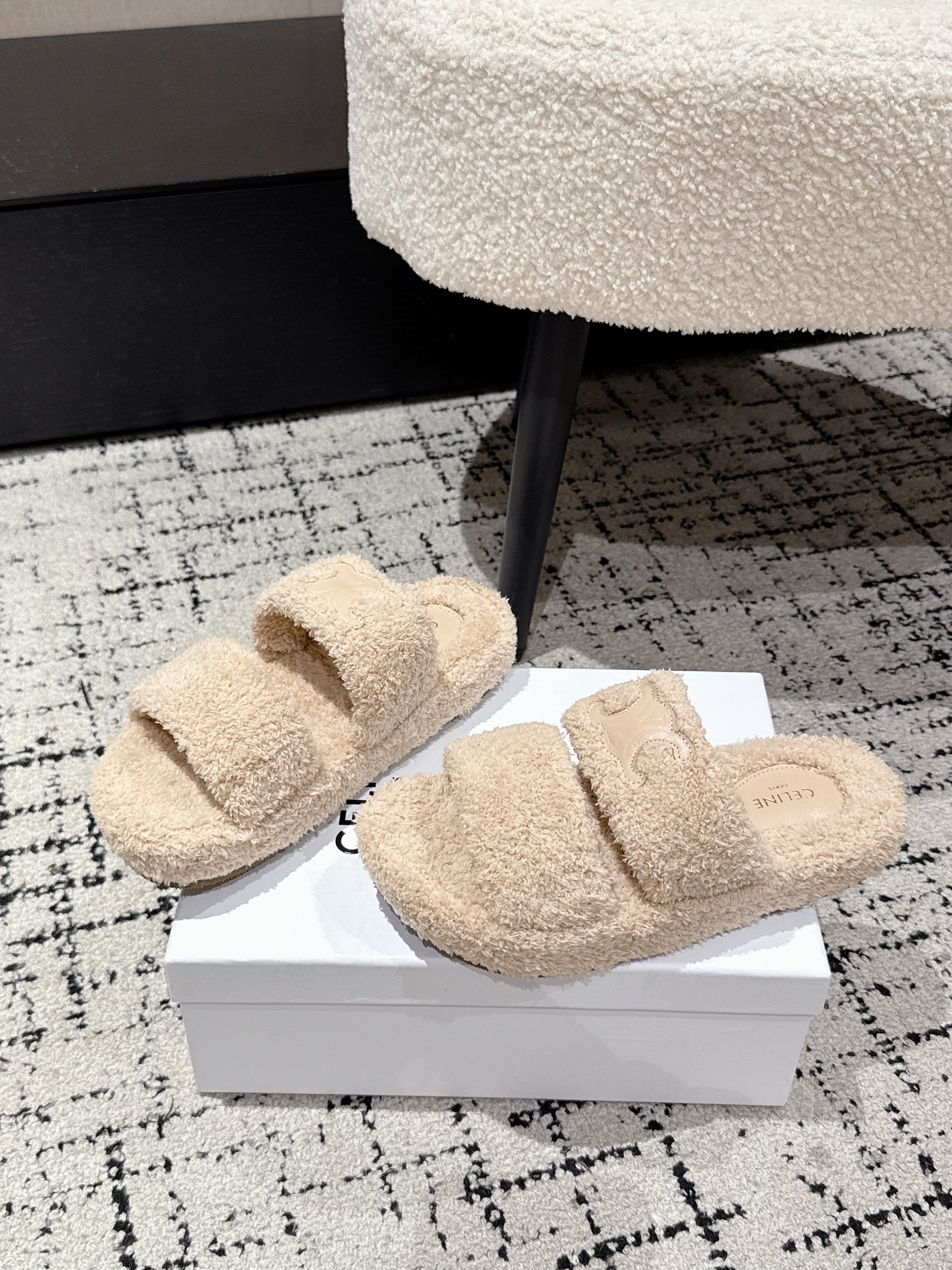 CELINE 25S SLIDES TRIOMPHE IN BIEGE SPONGE FABRIC