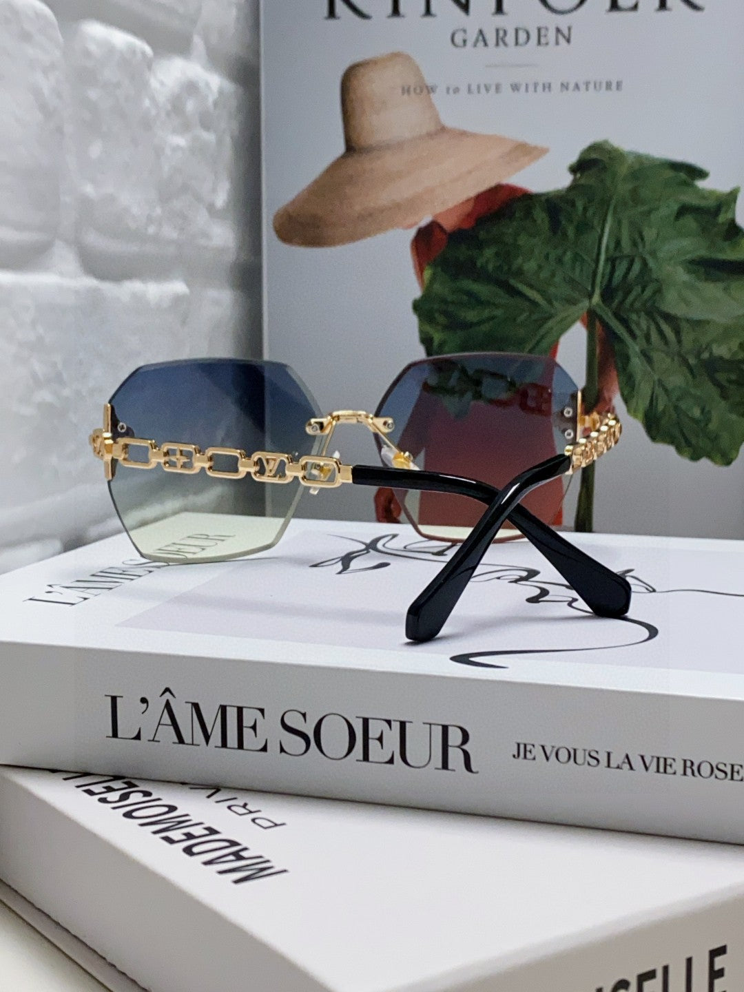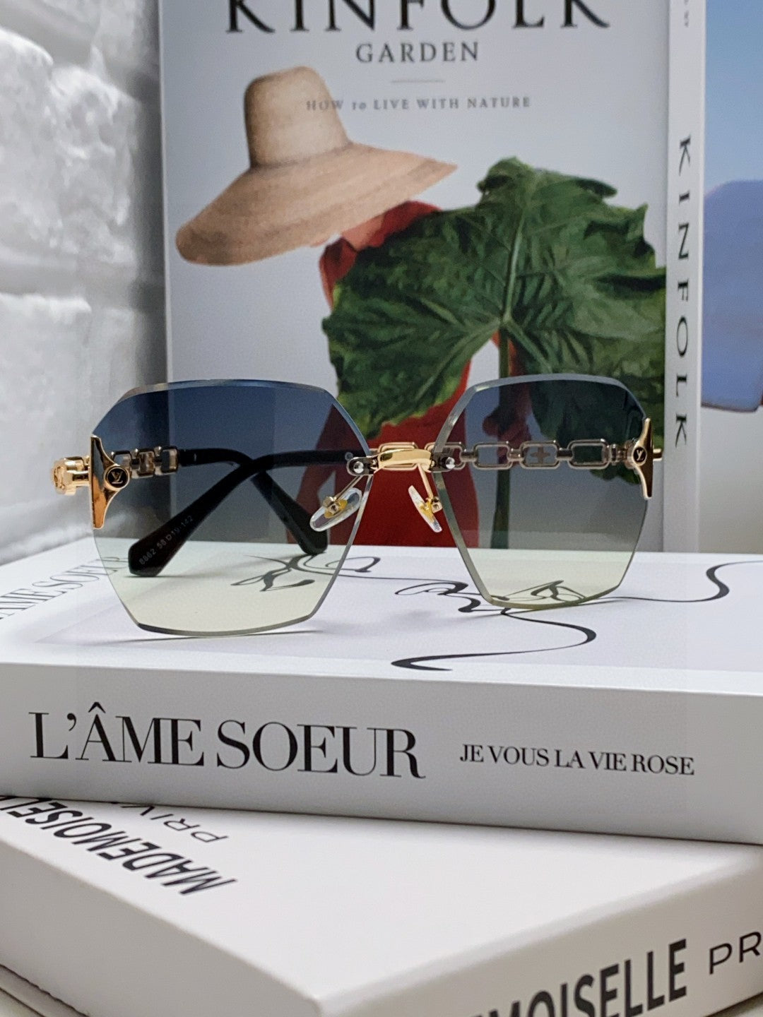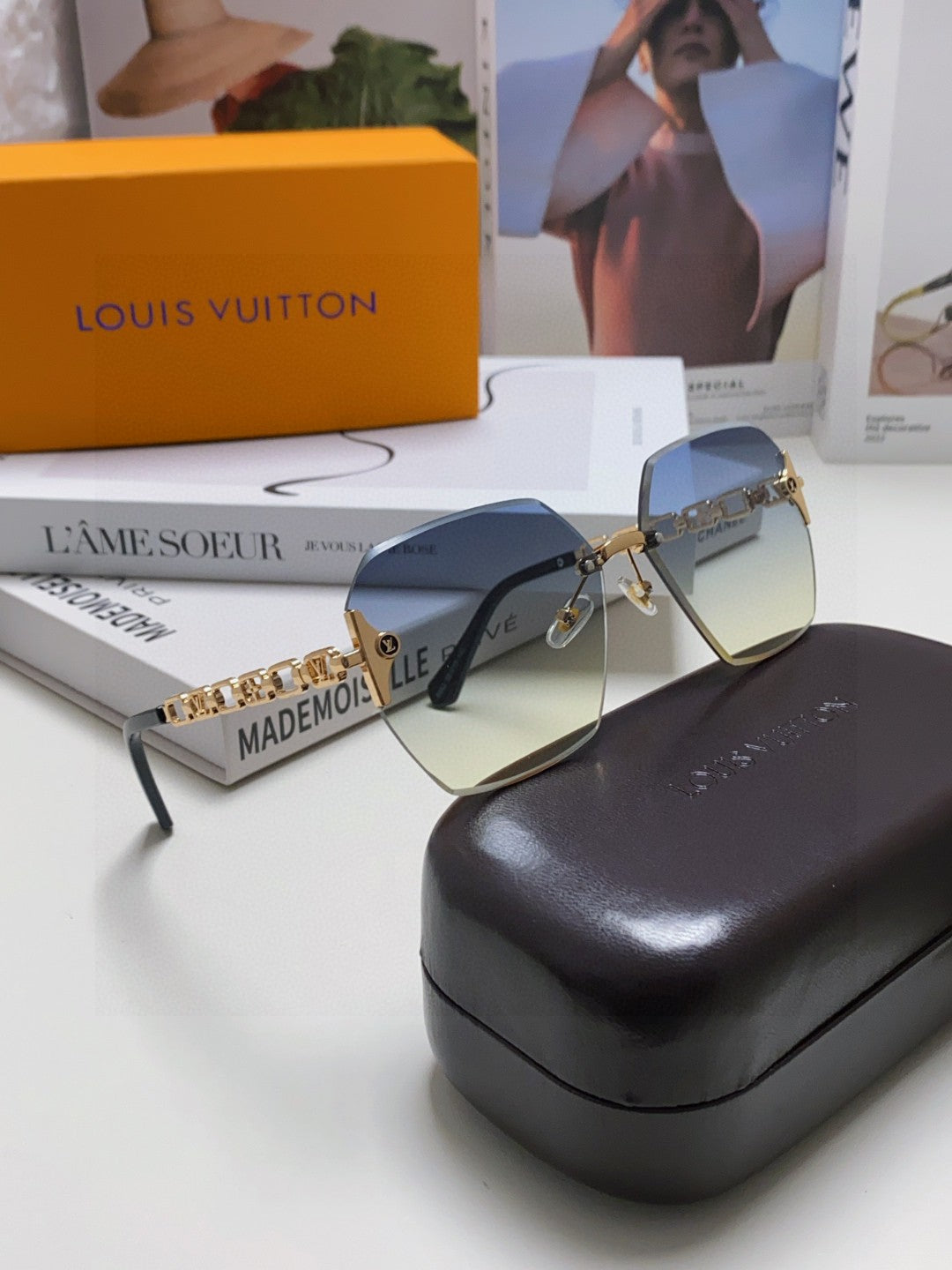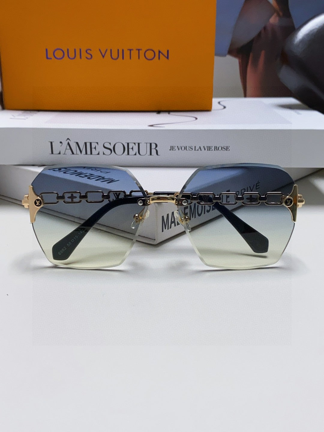CHAIN SQUARE SUNGLASSES 570259 IN GOLD METAL GREY YELLOW SMOKE LENS