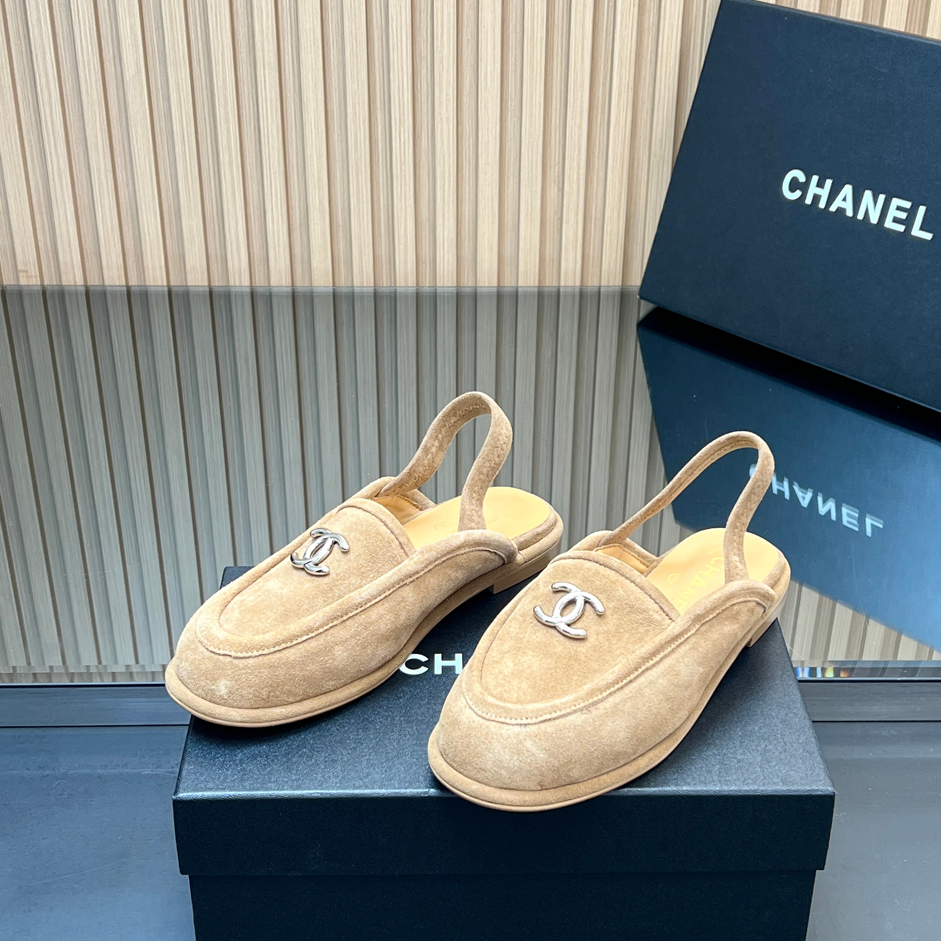 CHANEL 25S BACK STRAP MULE 15MM IN LIGHT BROWN SUEDE SILVER HARDWRE