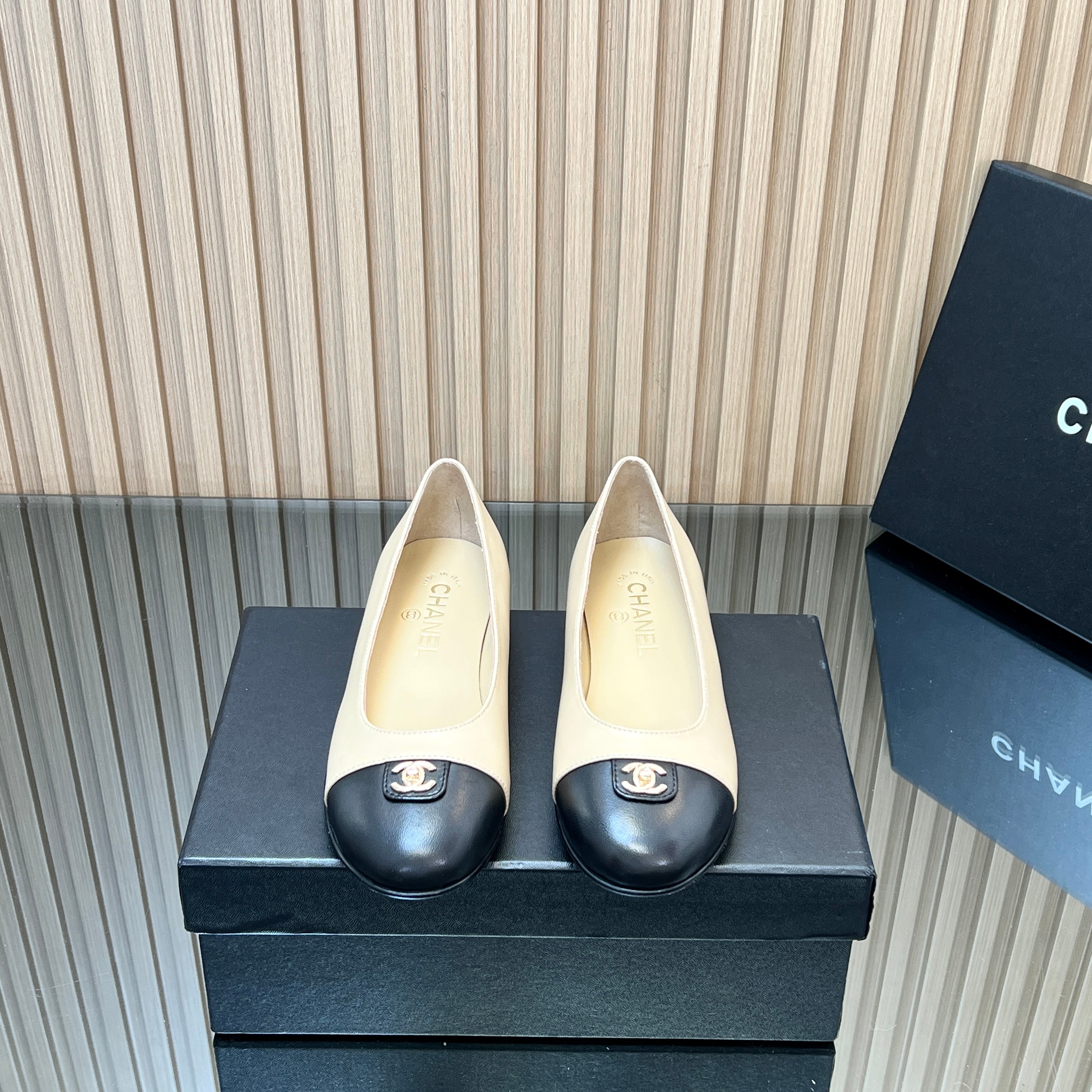 CHANEL 25S BALLET FLATS IN BEIGE AND BLACK LAMBSKIN GOLD HARDWRE