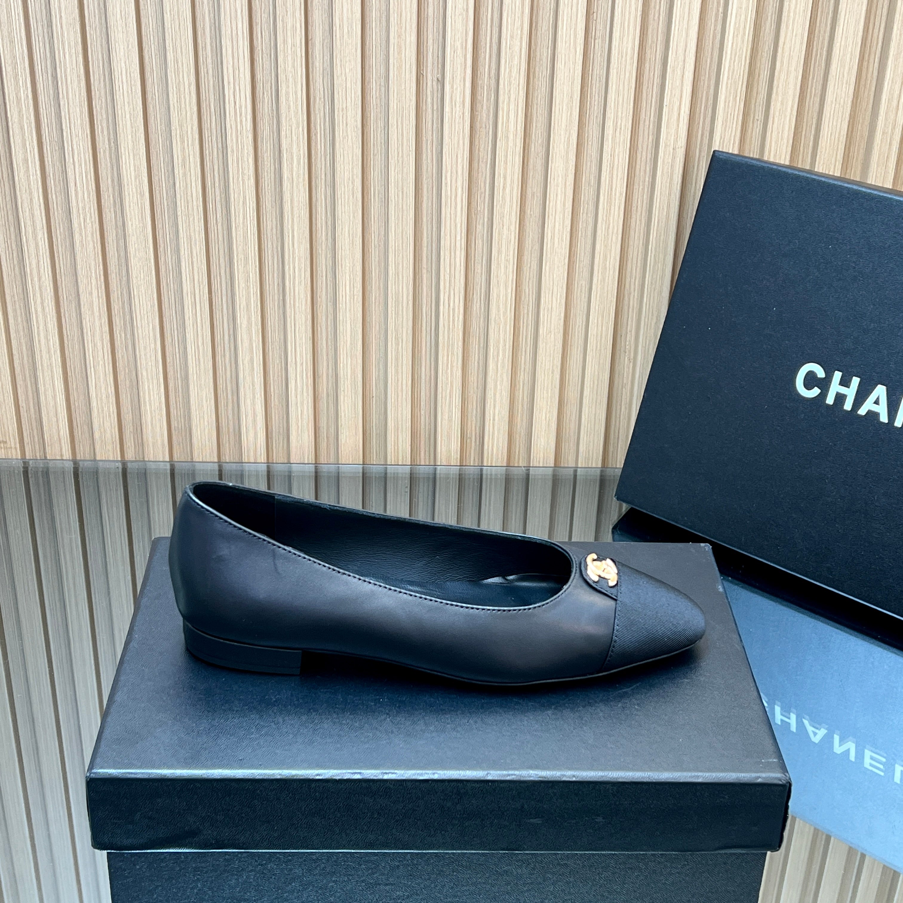 CHANEL 25S BALLET FLATS LOGO IN BLACK CALFSKIN AND CANVAS GOLD HARDWRE
