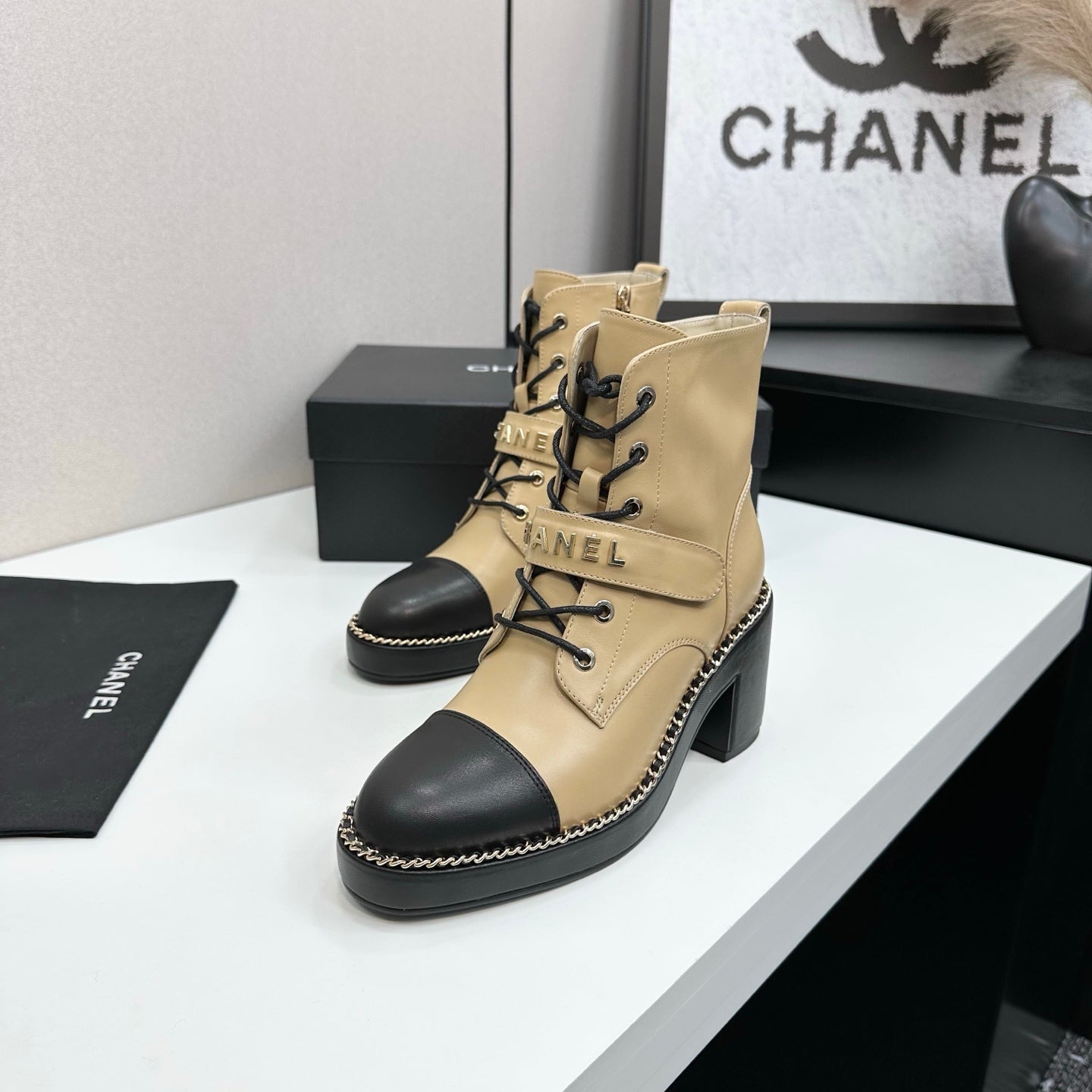 CHANEL 25S LACE-UP HEELED ANKLE BOOTS IN LIGHT GOLD CALFSKIN