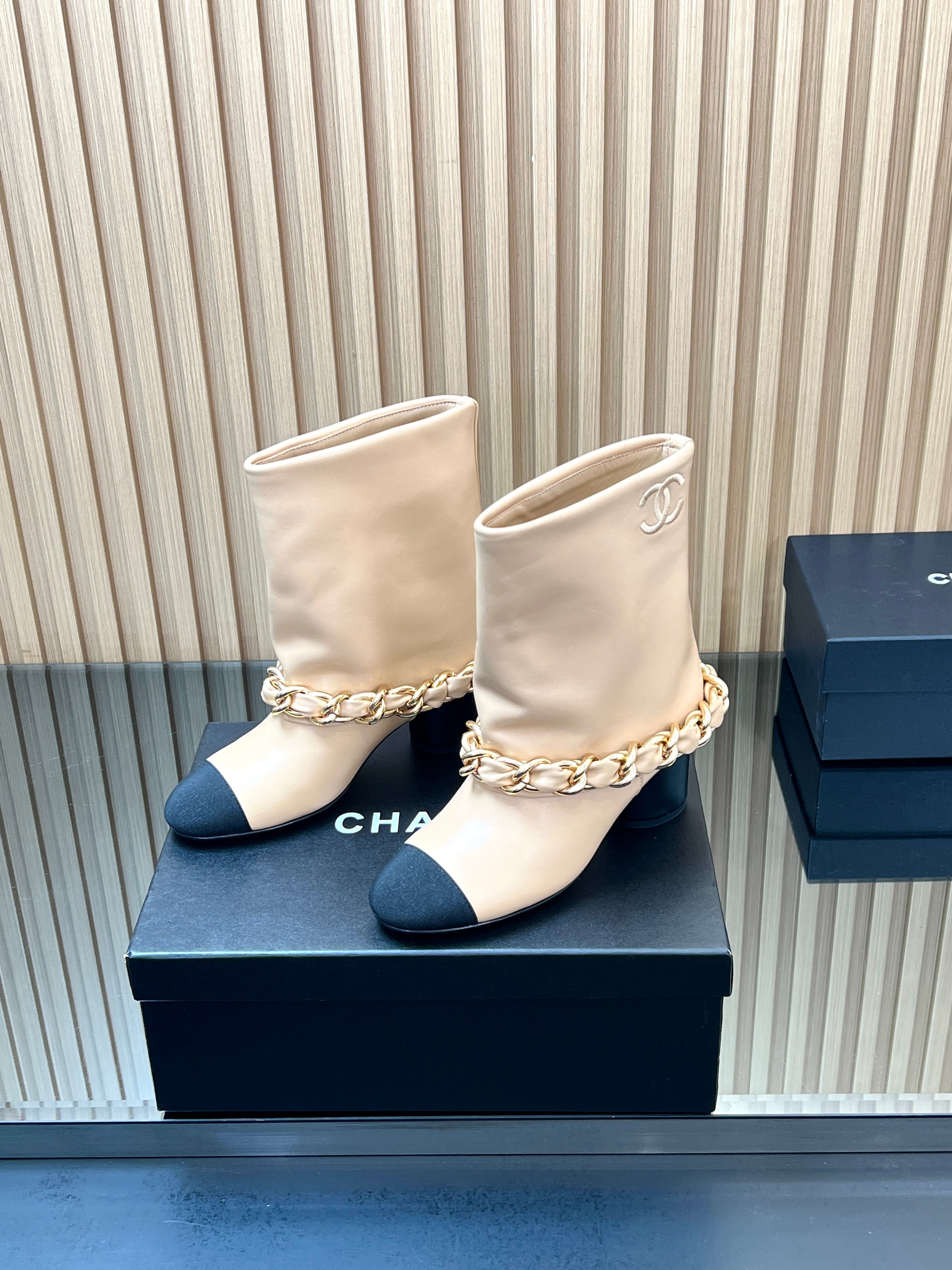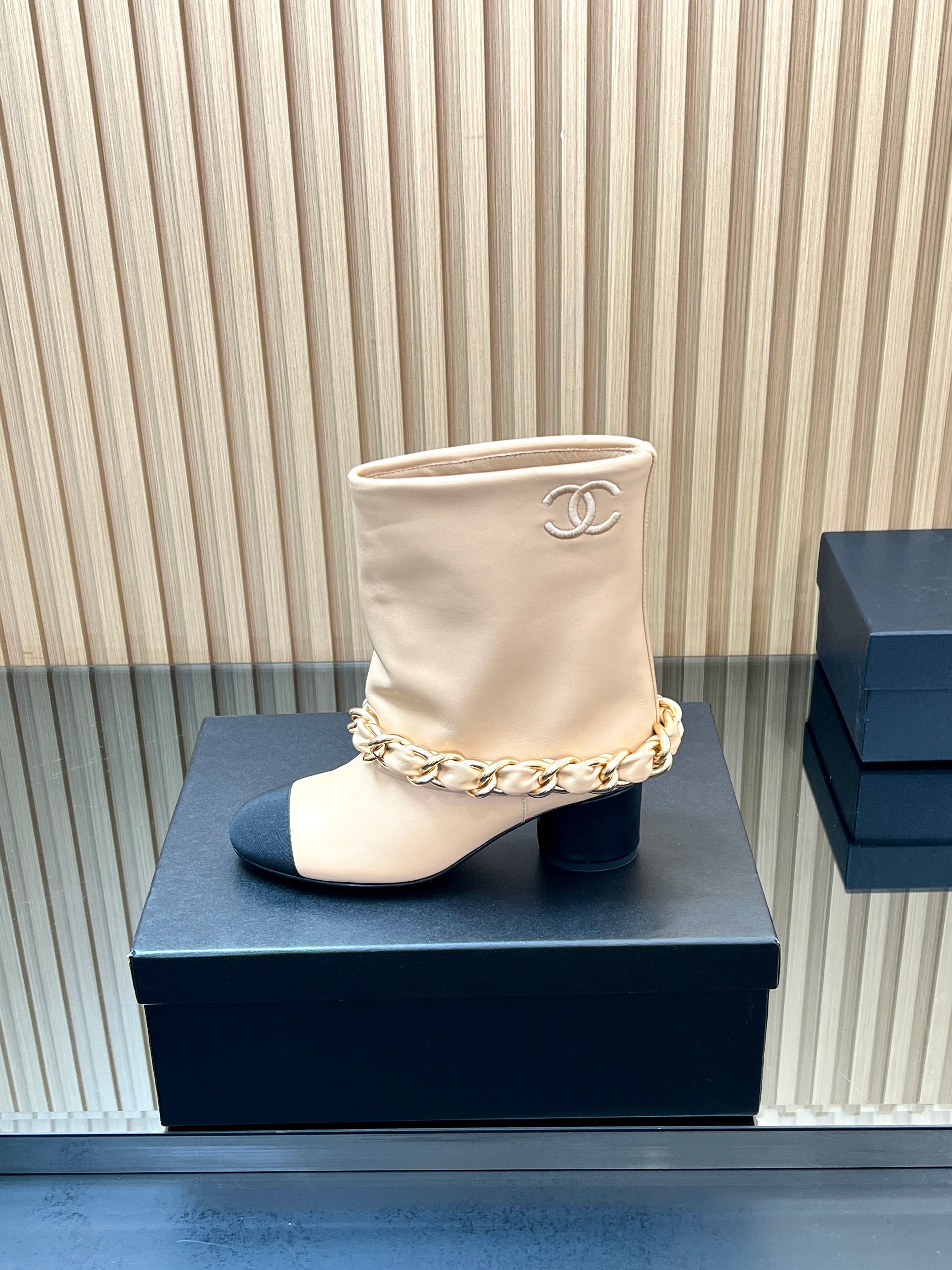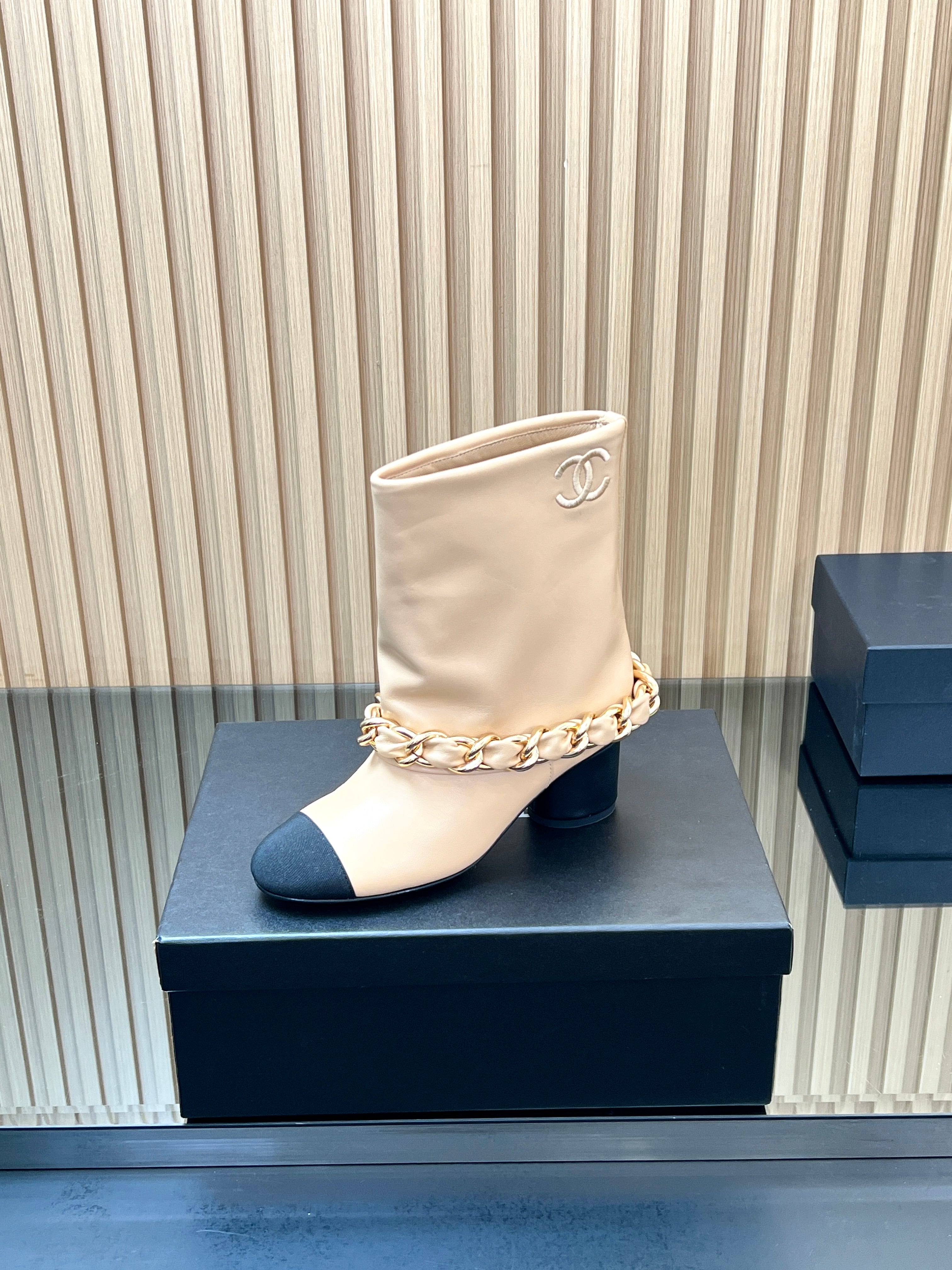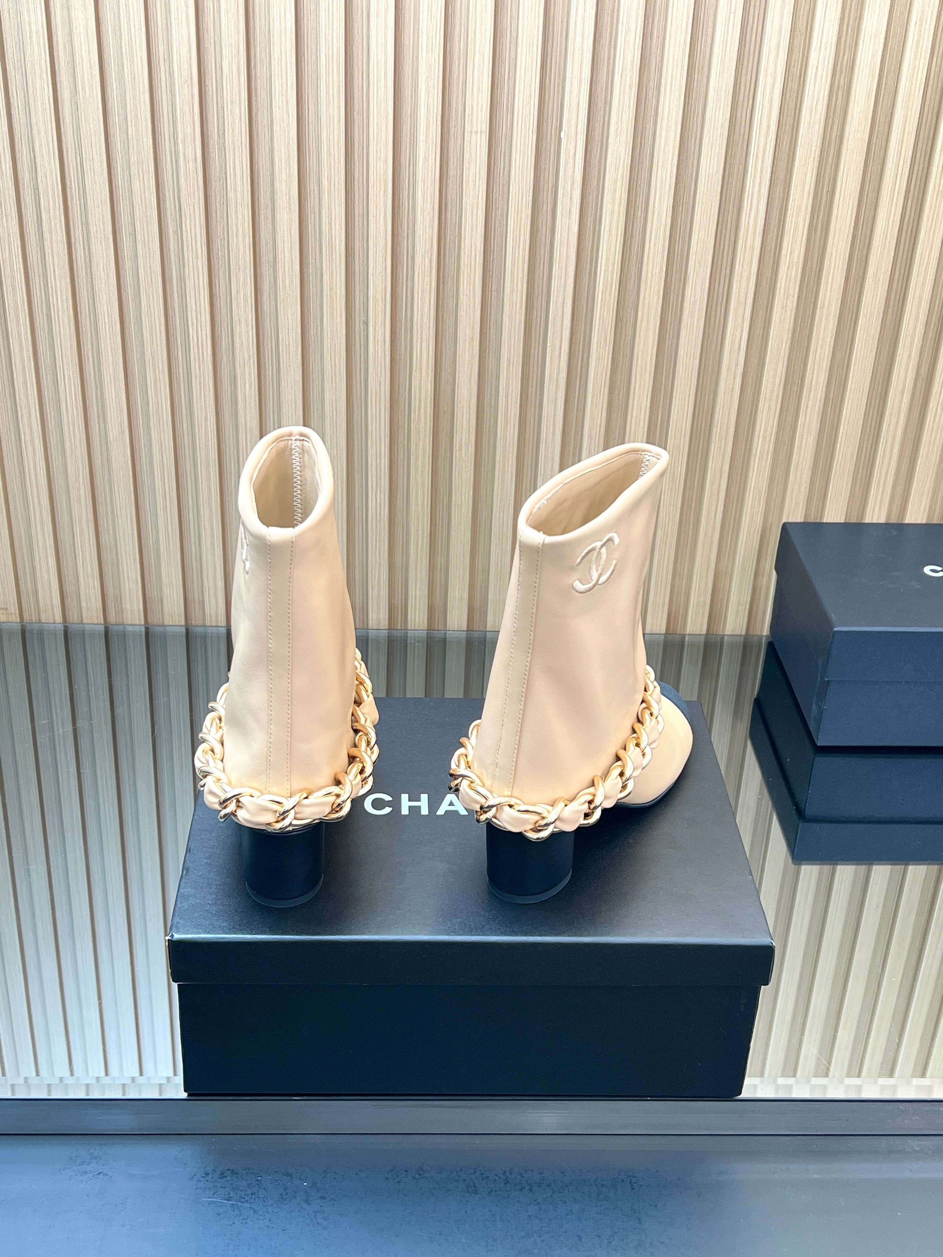 CHANEL 25S LOW BOOTS 65MM IN BEIGE CALFSKIN GOLD HARDWRE