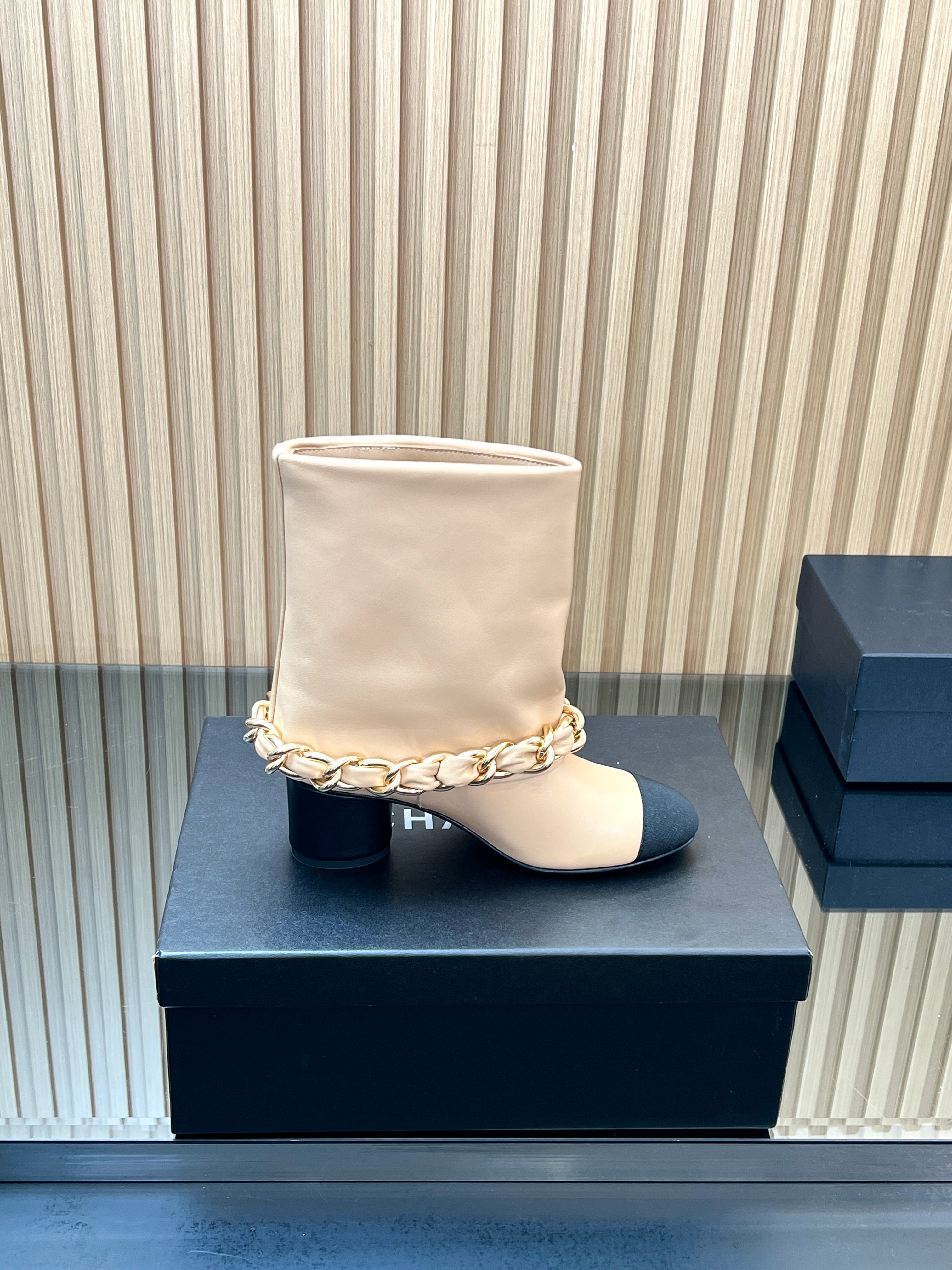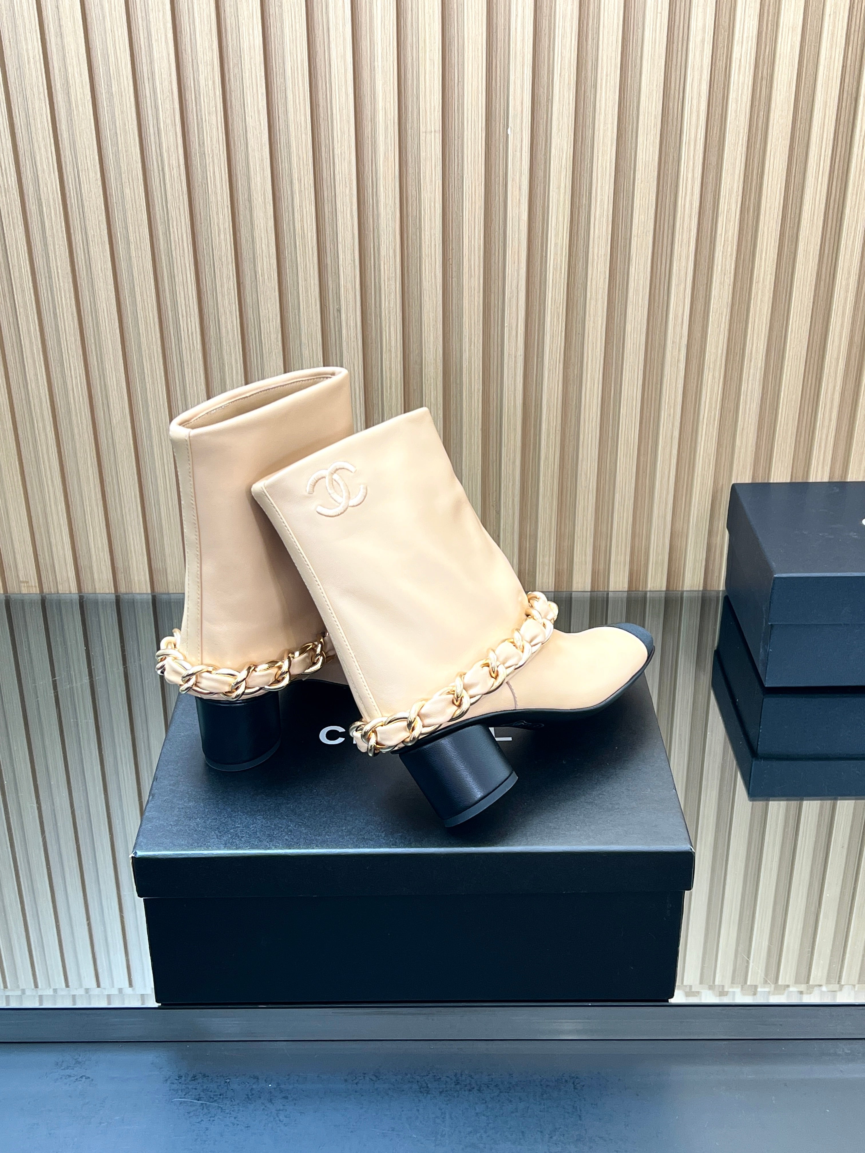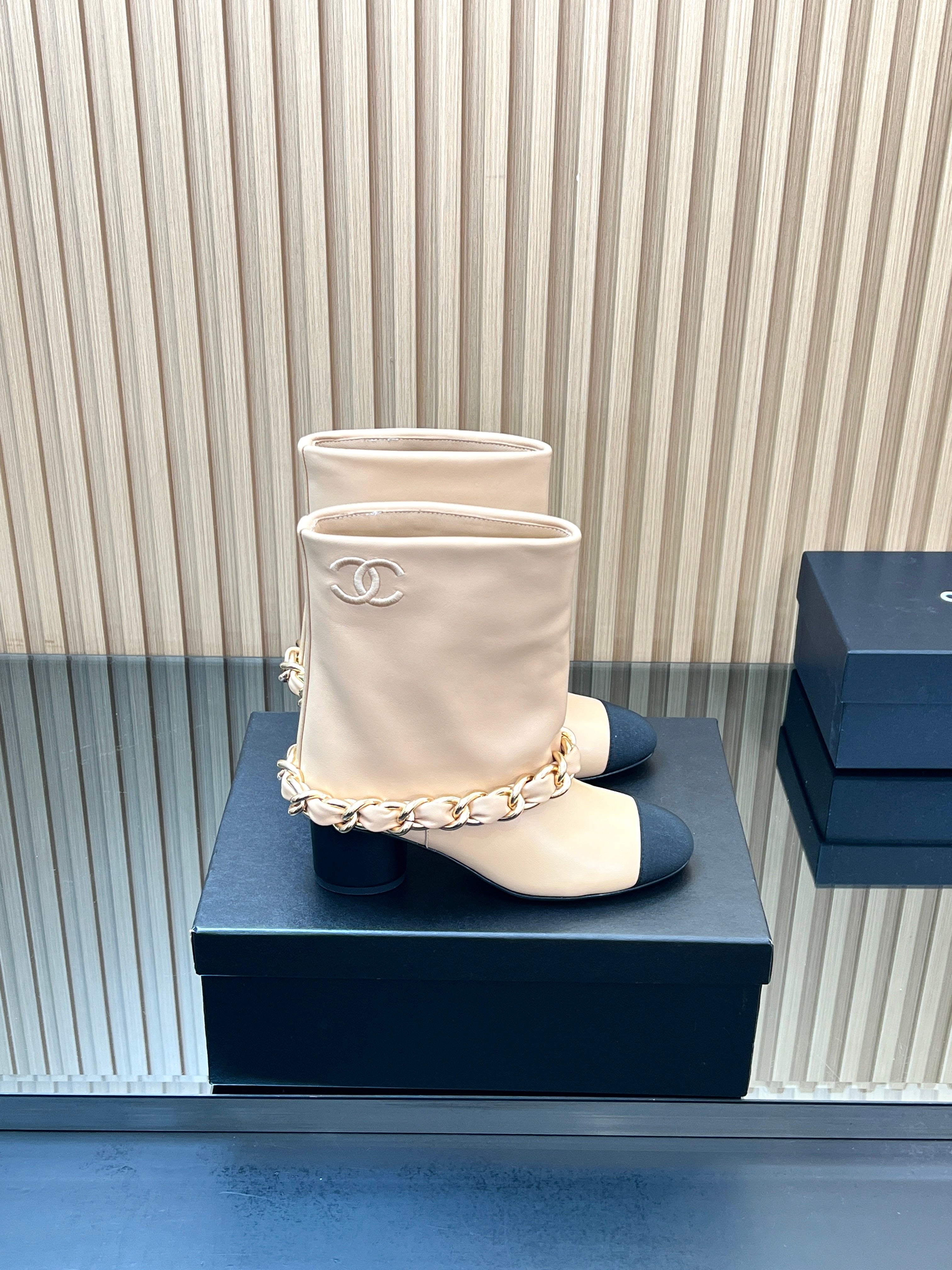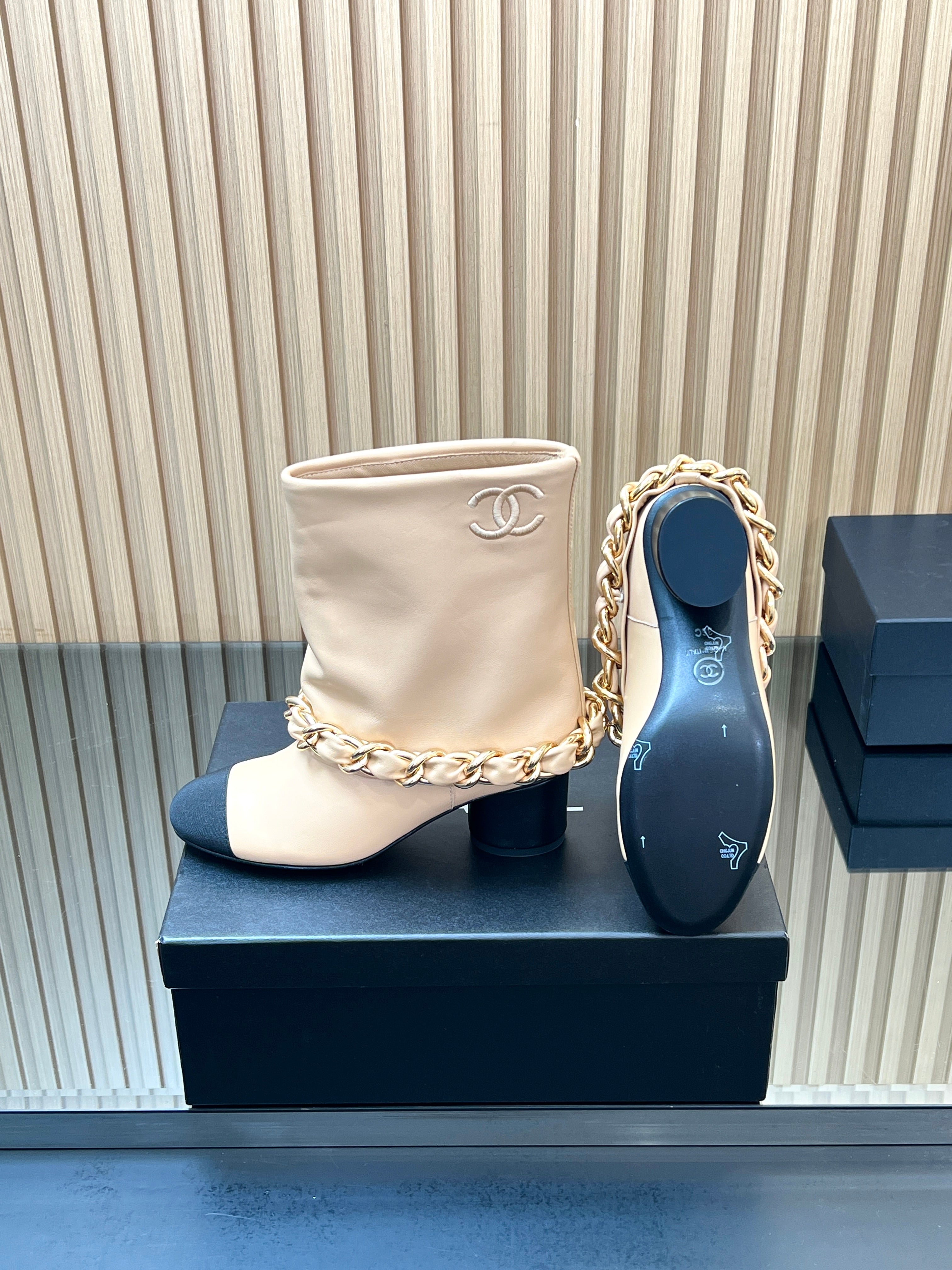 CHANEL 25S LOW BOOTS 65MM IN BEIGE CALFSKIN GOLD HARDWRE