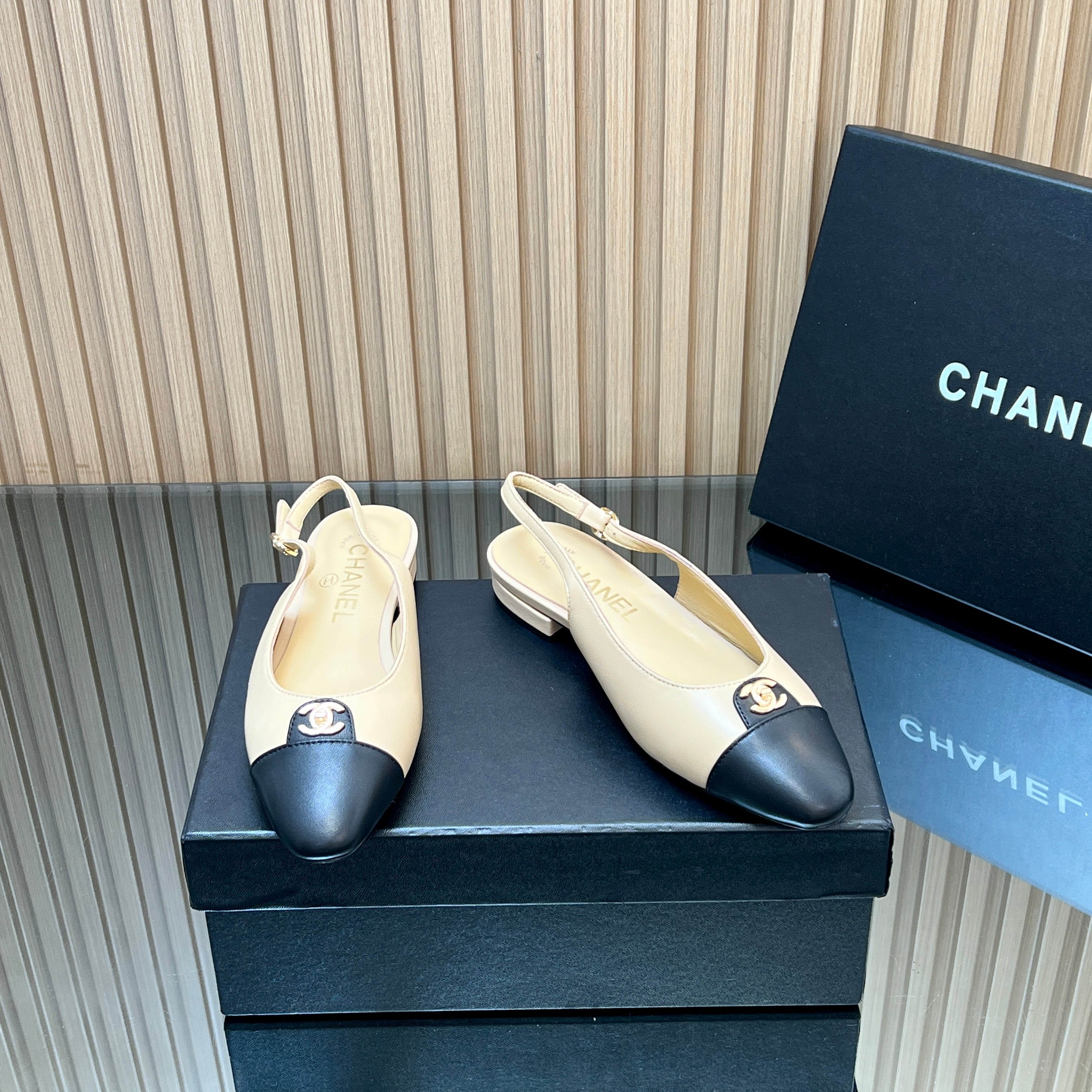 CHANEL 25S SLINGBACK FLATS IN BEIGE CALFSKIN GOLD HARDWRE