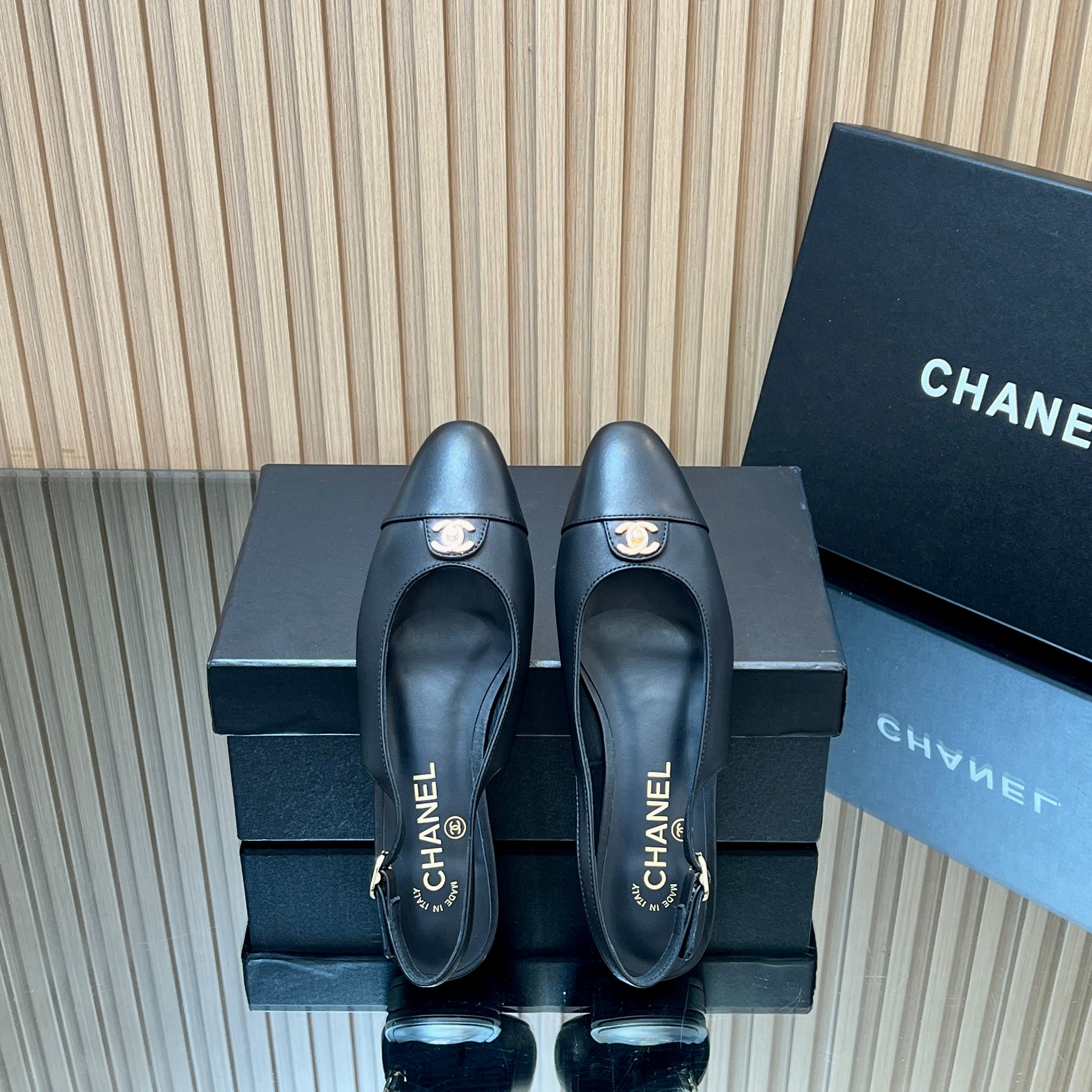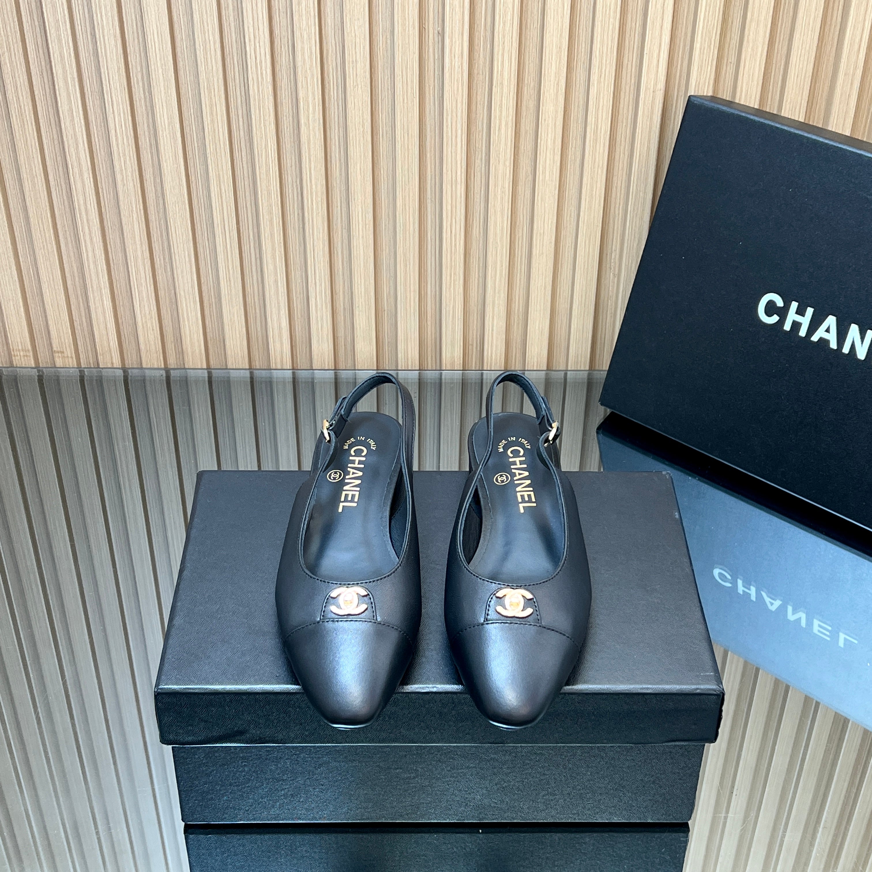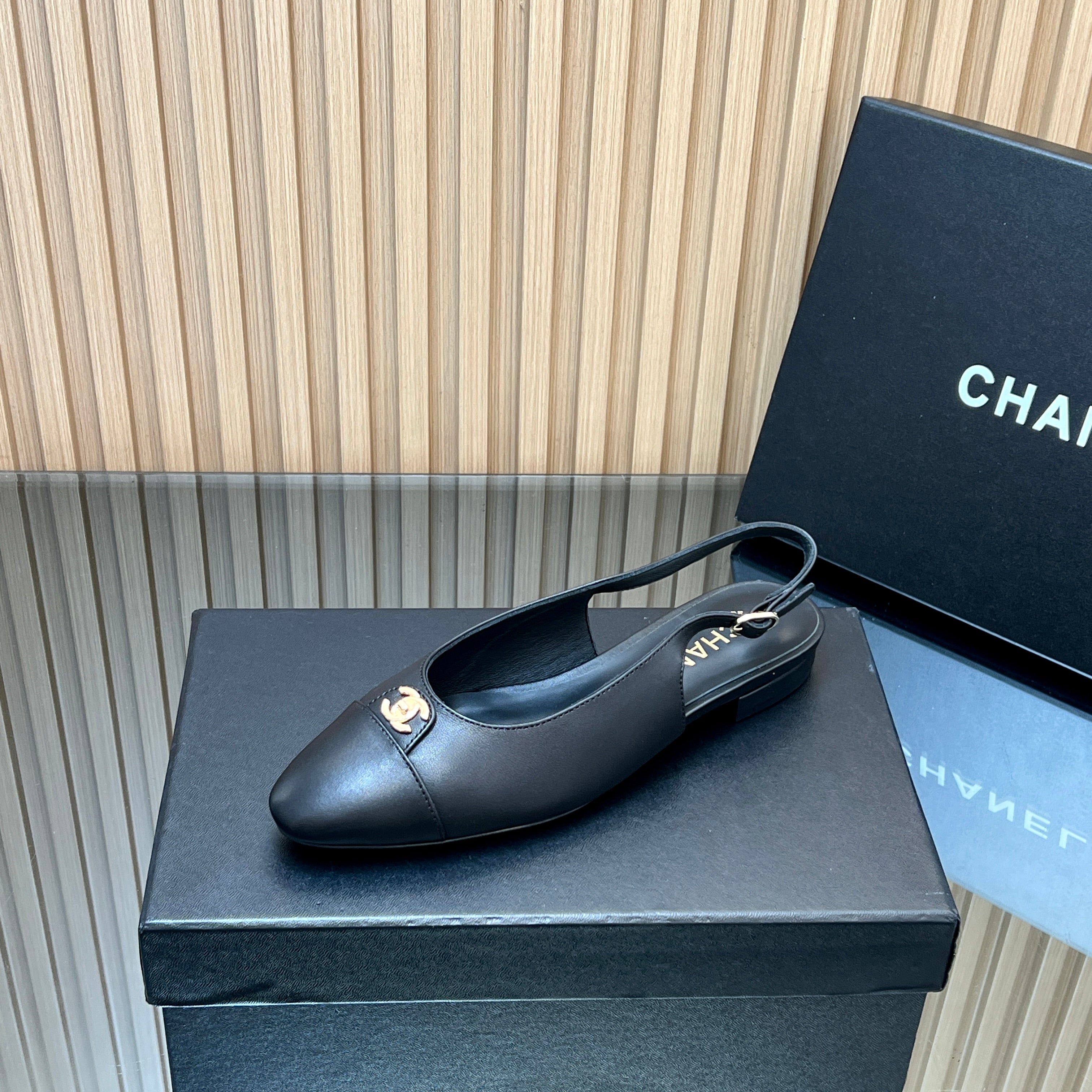 CHANEL 25S SLINGBACK FLATS IN BLACK CALFSKIN GOLD HARDWRE