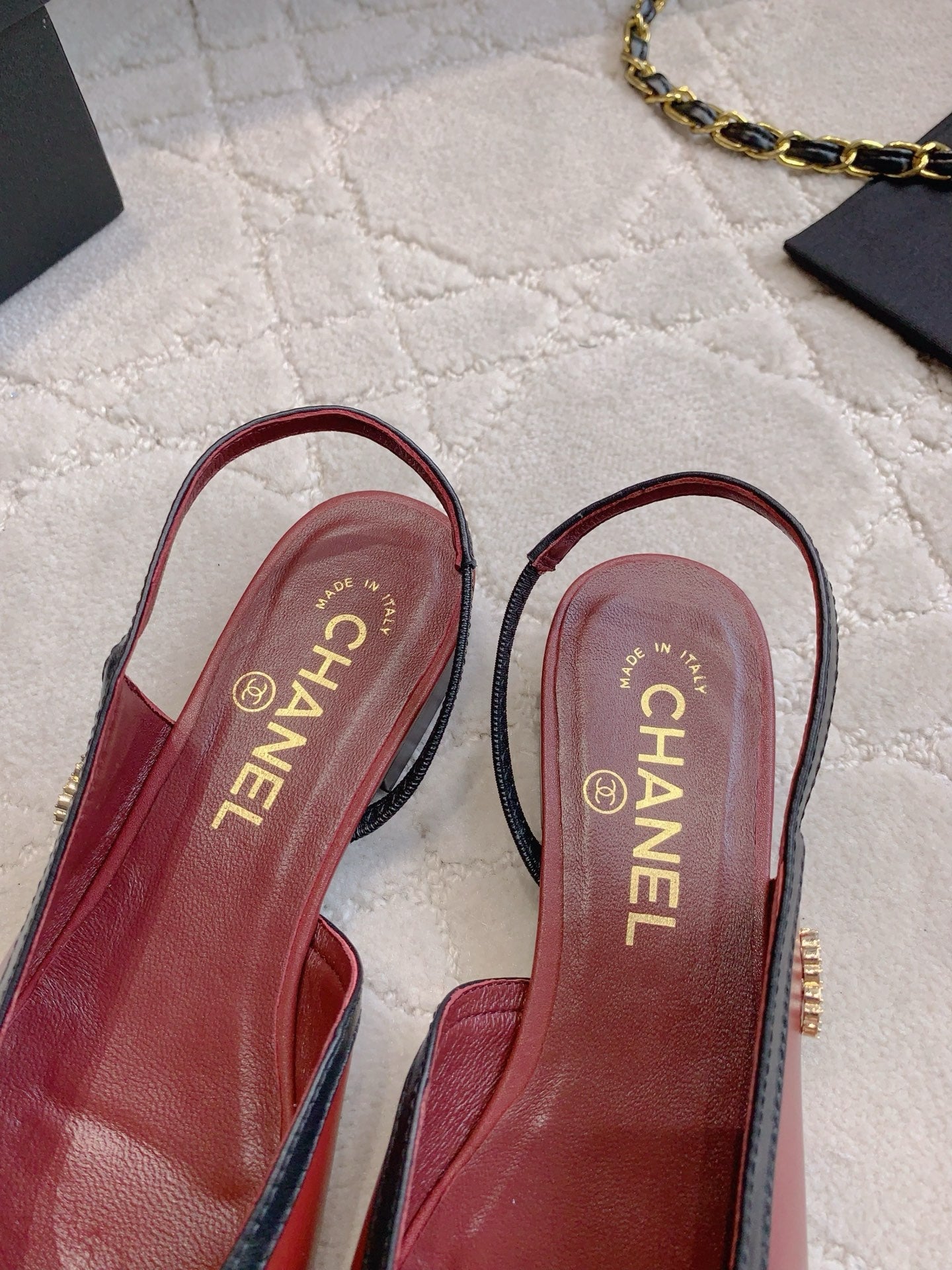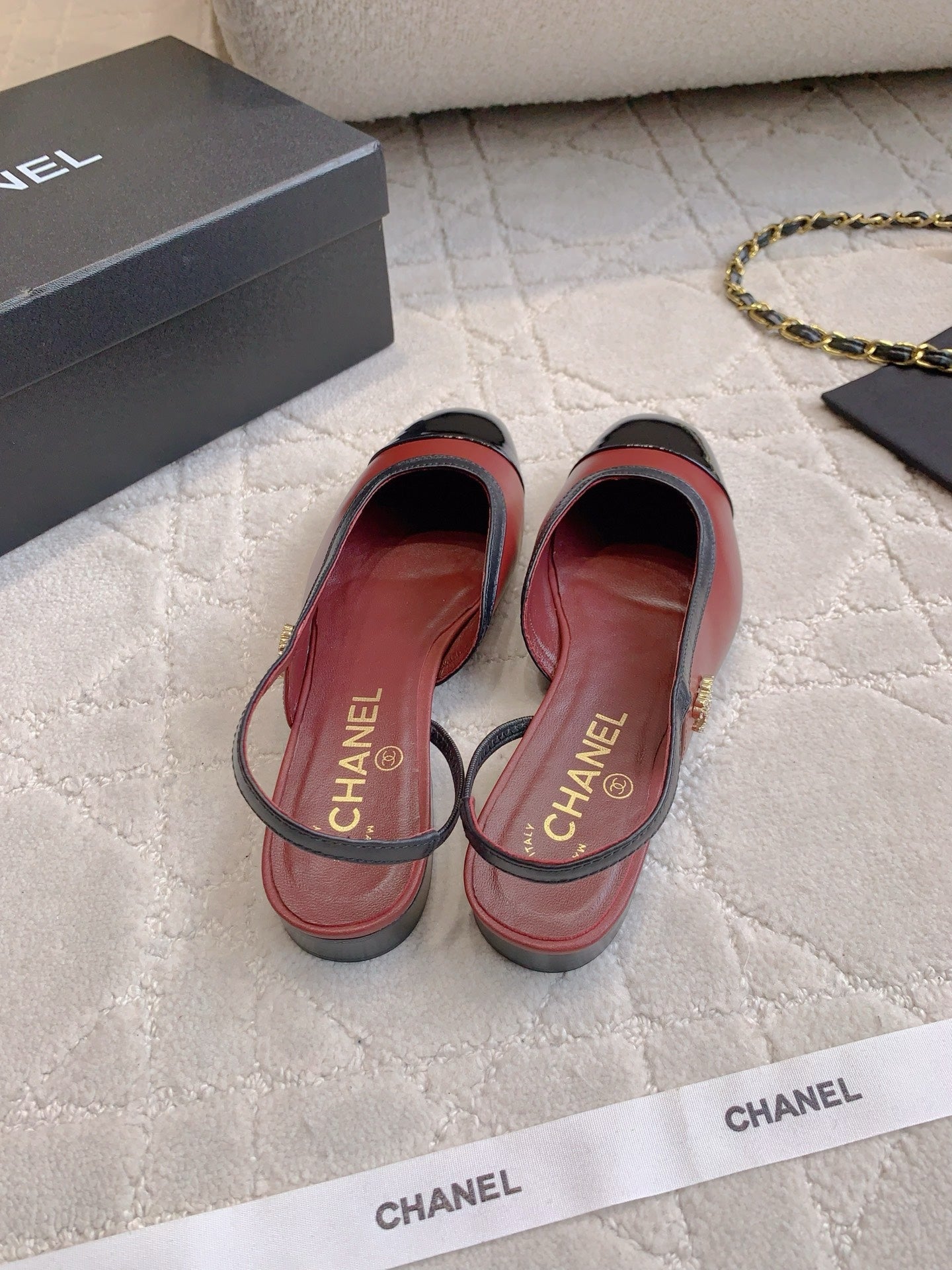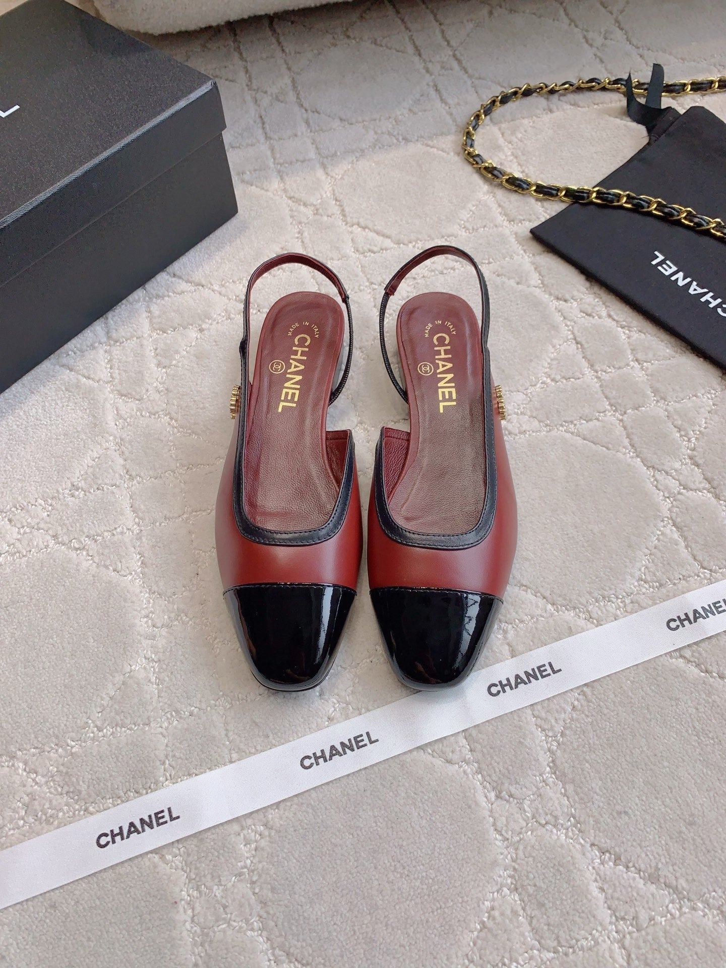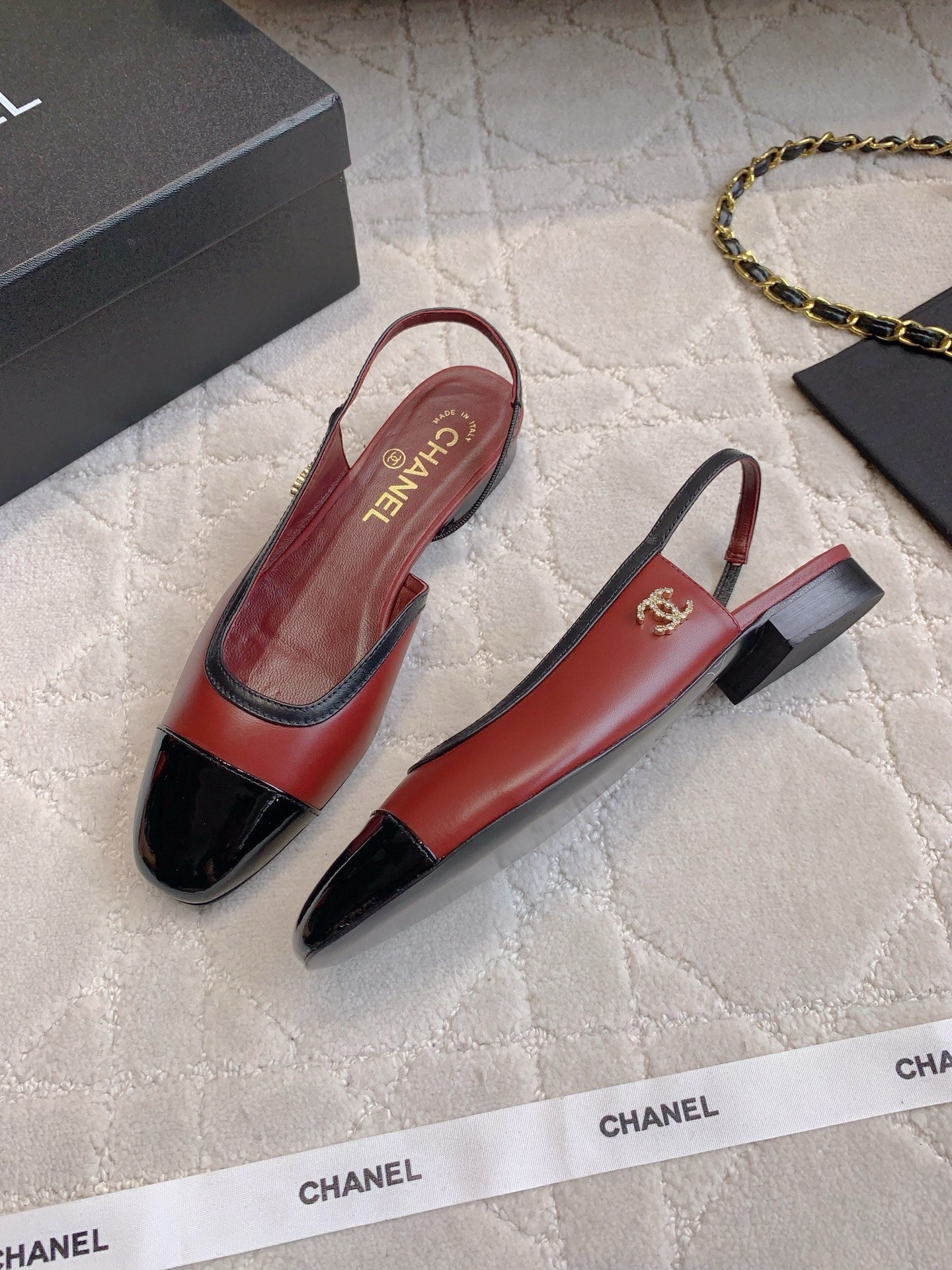 CHANEL 25S SLINGBACK IN BLACK AND ROSEWOOD CALFSKIN GOLD HARDWARE