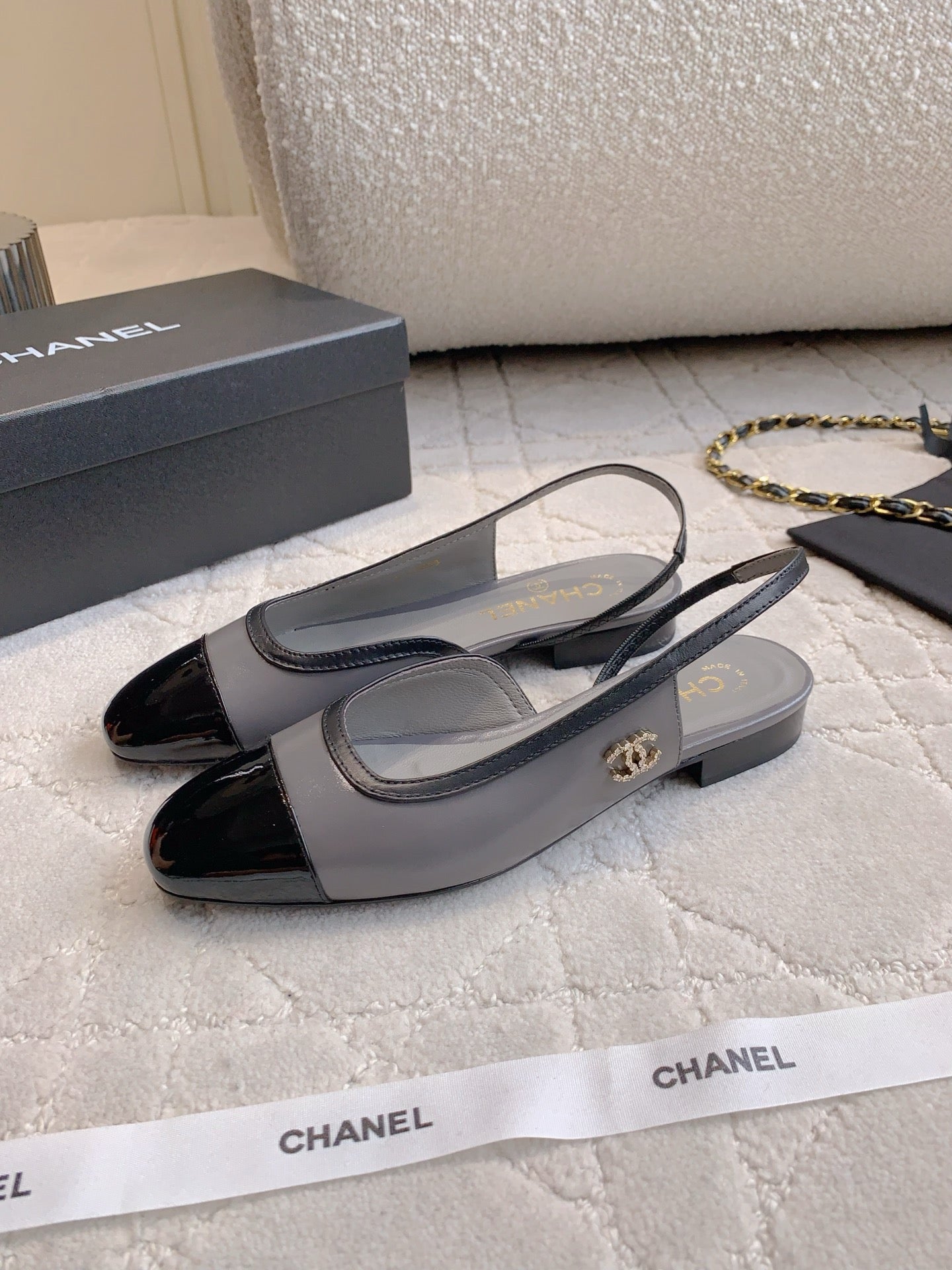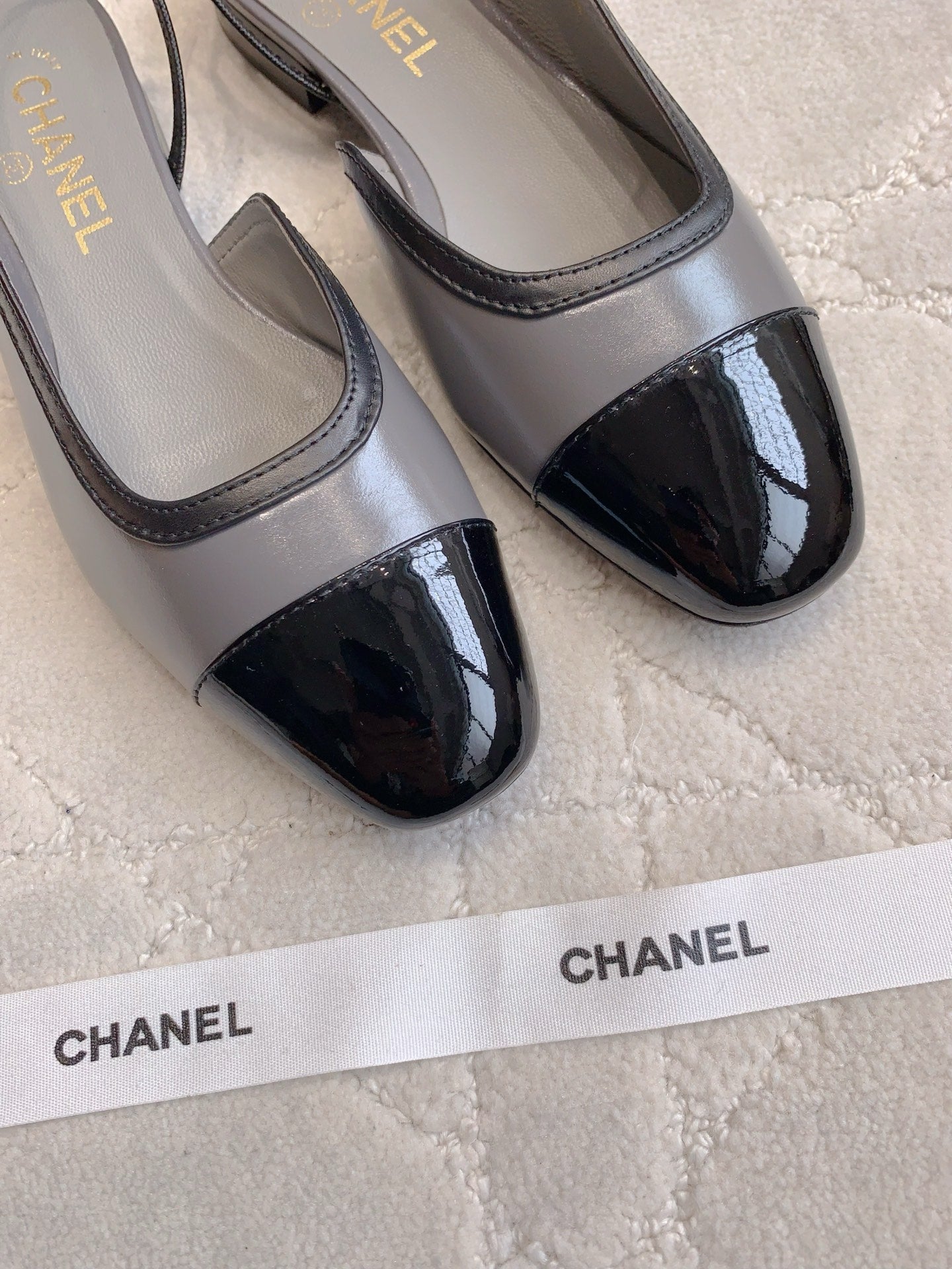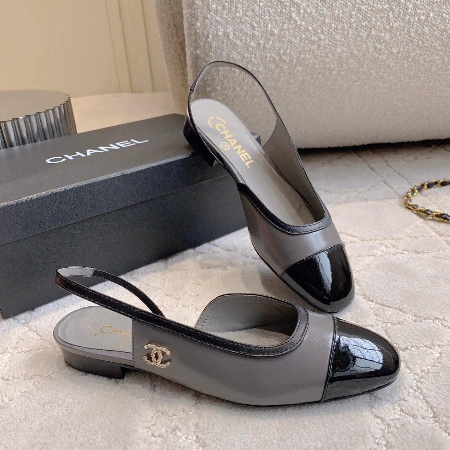 CHANEL 25S SLINGBACK IN BLACK AND TAUPE GRAY CALFSKIN GOLD HARDWARE