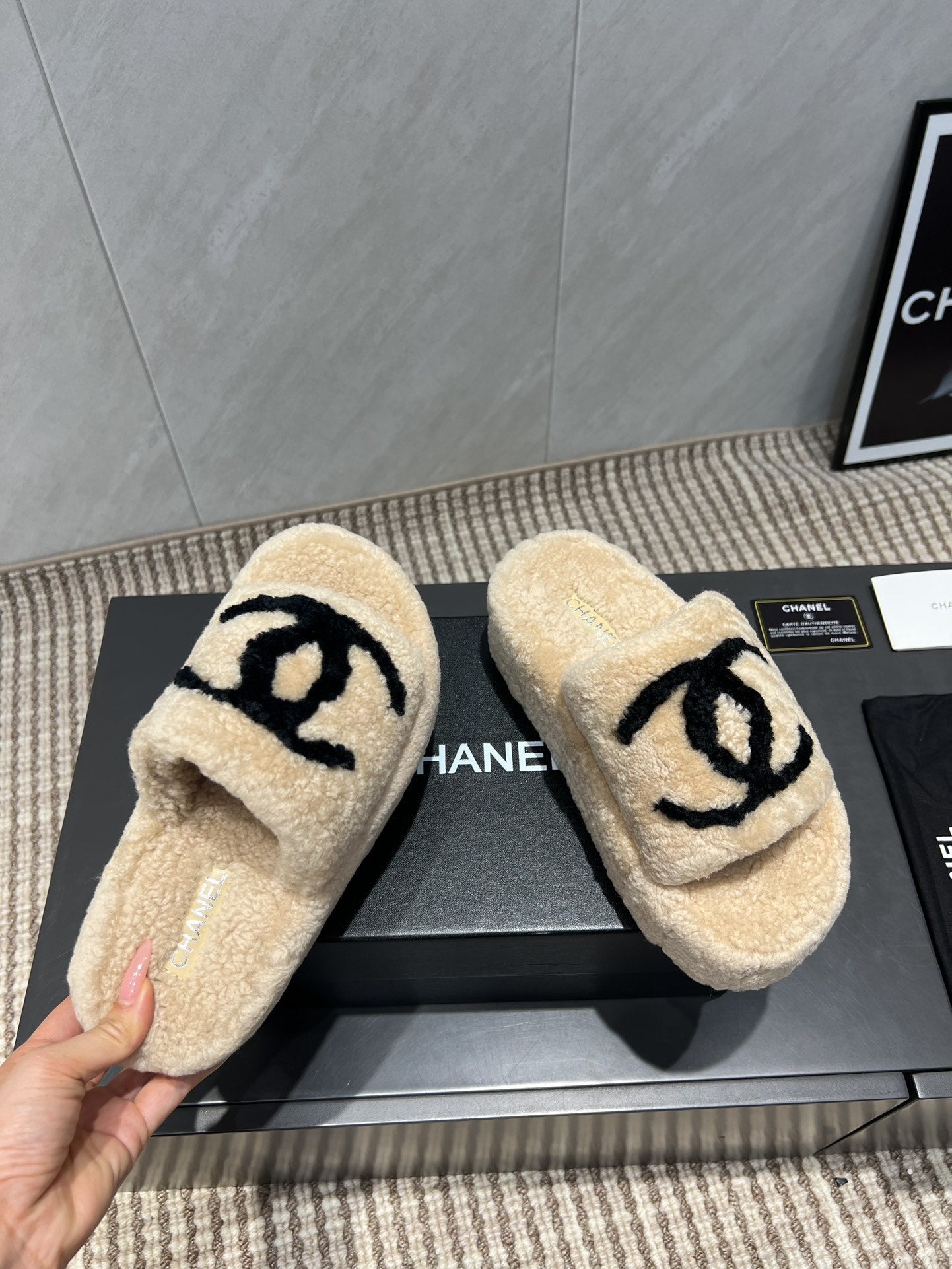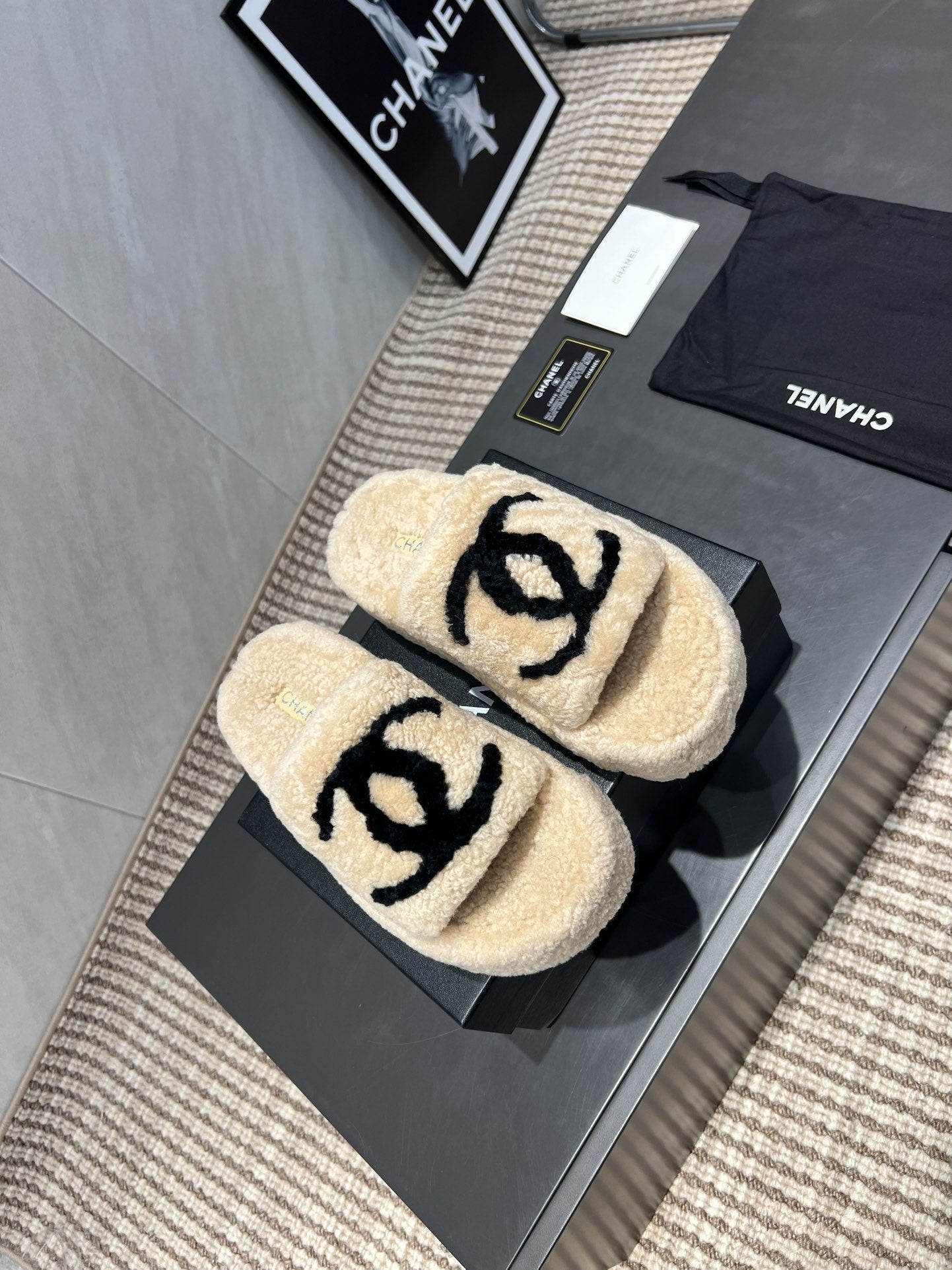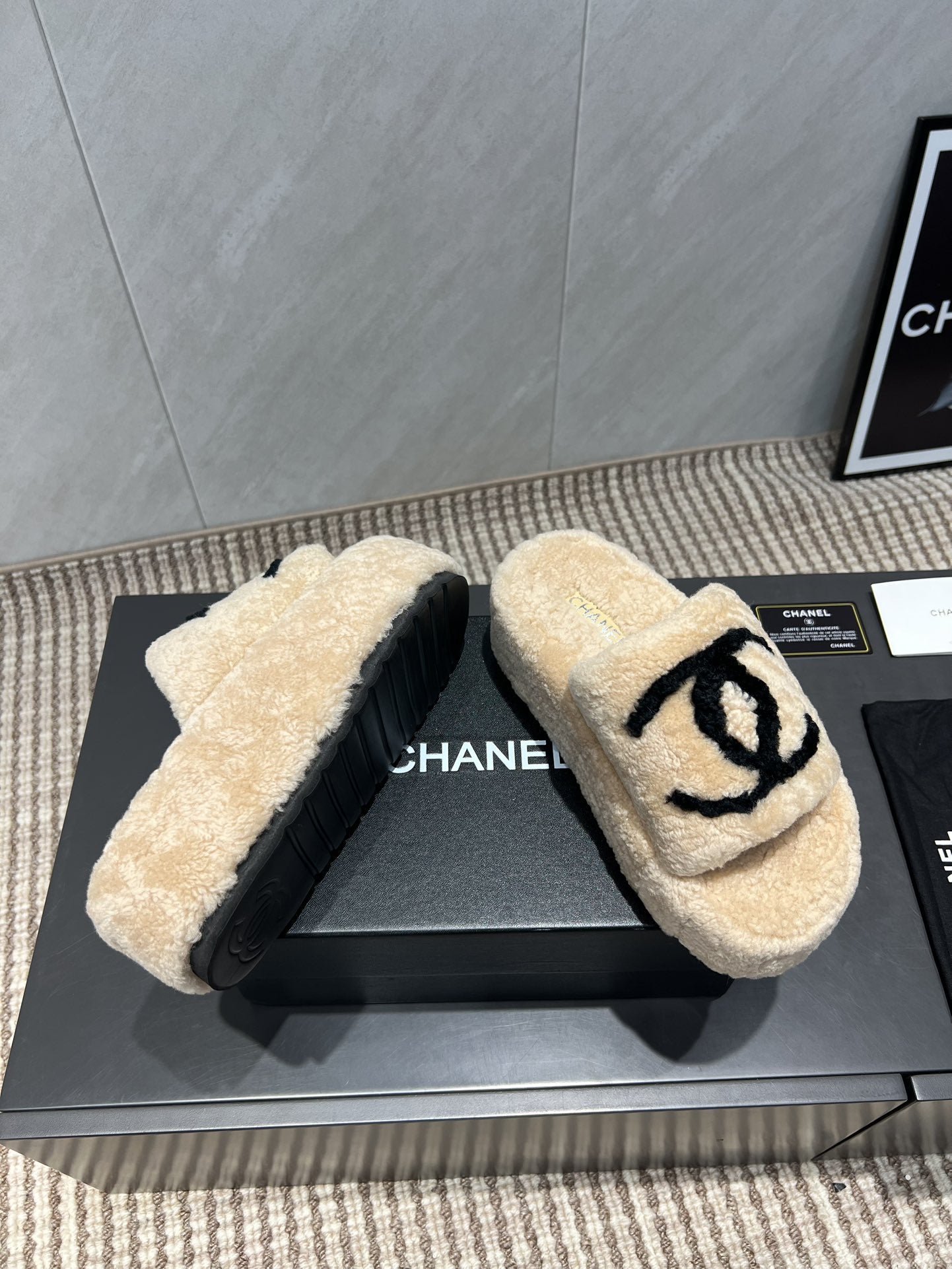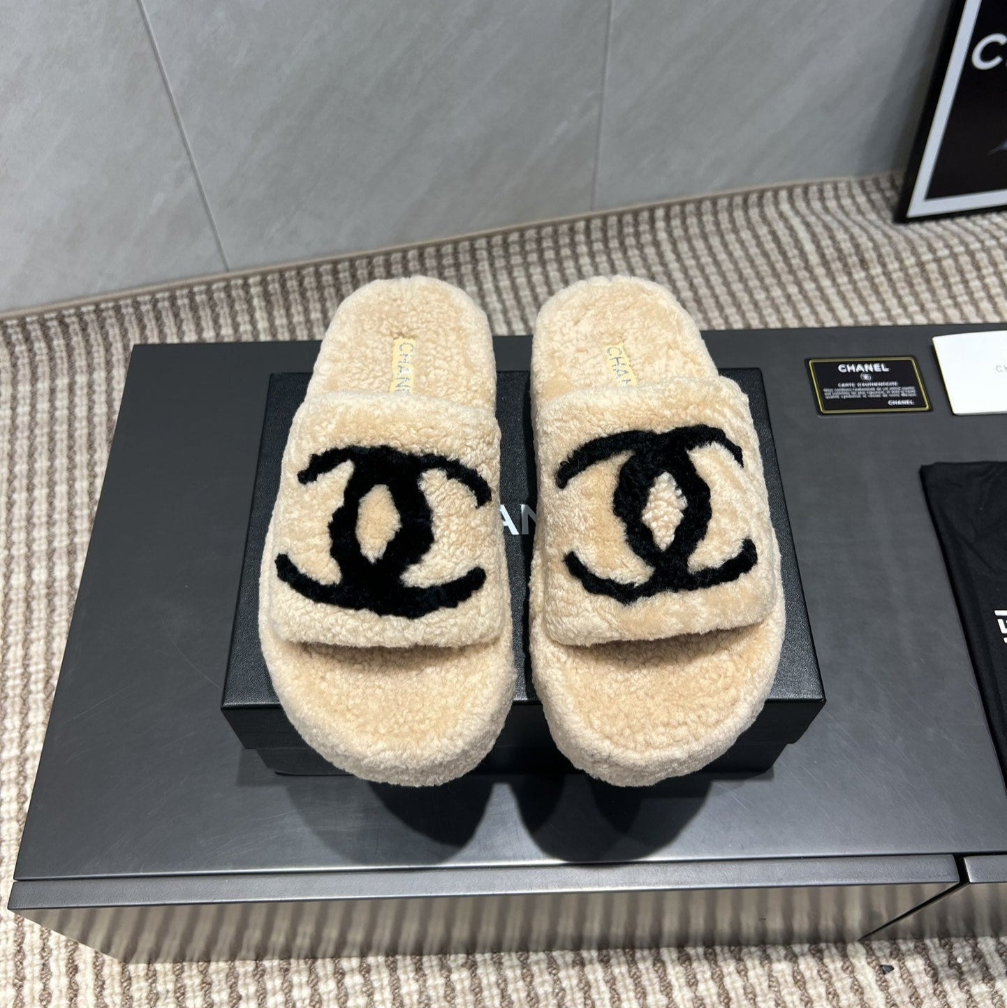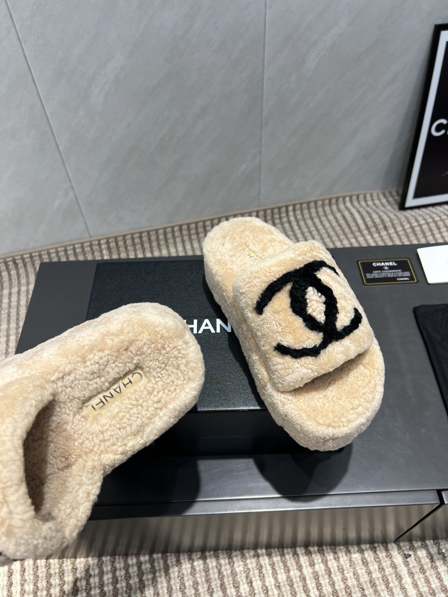 CHANEL 25S SLIPPERS THICK SOLED WITH EMBROIDERED LOGO IN BEIGE FUR