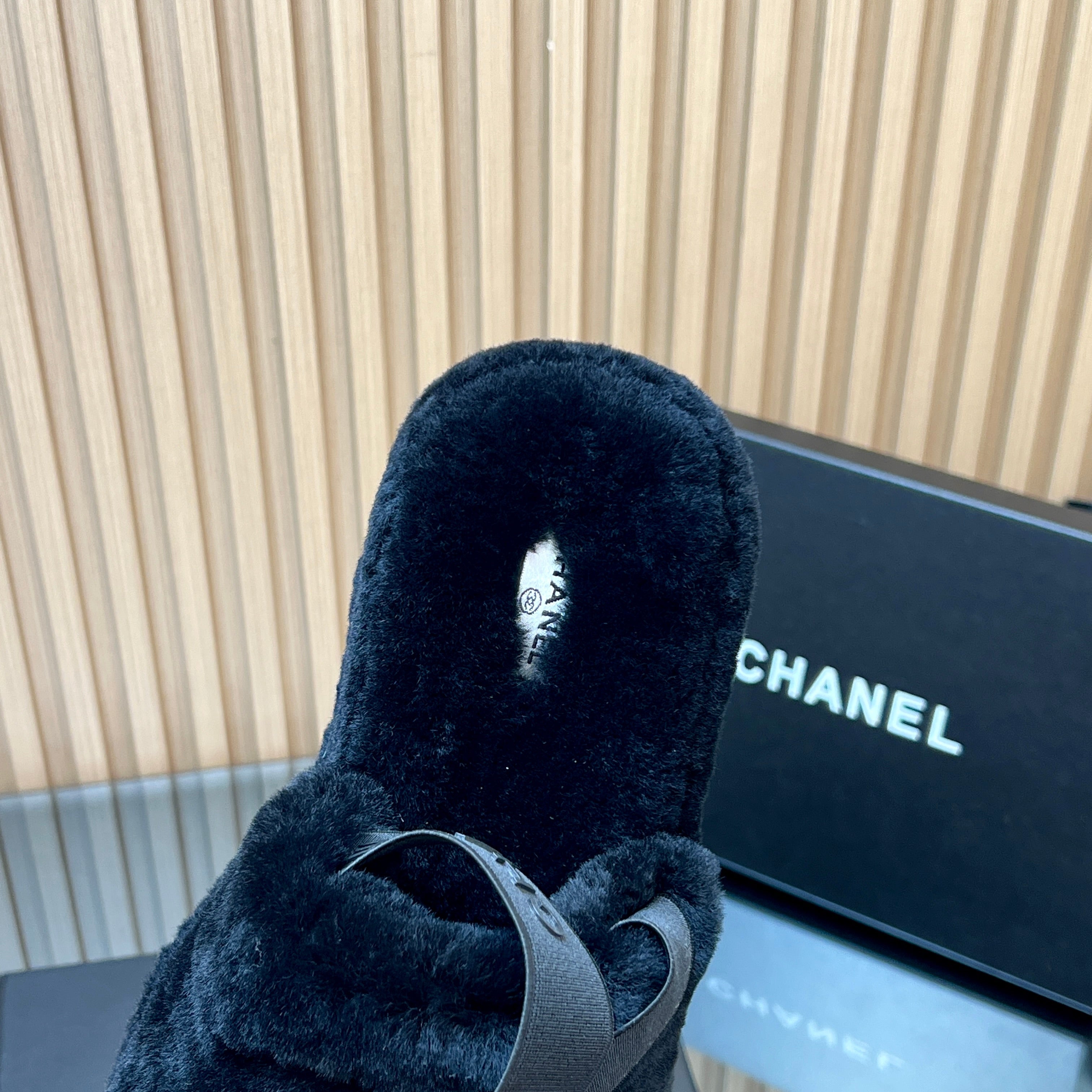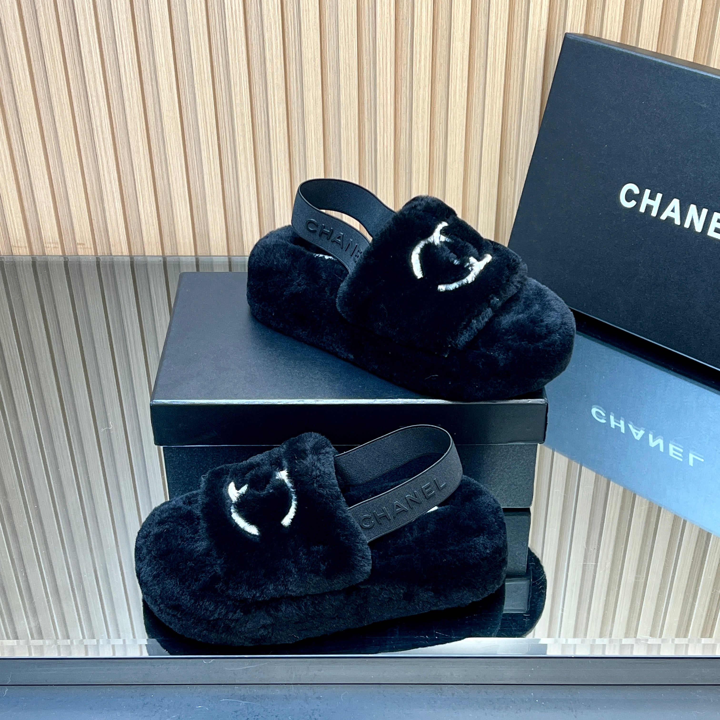 CHANEL 25S THICK-SOLED FURRY SLIPPERS WITH ELASTIC STRAPS IN BLACK FUR