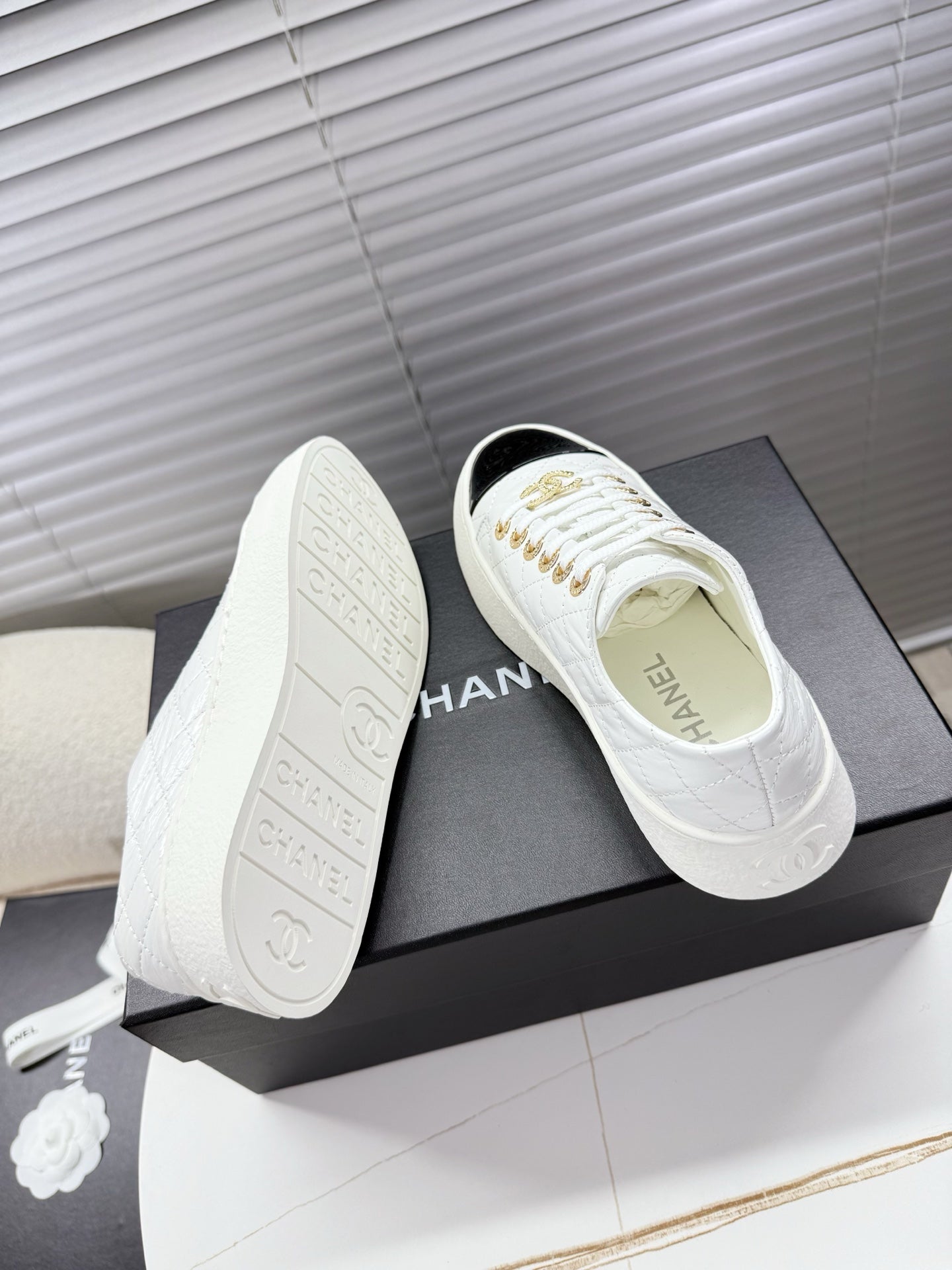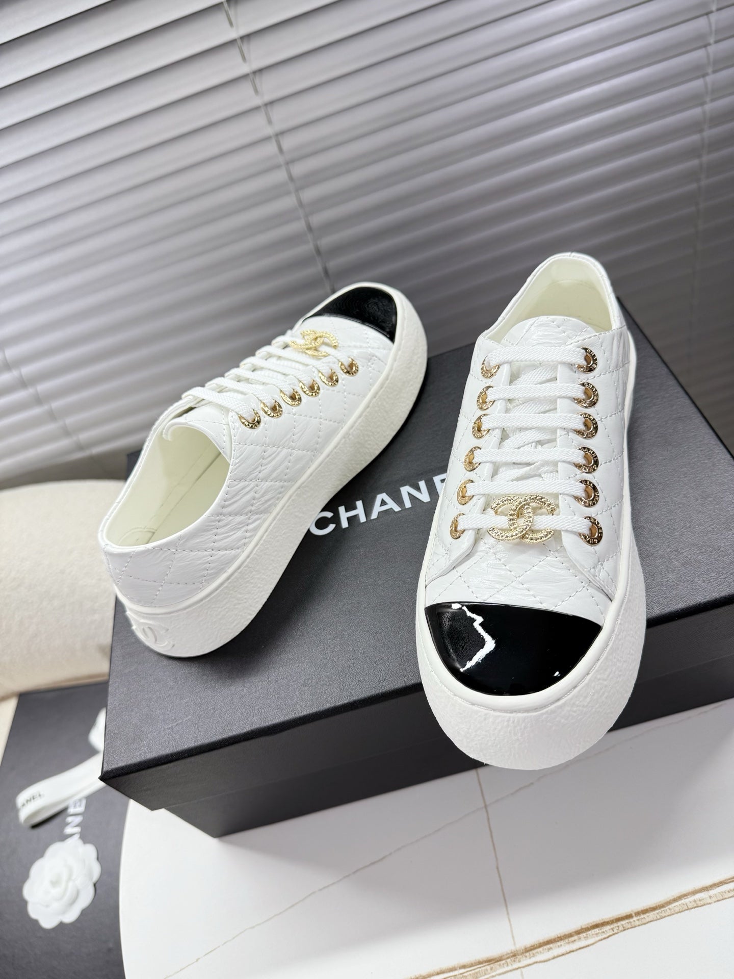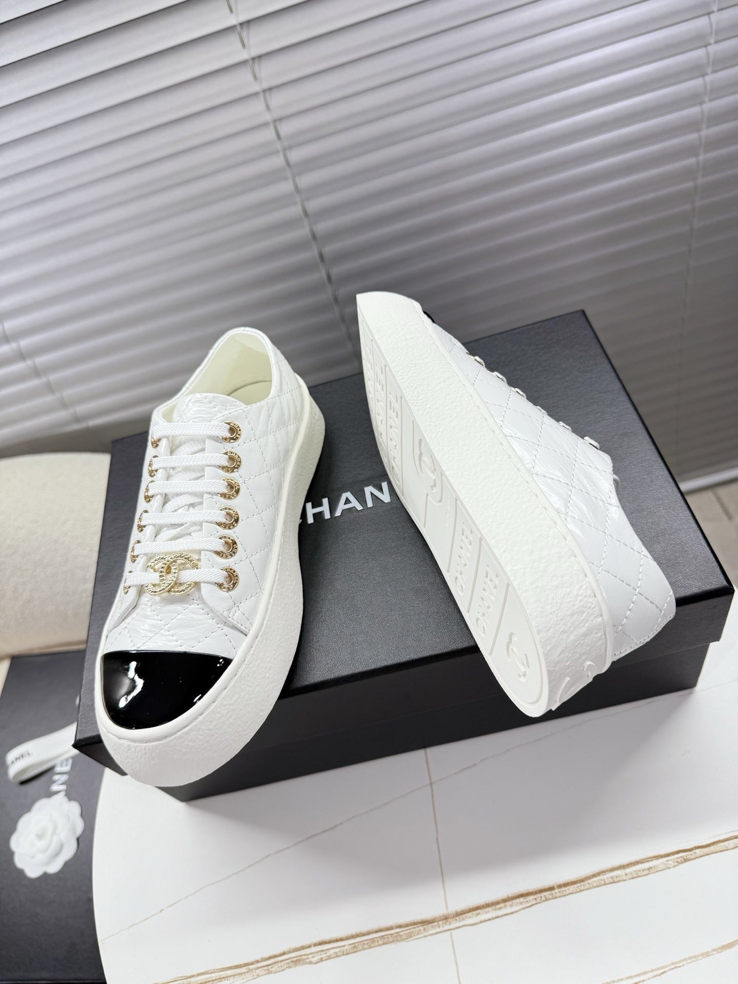 CHANEL 25S TRAINERS WHITE AND BLACK 35MM IN CALFSKIN