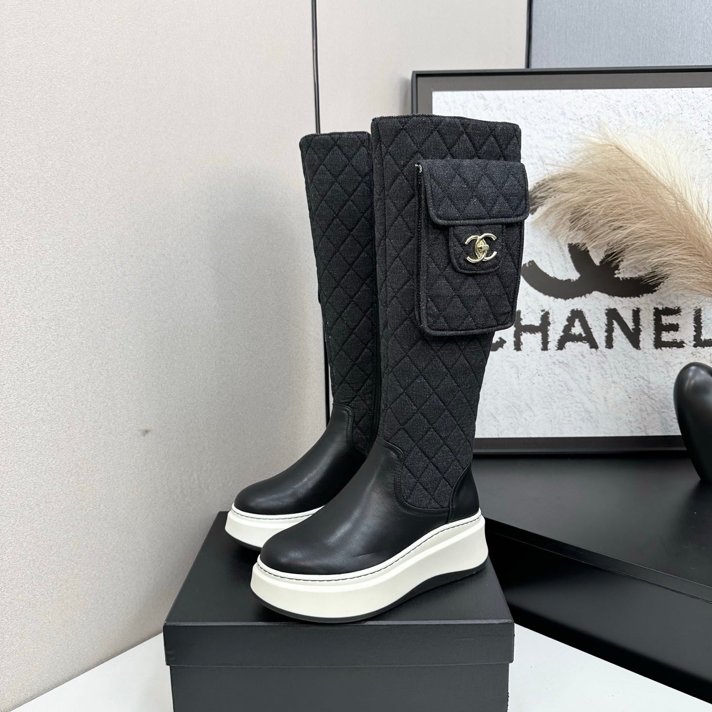 CHANEL 25S WEDGE KNEE-HIGH BOOTS IN BLACK CALFSKIN AND DENIM