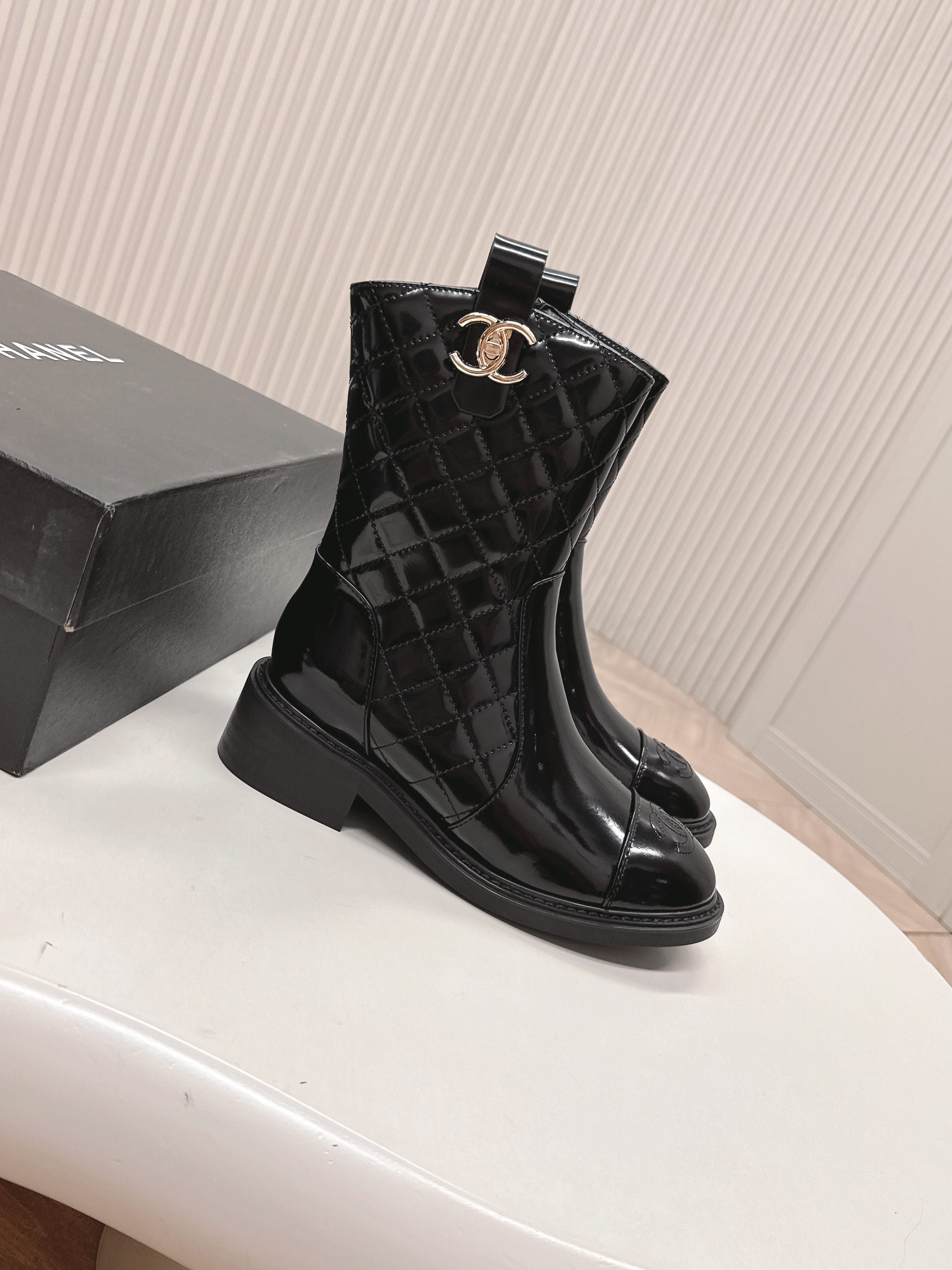 CHANEL ANKLE BOOTS 25S IN BLACK GLOSSY LAMBSKIN WITH GOLD HARDWARE