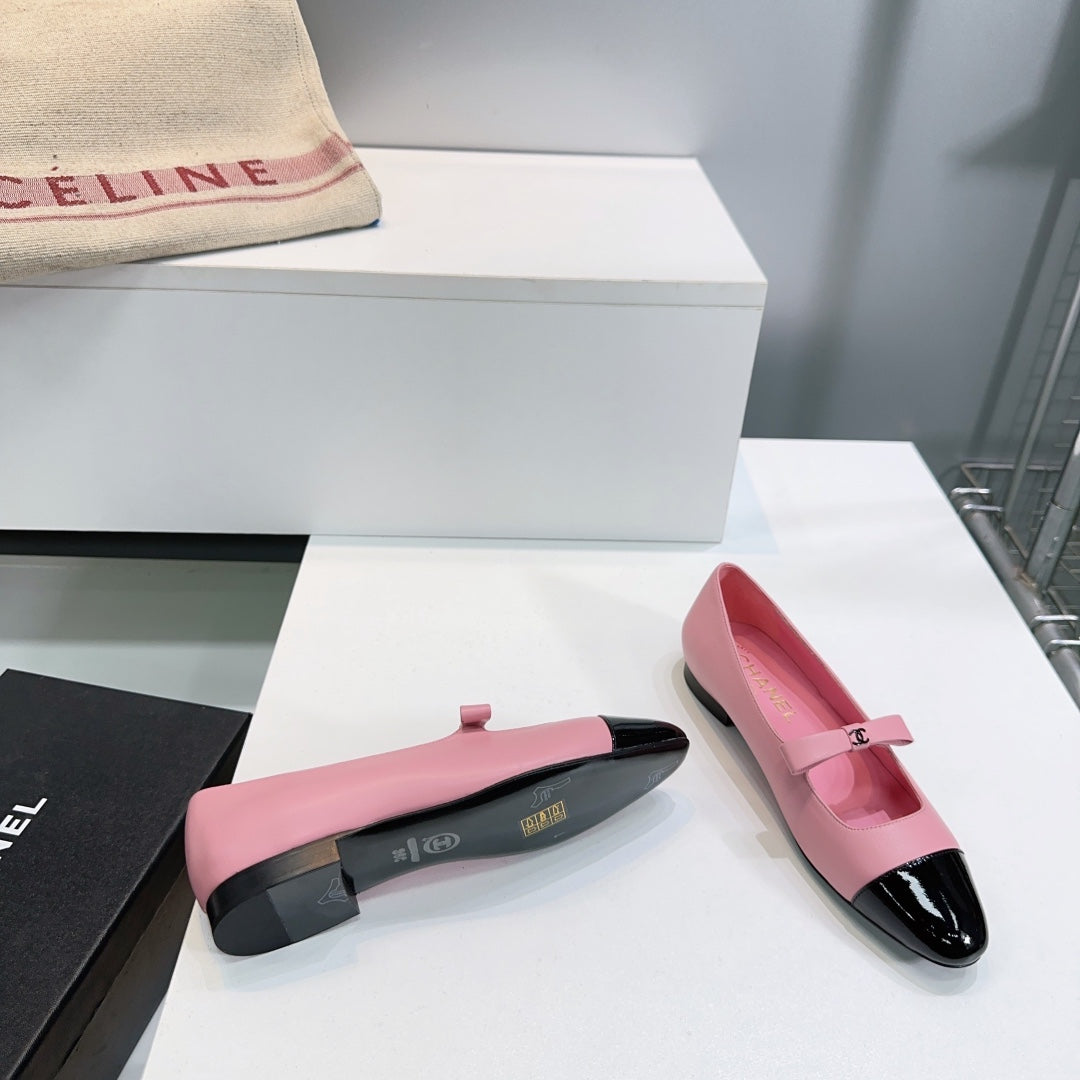 CHANEL FLAT MARY JANE SHOES 25S IN PINK LAMBSKIN MIX BLACK GLOSSY WITH BOW