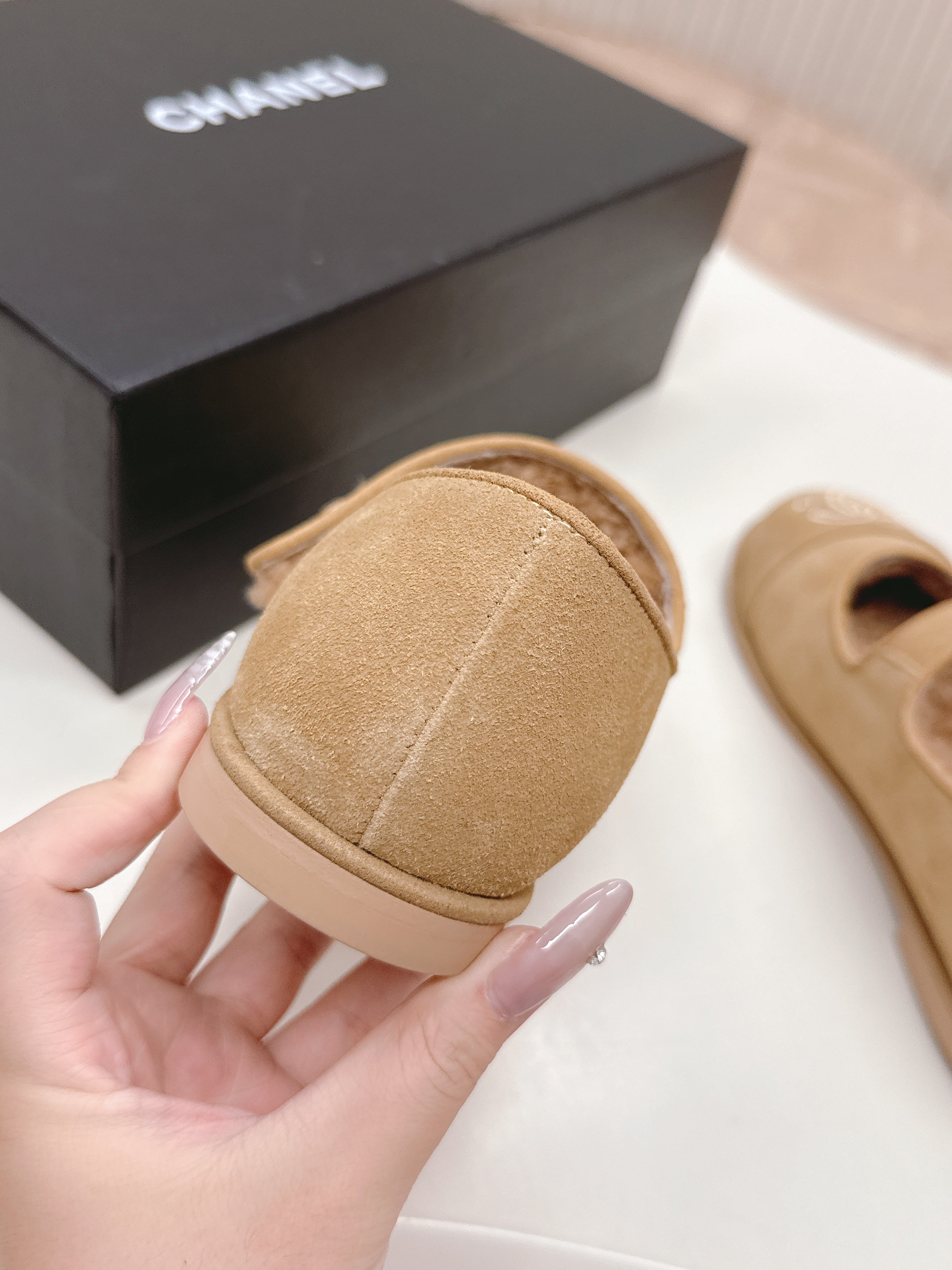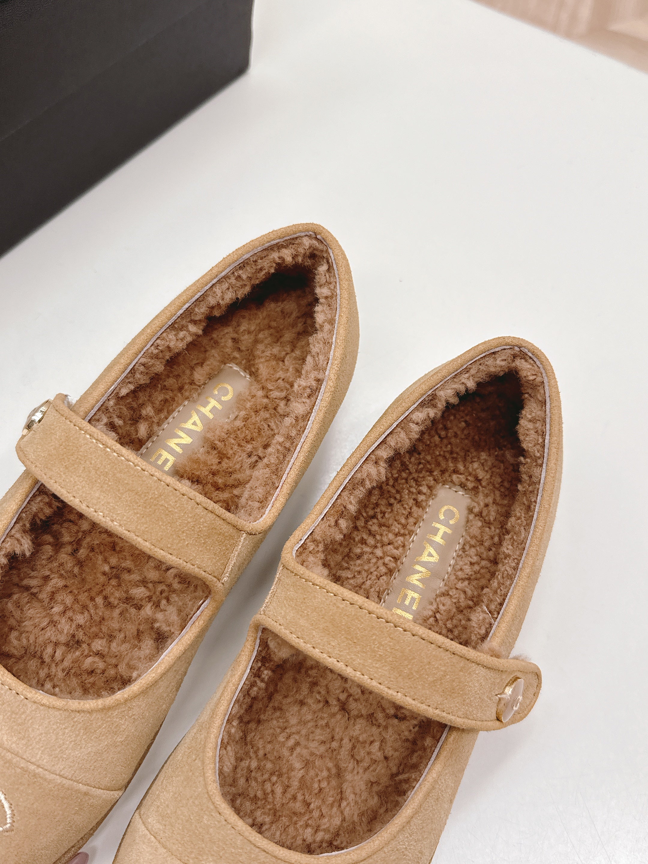 CHANEL FLAT MARY JANE SHOES 25S IN WARM BEIGE VELVET