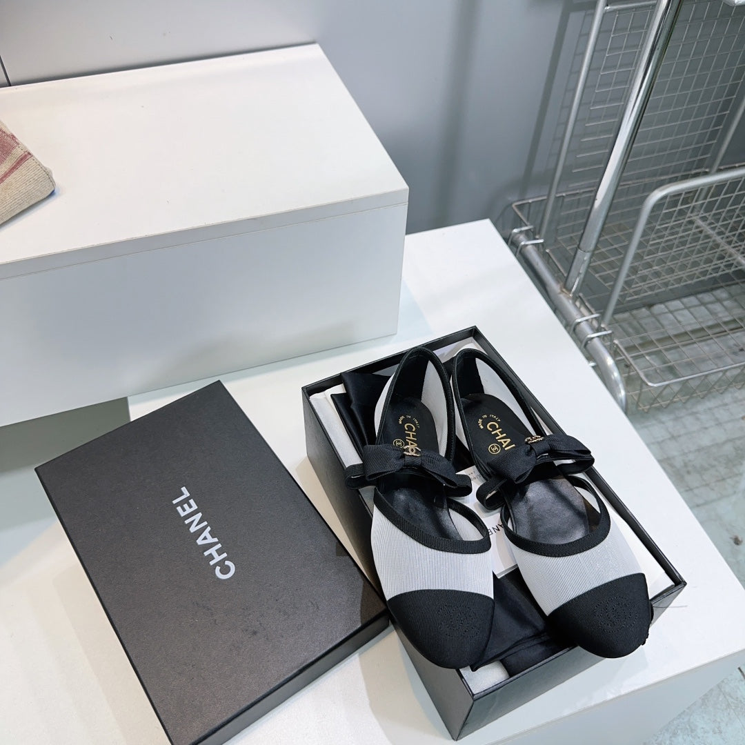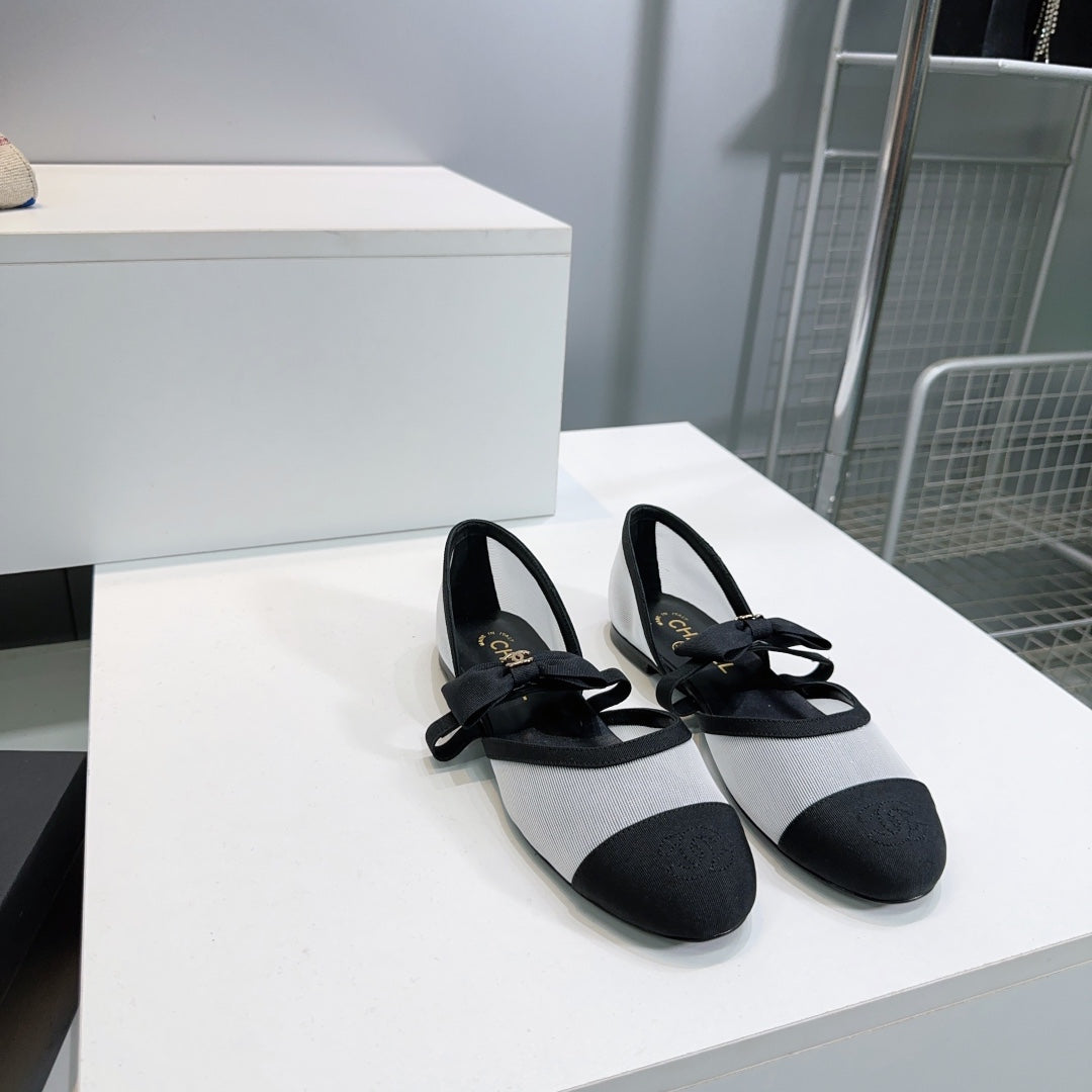 CHANEL FLAT MARY JANE SHOES 25S IN WHITE MIX BLACK MESH FABRIC EMBOSSED LOGO WITH BOW