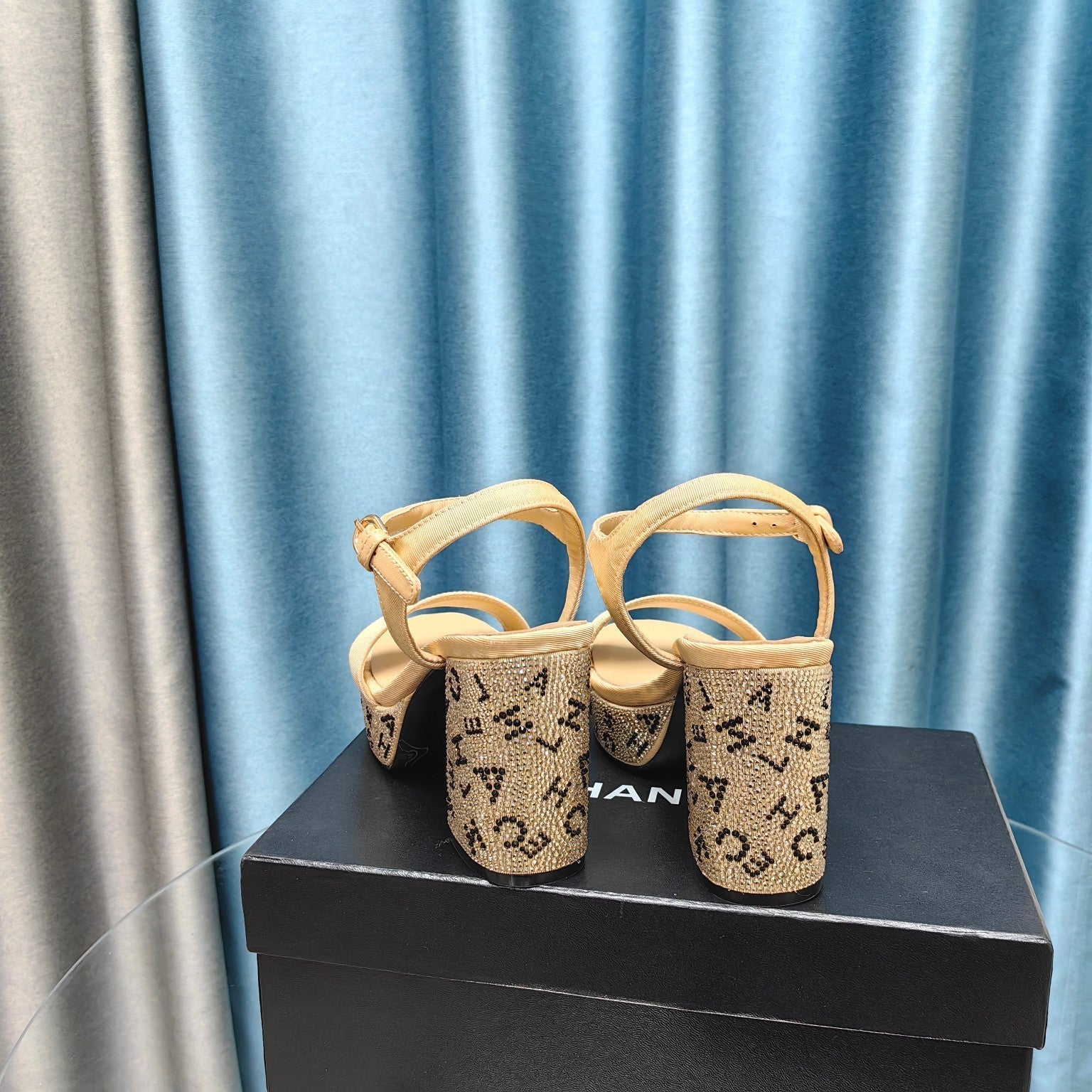 Chunky Heel Rhinestone High Sandals Beige Cream Lambskin