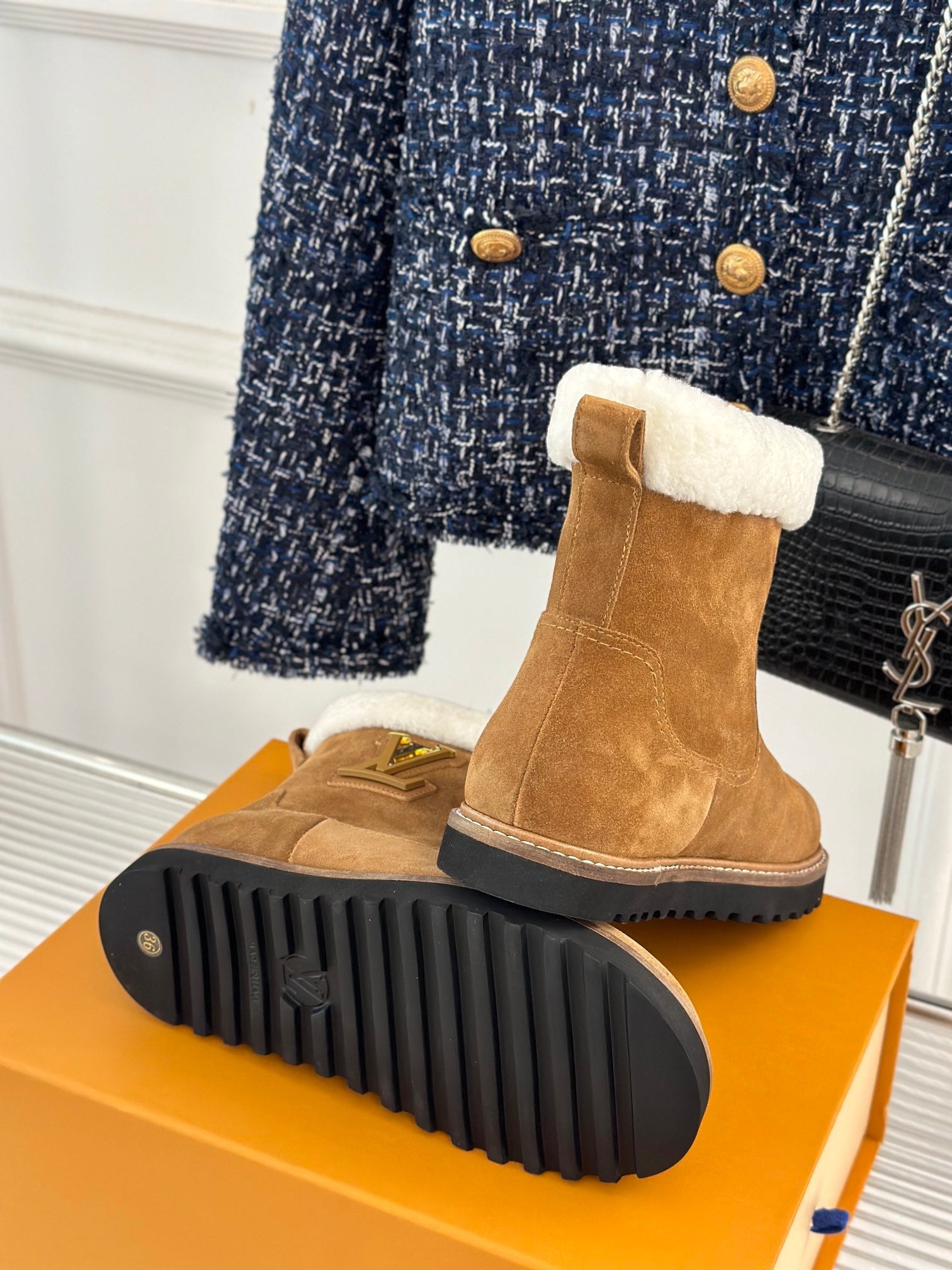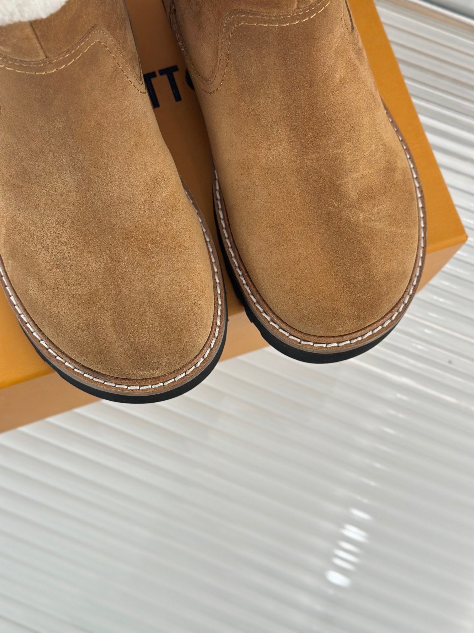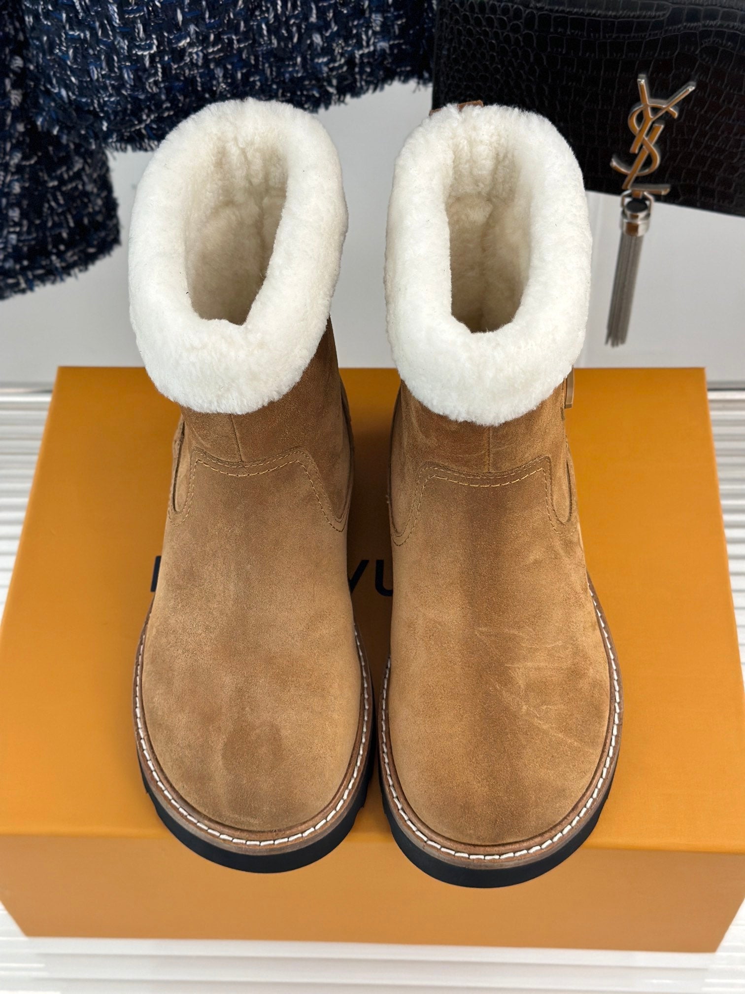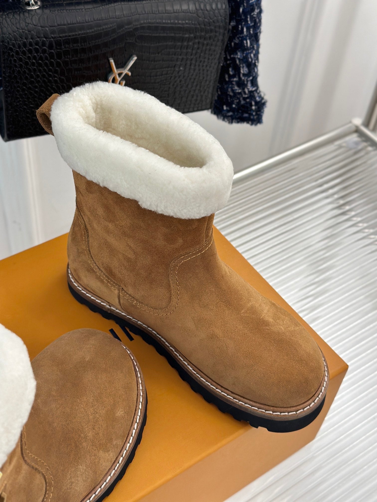CHUNKY SOLE SNOW BOOTS IN PEANUT BROWN SUEDE AND WHITE WOOL