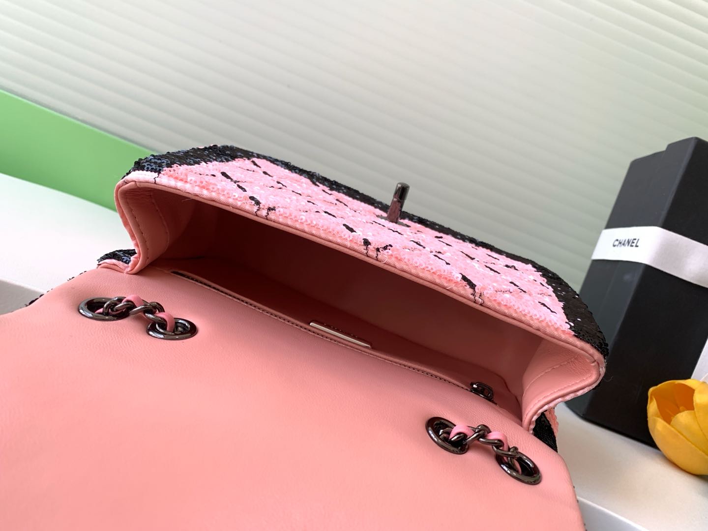 CLASSIC FLAP BAG 21 IN BLACK PINK SEQUINS RUTHENIUM HARDWARE