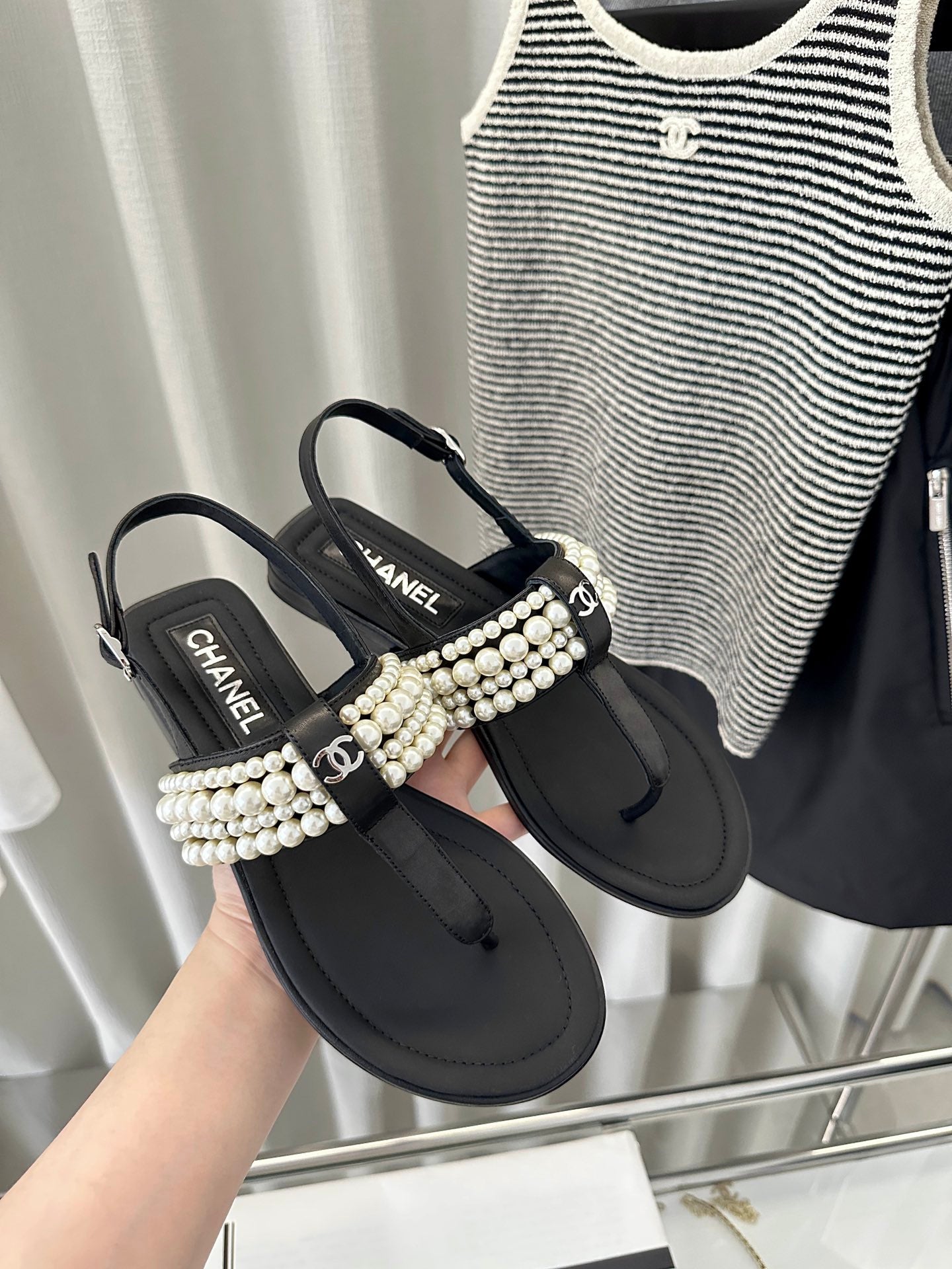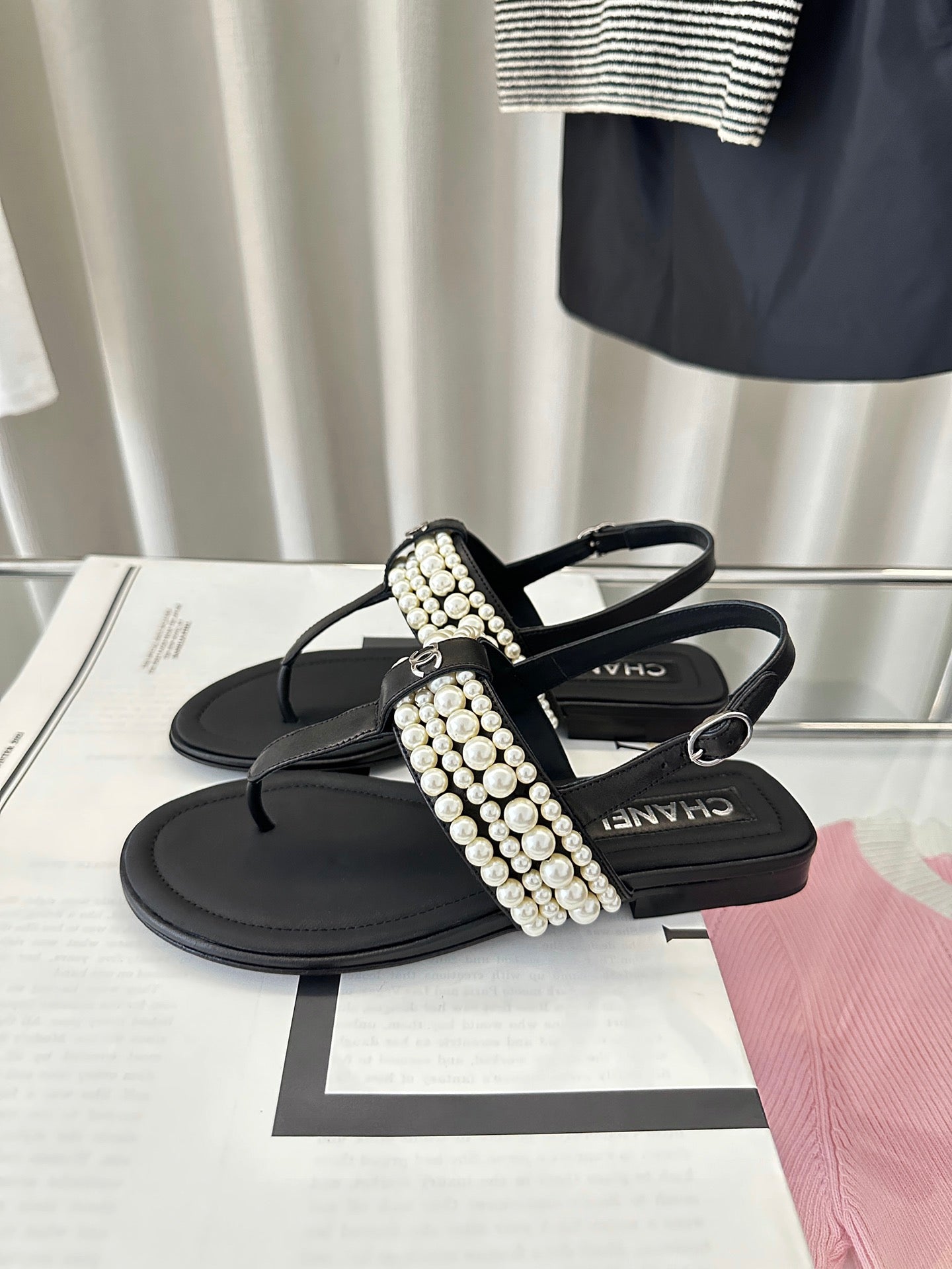 CLASSIC THONG SANDALS PEARL CHAIN IN BLACK LAMBSKIN