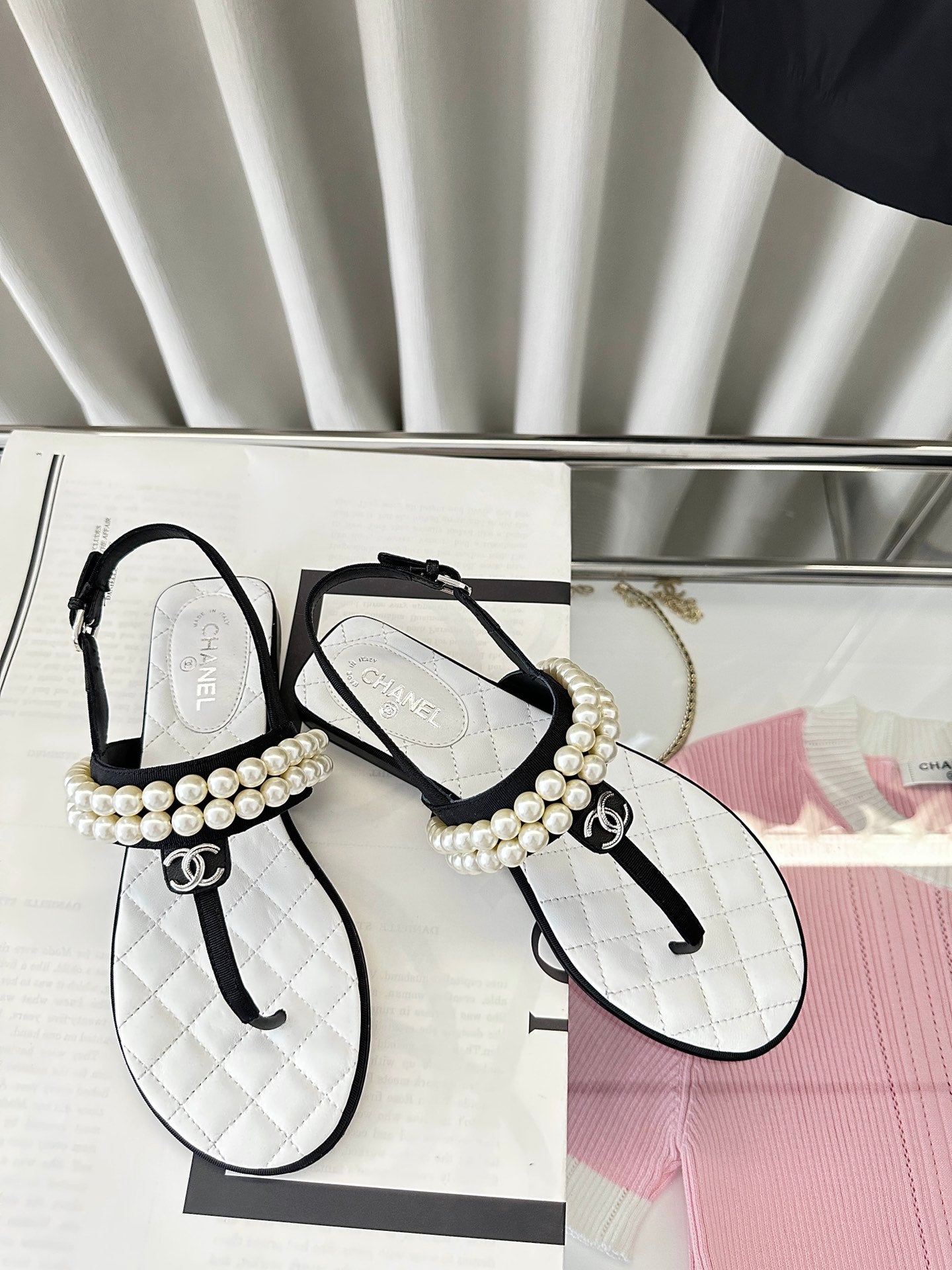 CLASSIC THONG SANDALS PEARL CHAIN IN WHITE LAMBSKIN