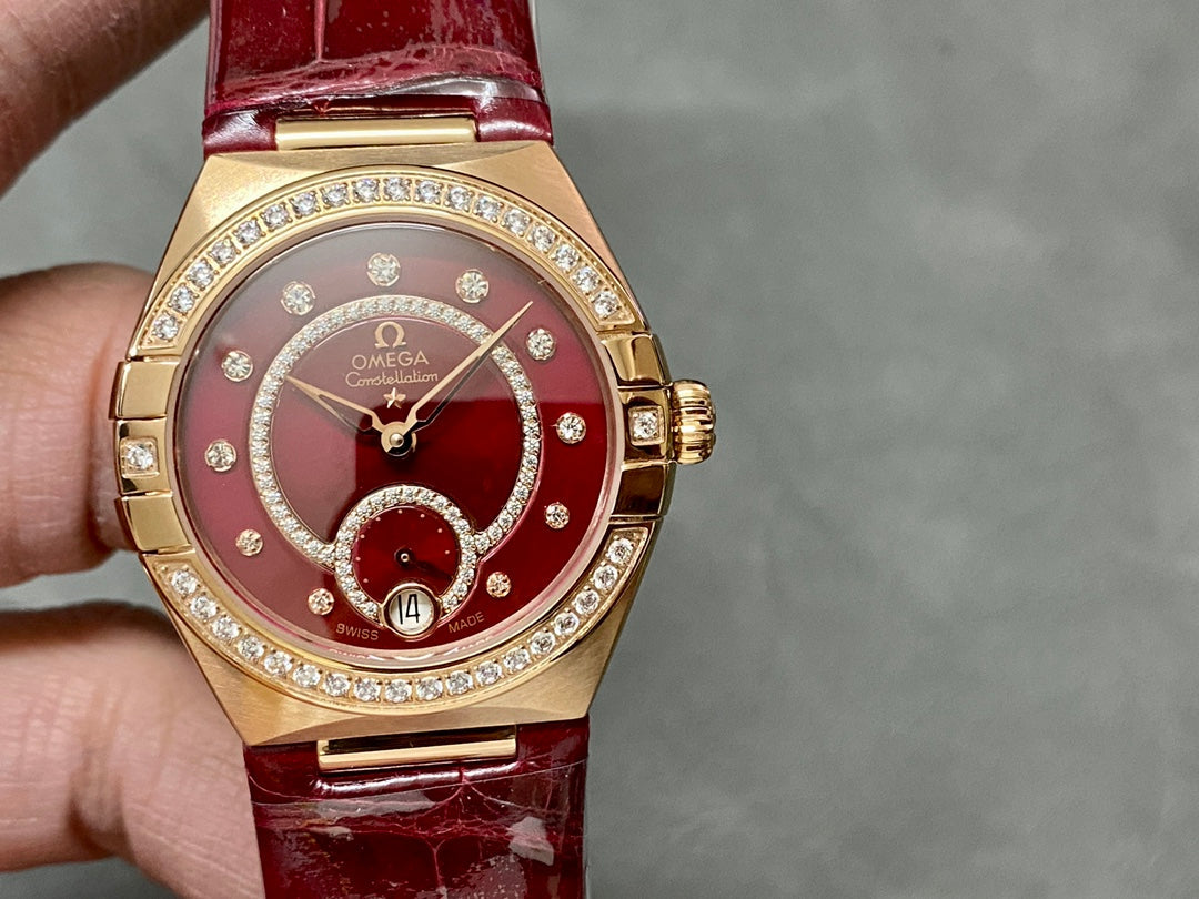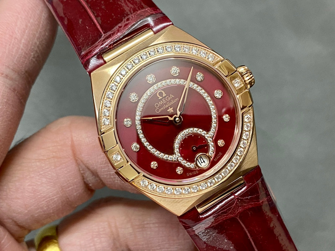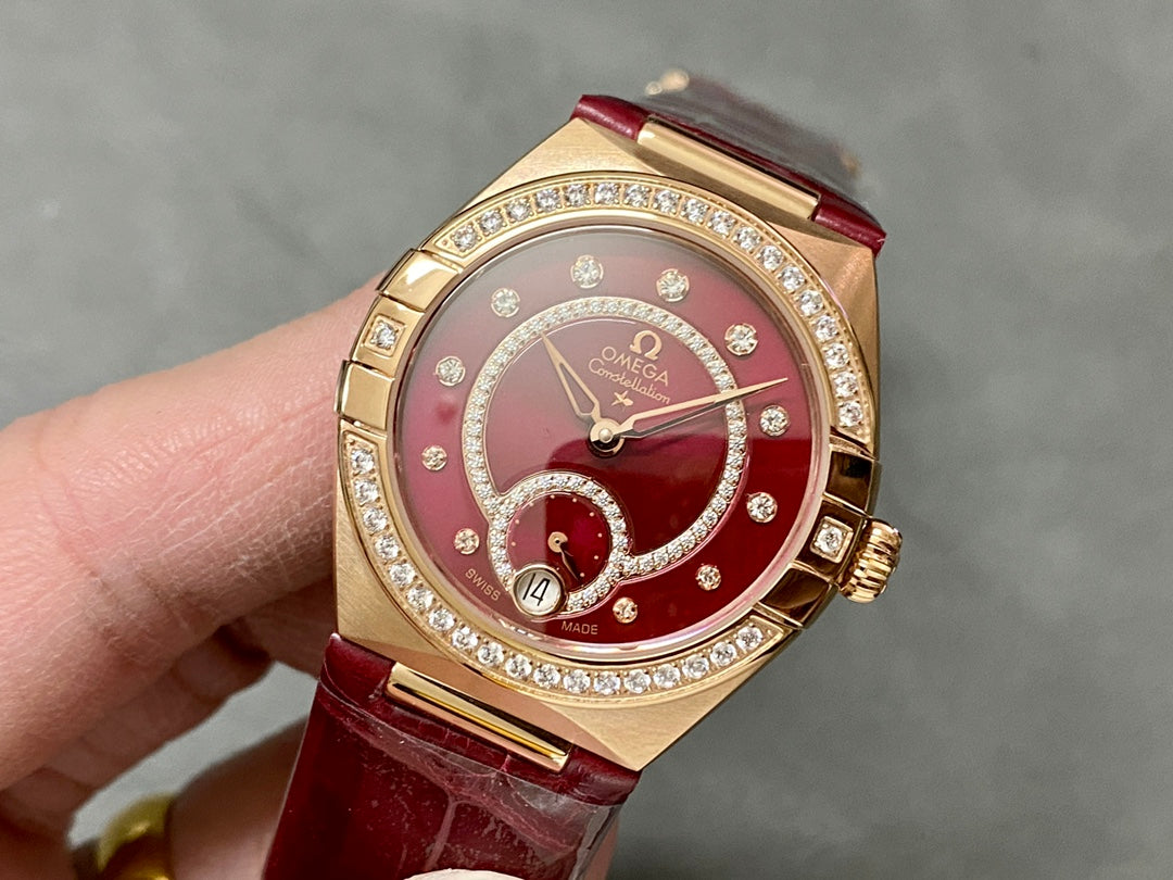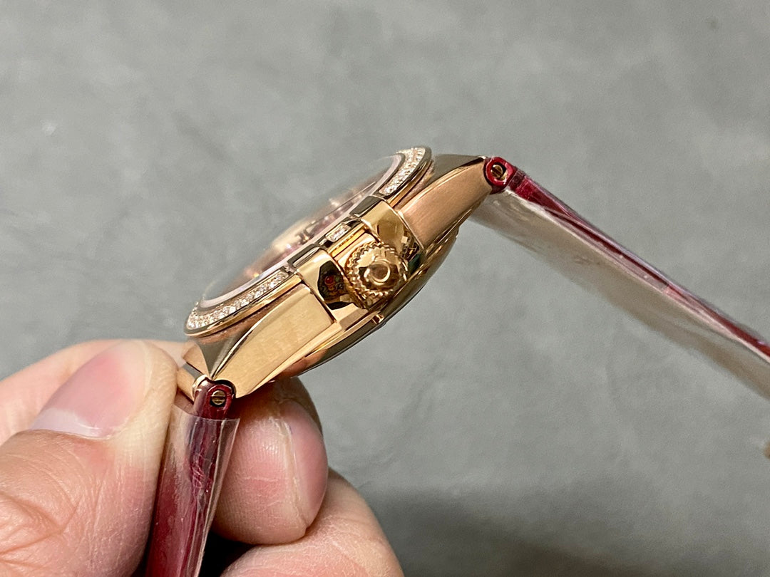 CONSTELLATION 34 MM WATCH ROSE GOLD CASE WITH WINE RED LEATHER STRAP
